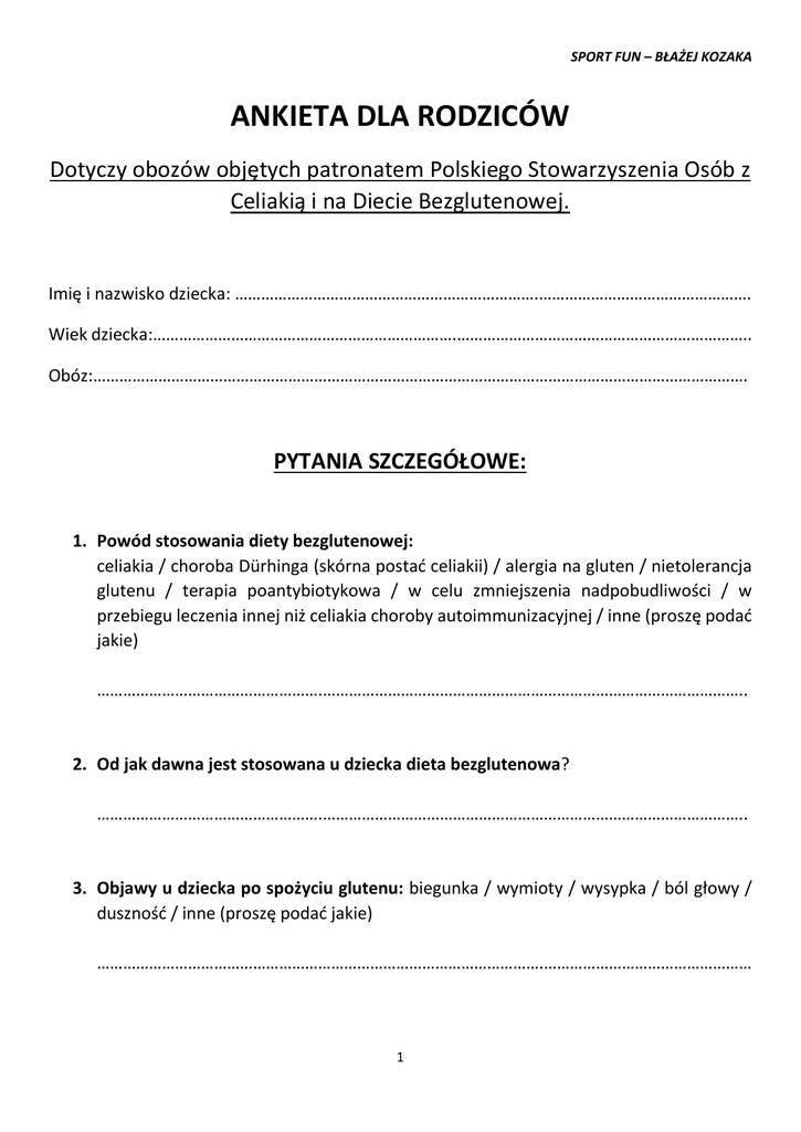 SPORT FUN – BŁAŻEJ KOZAKA ANKIETA DLA RODZICÓW Dotyczy obozów objętych patronatem Polskiego Stowarzyszenia Osób z Celiakią i na Diecie Bezglutenowej. Imię i nazwisko dziecka: …………………………………………………………….…………………………………………. Wiek dziecka:…………………………………………………………….………………………………………………………….. Obóz:……………………………………………………………………………………………………………………………………. PYTANIA SZCZEGÓŁOWE: 1. Powód stosowania diety bezglutenowej: celiakia / choroba Dürhinga (skórna postać celiakii) / alergia na gluten / nietolerancja glutenu / terapia poantybiotykowa / w celu zmniejszenia nadpobudliwości / w przebiegu leczenia innej niż celiakia choroby autoimmunizacyjnej / inne (proszę podać jakie) …………………………………………….…………………………………………………………………………………….. 2. Od jak dawna jest stosowana u dziecka dieta bezglutenowa? …………………………………………….…………………………………………………………………………………….. 3. Objawy u dziecka po spożyciu glutenu: biegunka / wymioty / wysypka / ból głowy / duszność / inne (proszę podać jakie) ………………………………………………………………………………………….………………………………………… 1 SPORT FUN – BŁAŻEJ KOZAKA 4. Czy dziecko korzysta z komunikantów niskoglutenowych? …………………………………………………………………………………………………………………………………… 5. Czy dziecku znana jest charakterystyka diety bezglutenowej i potrafi samodzielnie ocenić, czy może spożyć dany produkt? …………………………………………………………..……………………………………………………………………… 6. Czy dziecko stosuje dietę bezmleczną lub z ograniczeniem produktów mlecznych? …………………………………………………………………………………………………………………………………… 7. Przyczyna stosowania diety bezmlecznej: stwierdzona nietolerancja laktozy /nietolerancja laktozy w przebiegu niedawno wykrytej celiakii / alergia na białko mleka krowiego / samodzielna obserwacja samopoczucia dziecka po spożyciu pokarmów mlecznych / inny powód ……………………………………………………………….…………………………………………………………………… 8. Czy dziecku znana jest charakterystyka diety bezmlecznej i potrafi samodzielnie ocenić, czy może spożyć dany produkt? …………………………………………………………………………………………………………………………………… 9. Czy dziecko jest uczulone na inne produkty spożywcze i substancje zawarte w żywności (np. orzechy, seler, jaja kurze, jabłko, soję, kakao, truskawki, barwniki, konserwanty, skrobię pszenną bezglutenową)? …………………………………………………………………………………………………………………………………… 2 SPORT FUN – BŁAŻEJ KOZAKA 10.Alergeny, które wywołują reakcję u dziecka (proszę wymienić): …………………………………………………………………………………………………………………………………… 11.Czy dziecku znana jest charakterystyka diety eliminacyjnej i potrafi samodzielnie ocenić, czy może spożyć dany produkt? ………………………….………………………………………………………………………………………………………… 12.Czy dziecko kiedykolwiek przebyło wstrząs anafilaktyczny po spożyciu w/w alergenów? …………………………………………………………………………………………………………………………………… 13.Czy u dziecka obserwuje się zaburzenia czynności przewodu pokarmowego niezwiązane ze spożyciem produktów wykluczonych z diety oraz niebędące objawami infekcji? ……………………………………….…………………………………………………………………………………………… 14.Postępowanie u dziecka w razie złego samopoczucia związanego z zaburzeniami czynności przewodu pokarmowego i niezwiązanego ze spożyciem produktów wykluczonych z diety oraz nie będącego objawem infekcji: ………………………………………….………………………………………………………………………………………… 15.Czy dziecko cierpi na dodatkowe choroby (jakie): ……………………………………………………………………………………………………………………………………. 3 SPORT FUN – BŁAŻEJ KOZAKA 16.Dodatkowe informacje, które chcieliby Państwo przekazać dietetykowi proszę zamieścić tutaj: …………………………………………………………………………………………………………………… …………………………………………………………………………………………………………………… …………………………………………………………..…………………………………….………………… …………………………………………………………………………………………………………………... OŚWIADCZENIA Oświadczam, że w powyższej ankiecie zawarłem/am wszystkie informacje niezbędne do przeprowadzenia opieki dietetycznej oraz bezpiecznego przygotowania posiłków dla mojego dziecka ………………………………………………………
