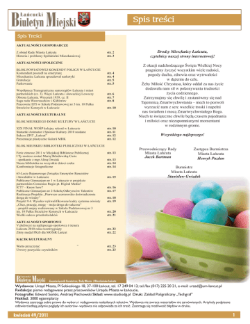 Spis treści Spis Treści AKTUALNOŚCI GOSPODARCZE Z obrad Rady Miasta Łańcuta Historia i problemy Spółdzielni Mieszkaniowej str. 2 str. 3 AKTUALNOŚCI SPOŁECZNE BLOK POWIATOWEJ KOMENDY POLICJI W ŁAŃCUCIE Komendant poszedł na emeryturę Mieszkaniec Łańcuta sprzedawał narkotyki Gratulacje Parkowanie Współpraca Transgraniczna samorządów Łańcuta i miast partnerskich (cz. 3). Więzi Łańcuta i słowackiej Lewoczy Obrona Łańcuta. Wrzesień 1939, cz. II Saga rodu Wawrzaszków i Küblerów Pracownie EFS w Szkole Podstawowej nr 3 im. 10 Pułku Strzelców Konnych w Łańcucie str. 4 str. 4 str. 5 str. 5 str. 6 str. 7 str. 8 str. 10 AKTUALNOŚCI KULTURALNE BLOK MIEJSKIEGO DOMU KULTURY W ŁAŃCUCIE XIX FINAŁ WOŚP kolejny rekord w Łańcucie Statuetki Animator i Sponsor Kultury 2010 rozdane Sukces ZPiT ,,Łańcut” Prezentacje plastyczne Galerii MDK str. 10 str. 11 str. 12 str. 12 BLOK MIEJSKIEJ BIBLIOTEKI PUBLICZNEJ W ŁAŃCUCIE Ferie zimowe 2011 w Miejskiej Bibliotece Publicznej I Ty możesz zostać Marią Skłodowską-Curie - spotkanie z mgr Aliną Owsiak Nasza biblioteka na wszystkie dzieci czeka Konfrontacje fotograficzne str. 13 str. 13 str. 14 str. 14 65-Lecie Rejonowego Związku Emerytów Rencistów i Inwalidów w Łańcucie Publiczne Gimnazjum nr 1 w Łańcucie w projekcie partnerskim Comenius Regio pt. Digital Media? ICT? – Know how? Publiczne Gimnazjum nr 2 Szkołą Odkrywców Talentów Realizacja Projektu „Pierwsze uczniowskie doświadczenia drogą do wiedzy” Projekt 9.4. Wysoko wykwalifikowane kadry systemu oświaty ,,Chce, pracuję, mogę – moja droga do sukcesu” - projekt unijny realizowany w Szkole Podstawowej nr 3 im. 10 Pułku Strzelców Konnych w Łańcucie Wielki sukces przedszkolaków str. 20 str. 21 AKTUALNOŚCI SPORTOWE V plebiscyt na najlepszego sportowca i trenera Łańcuta 2010 roku rozstrzygnięty Złoty medal PKiS dla MOSiR Łańcut str. 22 str. 22 str. 15 Drodzy Mieszkańcy Łańcuta, czytelnicy naszej strony internetowej! Z okazji nadchodzącego Święta Wielkiej Nocy pragniemy życzyć wszystkim wiele radości, pogody ducha, zdrowia oraz wytrwałości w dążeniu do celu. Żeby Miłość Chrystusa, który oddał za nas życie dodawała nam sił w pokonywaniu trudności życia codziennego. Zatrzymajmy się chwilę i zastanówmy się nad Tajemnicą Zmartwychwstania – niech to pozwoli wyrzucić nam z serc wszelkie troski i napełni nas światłem i mocą Zmartwychwstałego Boga. Niech te świąteczne chwile będą czasem pojednania i miłości oraz niezapomnianymi momentami w rodzinnym gronie. Wszystkiego najlepszego! Przewodniczący Rady Miasta Łańcuta Jacek Bartman Zastępca Burmistrza Miasta Łańcuta Henryk Pazdan Burmistrz Miasta Łańcuta Stanisław Gwizdak str. 16 str. 17 str. 18 str. 19 KĄCIK KULTURALNY Warto przeczytać Utwory poetyckie czytelników ” str. 23 str. 23 Wydawca: Urz¹d Miasta, Pl Sobieskiego 18, 37-100 £añcut, tel. 17 249 04 13; tel./fax (017) 225 20 21, e-mail: [email protected] Redakcja: pismo redagowane przez pracowników Urzêdu Miasta w £añcucie, Fotografie: Edward Soński, Andrzej Piechowski Sk³ad: www.studiodg.pl Druk: Zak³ad Poligraficzny „Techgraf” Nak³ad: 3000 egzemplarzy Wydawca zastrzega sobie prawo do wyboru i redagowania nades³anych tekstów. Wydawca nie zwraca materia³ów nie zamówionych. Artyku³y podpisane odzwierciedlaj¹ jedynie pogl¹dy ich autorów- wydawca nie odpowiada za ich treœæ. Zastrzega siê mo¿liwoœæ b³êdów w druku. kwiecieñ 49/2011 1 Aktualności gospodarcze Z obrad Rady Miasta Łańcuta Z obrad V Sesji Rady Miejskiej w Łańcucie odbytej w dniu 24 lutego 2011 r. Na V Sesji Rada Miejska w Łańcucie podjęła następujące uchwały: Uchwała Nr V/24/2011 w sprawie uchwalenia wieloletniej prognozy finansowej Miasta Łańcuta Rada Miasta uchwaliła wieloletnia prognozę finansową miasta Łańcuta, która ma na celu ocenę przyszłej sytuacji finansowej miasta Łańcuta pod kątem: 1) możliwości inwestycyjnych, 2) zdolności kredytowej. Wieloletnia Prognoza Finansowa Miasta Łańcuta została sporządzona w szczegółowości określonej w art. 226 ustawy o finansach publicznych na okres 2011 – 2020 r. tj. na okres, na który zaciągnięto zobowiązania. Uchwała Nr V/25/2011 w sprawie określenia zasad udzielania dotacji z budżetu Miasta Łańcuta na dofinansowanie prac konserwatorskich, restauratorskich lub robót budowlanych przy zabytku wpisanym do rejestru zabytków Rada Miasta uchwaliła zasady udzielania dotacji z budżetu Miasta Łańcuta na dofinansowanie prac konserwatorskich, restauratorskich lub robót budowlanych przy zabytku wpisanym do rejestru zabytków. Uchwalony dokument określa: 1) warunki ubiegania się o dotację na dofinansowanie prac konserwatorskich, restauratorskich i robót budowlanych przy zabytku wpisanym do rejestru zabytków, 2) rodzaj danych i informacji, które należy zawrzeć we wniosku o dotację, 3) tryb postępowania z wnioskiem o udzielenie dotacji, 4) postanowienia, jakie powinna zawierać umowa o udzielenie dotacji, 5) zasady rozliczania dotacji, sposobu kontroli wykonywania zadania i terminy zwrotu dotacji do budżetu Miasta Łańcuta. 2 Uchwała Nr V/26/2011 w sprawie budżetu miasta Łańcuta na rok 2011 Rada Miasta uchwaliła budżet miasta Łańcuta na rok 2011. Ustalono dochody budżetu w łącznej kwocie 46.148.550 zł, w tym: a) dochody bieżące 40.549.484 zł, b) dochody majątkowe 5.599.066 zł oraz wydatki w łącznej kwocie 51.708.550 zł, w tym: a) wydatki bieżące 40.532.568 zł; b) wydatki majątkowe 11.175.982 zł Uchwała Nr V/27/2011 w sprawie przyjęcia przez Gminę Miasta Łańcuta Programu Ochrony Środowiska oraz Planu Gospodarki Odpadami na lata 20092012 z perspektywą na lata 2013-2016 Rada Miasta uchwaliła Program Ochrony Środowiska oraz Plan Gospodarki Odpadami dla Gminy Miasta Łańcuta na lata 2009 – 2012 z perspektywą na lata 2013 -2016. Gminny plan jest częścią programu ochro