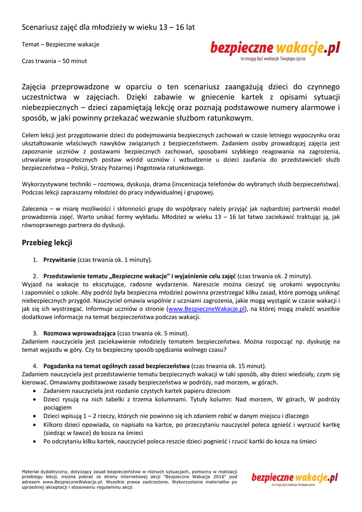Scenariusz zajęć dla młodzieży w wieku 13 – 16 lat Temat – Bezpieczne wakacje Czas trwania – 50 minut Zajęcia przeprowadzone w oparciu o ten scenariusz zaangażują dzieci do czynnego uczestnictwa w zajęciach. Dzięki zabawie w gniecenie kartek z opisami sytuacji niebezpiecznych – dzieci zapamiętają lekcję oraz poznają podstawowe numery alarmowe i sposób, w jaki powinny przekazać wezwanie służbom ratunkowym. Celem lekcji jest przygotowanie dzieci do podejmowania bezpiecznych zachowań w czasie letniego wypoczynku oraz ukształtowanie właściwych nawyków związanych z bezpieczeństwem. Zadaniem osoby prowadzącej zajęcia jest zapoznanie uczniów z postawami bezpiecznych zachowań, sposobami szybkiego reagowania na zagrożenia, utrwalanie prospołecznych postaw wśród uczniów i wzbudzenie u dzieci zaufania do przedstawicieli służb bezpieczeństwa – Policji, Straży Pożarnej i Pogotowia ratunkowego. Wykorzystywane techniki – rozmowa, dyskusja, drama (inscenizacja telefonów do wybranych służb bezpieczeństwa). Podczas lekcji zapraszamy młodzież do pracy indywidualnej i grupowej. Zalecenia – w miarę możliwości i skłonności grupy do współpracy należy przyjąć jak najbardziej partnerski model prowadzenia zajęć. Warto unikać formy wykładu. Młodzież w wieku 13 – 16 lat łatwo zaciekawić traktując ją, jak równoprawnego partnera do dyskusji. Przebieg lekcji 1. Przywitanie (czas trwania ok. 1 minuty). 2. Przedstawienie tematu „Bezpieczne wakacje” i wyjaśnienie celu zajęć (czas trwania ok. 2 minuty). Wyjazd na wakacje to ekscytujące, radosne wydarzenie. Nareszcie można cieszyć się urokami wypoczynku i zapomnieć o szkole. Aby podróż była bezpieczna młodzież powinna przestrzegać kilku zasad, które pomogą uniknąć niebezpiecznych przygód. Nauczyciel omawia wspólnie z uczniami zagrożenia, jakie mogą wystąpić w czasie wakacji i jak się ich wystrzegać. Informuje uczniów o stronie (www.BezpieczneWakacje.pl), na której mogą znaleźć wszelkie dodatkowe informacje na temat bezpieczeństwa podczas wakacji. 3. Rozmowa wprowadzająca (czas trwania ok. 5 minut). Zadaniem nauczyciela jest zaciekawienie młodzieży tematem bezpieczeństwa. Można rozpocząć np. dyskusję na temat wyjazdu w góry. Czy to bezpieczny sposób spędzania wolnego czasu? 4. Pogadanka na temat ogólnych zasad bezpieczeństwa (czas trwania ok. 15 minut). Zadaniem nauczyciela jest przedstawienie tematu bezpiecznych wakacji w taki sposób, aby dzieci wiedziały, czym się kierować. Omawiamy podstawowe zasady bezpieczeństwa w podróży, nad morzem, w górach. Zadaniem nauczyciela jest rozdanie czystych kartek papieru dzieciom Dzieci rysują na nich tabelki z trzema kolumnami. Tytuły kolumn: Nad morzem, W górach, W podróży pociągiem Dzieci wpisują 1 – 2 rzeczy, których nie powinno się ich zdaniem robić w danym miejscu i dlaczego Kilkoro dzieci opowiada, co napisało na kartce, po przeczytaniu nauczyciel poleca zgnieść i wyrzucić kartkę (siedząc w ławce) do kosza na śmieci Po odczytaniu kilku kartek, nauczyciel poleca reszcie dzieci pognieść i rzucić kartki do kosza na śmieci Materiał dydaktyczny, dotyczący zasad bezpieczeństwa w różnych sytuacjach, pomocny w realizacji przebiegu lekcji, można pobrać ze strony internetowej akcji "Bezpieczne Wakacje 2016" pod adresem www.BezpieczneWakacje.pl. Wszelkie prawa zastrzeżone. Wykorzystanie materiałów po uprzedniej akceptacji i stosowaniu regulaminu akcji. Po wyrzuceniu wszystkich kartek nauczyciel (lub jeden z uczniów) wypisuje na tablicy pozytywne zachowania w wyżej wymienionych sytuacjach [pomoc dla nauczyciela] 5. Nauczyciel pisze na tablicy numery telefonów 997, 998, 999, 112, 985 (numer alarmowy w górach) prosi o przypisanie właściwych służb poszczególnym numerom (czas trwania ok. 2 minut). 6. Rozmowa o prawidłowym sposobie wzywania pomocy (czas trwania ok. 5 minut). Zadaniem prowadzącego jest przekazanie młodzieży, jakie informacje powinny się znaleźć w meldunku na Policję, Straż Pożarną i Pogotowie ratunkowe – np. meldunek powinien zawierać miejsce wypadku, rodzaj wypadku, liczbę poszkodowanych i określenie ich ogólnego stanu, informacje o udzielonej dotychczas pomocy oraz nazwisko i adres zgłaszającego. 7. [opcjonalnie] Wychowawca prosi dzieci o wyciągnięcie zeszytów, kartek, na których dzieci będą mogły pracować. (Czas trwania ok. 15 minut) Wychowawca przedstawia dzieciom poszczególne etapy pracy: dzieci ustawiają kartkę papieru A4 poziomo uczniowie piszą z prawej strony kartki słowo Wakacje (przy słowie Wakacje, prosimy dzieci o wypisanie zagrożeń, jakie kojarzą im się z wakacjami. Jedna z liter skojarzenia musi pasować do litery z hasła. Np. kradzież − litera „a” ze słowa kradzież, pasuje do litery „a” ze słowa wakacje) dzieci piszą na środku słowo Bezpieczne − tak, żeby utworzyła się ciągłość: BezpieczneWakacje (przy słowie Bezpieczne, prosimy dzieci o wypisanie słów, które kojarzą się z zachowaniem bezpieczeństwa. Jedna z liter skojarzenia musi pasować do litery z hasła. Np. ICE − litera „e” ze słowa ICE, pasuje do litery „e” ze słowa bezpieczne) na końcu zabawy, nauczyciel prosi dzieci o napisanie z lewej strony kartki słowo Moje − tak, żeby utworzyła się ciągłość: MojeBezpieczneWakacje (przy słowie Moje, dzieci wypisują słowa, które kojarzą się z nadchodzącymi wakacjami. Jedna z liter skojarzenia musi pasować do litery z hasła. Np. morze − litera „m” ze słowa morze, pasuje do litery „m” ze słowa moje) Wszystkie słowa MojeBezpieczneWakacje muszą tworzyć ciągłość. Po wypełnieniu „krzyżówki”, nauczyciel pyta ochotników, lub wybiera samemu 3 uczniów − wspólnie odczytują i omawiają skojarzenia dzieci w celu podsumowania i podkreślenia bezpiecznych zachowań. 8. Podsumowanie zajęć i powtórzenie najważniejszych inform