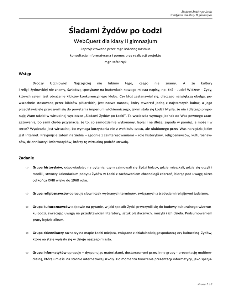 Śladami Żydów po Łodzi WebQuest dla klasy II gimnazjum Śladami Żydów po Łodzi WebQuest dla klasy II gimnazjum Zaprojektowane przez mgr Bożennę Rasmus konsultacja informatyczna i pomoc przy realizacji projektu mgr Rafał Nyk Wstęp Drodzy Uczniowie! Najczęściej nie lubimy tego, czego nie znamy. A że kultury i religii żydowskiej nie znamy, świadczą spotykane na budowlach naszego miasta napisy, np. ŁKS – Jude! Widzew – Żydy, których celem jest obrażenie kibiców konkurencyjnego klubu. Czy ktoś zastanawiał się, dlaczego największą obelgą, powszechnie stosowaną przez kibiców piłkarskich, jest nazwa narodu, który stworzył jedną z najstarszych kultur, a jego przedstawiciele przyczynili się do powstania imperium włókienniczego, jakim stała się Łódź? Myślę, że nie i dlatego proponuję Wam udział w wirtualnej wycieczce „Śladami Żydów po Łodzi”. Ta wycieczka wymaga jednak od Was pewnego zaangażowania, bo sami chyba przyznacie, że to, co samodzielnie wykonamy, lepiej i na dłużej zapada w pamięć, a może i w serce? Wycieczka jest wirtualna, bo wymaga korzystania nie z wehikułu czasu, ale ulubionego przez Was narzędzia jakim jest Internet. Przyjmijcie zatem na Siebie – zgodnie z zainteresowaniami – role historyków, religioznawców, kulturoznawców, dziennikarzy i informatyków, którzy tę wirtualną podróż utrwalą. Zadanie • Grupa historyków, odpowiadając na pytanie, czym zajmowali się Żydzi łódzcy, gdzie mieszkali, gdzie się uczyli i modlili, stworzy kalendarium pobytu Żydów w Łodzi z zachowaniem chronologii zdarzeń, biorąc pod uwagę okres od końca XVIII wieku do 1968 roku. • Grupa religioznawców opracuje słowniczek wybranych terminów, związanych z tradycjami religijnymi judaizmu. • Grupa kulturoznawców odpowie na pytanie, w jaki sposób Żydzi przyczynili się do budowy kulturalnego wizerunku Łodzi, zwracając uwagę na przedstawicieli literatury, sztuk plastycznych, muzyki i ich dzieła. Podsumowaniem pracy będzie album. • Grupa dziennikarzy zaznaczy na mapie Łodzi miejsca, związane z działalnością gospodarczą czy kulturalną Żydów, które na stałe wpisały się w dzieje naszego miasta. • Grupa informatyków opracuje – dysponując materiałami, dostarczonymi przez inne grupy - prezentację multimedialną, którą umieści na stronie internetowej szkoły. Do momentu tworzenia prezentacji informatycy, jako specja- strona 1 z 8 Śladami Żydów po Łodzi WebQuest dla klasy II gimnazjum liści od utrwalania tego, co ważne, będą uczestniczyć w pracach wybranej grupy (tak, by w każdej z nich był informatyk na etapie przetwarzania zebranych informacji). Proces Diaspora - to określenie rozproszenia jakiejś narodowości na obczyźnie, wśród innych narodów. Diasporze żydowskiej dały początek rzymskie wyprawy, zakończone zdobyciem i zniszczeniem Jerozolimy oraz zburzeniem Drugiej Świątyni (było to w 70 r. n.e.), której jedyna ocalała ściana stała się największym żydowskim sanktuarium, obecnie zwanym Ścianą Płaczu. Żydzi rozpoczęli wędrówki w poszukiwaniu azylu, chleba, dachu nad głową, a przede wszystkim tolerancji i wolności wyznawania swojej wiary. Drogi wygnańców prowadziły przez kraje Azji Małej, Afryki Północnej, przez imperium rzymskie i ziemie późniejszej Europy, jak Hiszpania, Francja, Niemcy, Anglia, aż po Ruś i Polskę. W historii żydowskiej diaspory szczególne miejsce zajmują tysiącletnie dzieje Żydów w Polsce. W ciągu wieków w świecie ogarniętym wstrząsami społecznymi, religijnymi, nietolerancją i fanatyzmem prześladowani Żydzi znajdowali azyl na ziemiach polskich. Tu rozwijało się ich wielostronne, duchowe i materialne życie, tu kwitły nauka i kultura promieniujące na ośrodki żydowskie wielu krajów. Liczniejszy napływ Żydów do Polski datuje się na okres XII-XV w., co było m.in. konsekwencją wojen, wypraw krzyżowych, działalności inkwizycji i prześladowań w krajach Europy Zachodniej. Na ziemiach polskich, potrzebujących cennych inicjatyw i fachowców, rzemieślników, kupców, a nawet, cieszących się sławą w Europie, lekarzy żydowskich, znaleźli oni azyl, tolerancję i opiekę władców, m.in. Bolesława Pobożnego, a później Kazimierza Wielkiego i innych królów. Z biegiem czasu na ziemiach polskich rozwijały się wszelkie formy żydowskiego życia społecznego, gospodarczego i kulturalnego. Obok średnio zamożnej klasy mieszczańskiej i żyjących w biedzie, wyłoniła się grupa żydowskiej burżuazji czyli bogatych przedsiębiorców w dziedzinie handlu, przemysłu, bankowości. Pod koniec XIX wieku na ziemiach polskich żyło ponad 2,1 miliona Żydów, a we wrześniu 1939r. już 3,3 miliona Żydów, czyli 10% ludności kraju. Bardzo dużo łączyło polskich i żydowskich łodzian, którzy budowali wspólne miasto - włókienniczą metropolię. Dziś w Łodzi żyjemy wśród zabytków, chodzimy po ulicach, które niegdyś kwitły handlem, a w czasie wojny zostały przekształcone w Litzmannstadt Ghetto. 1. Grupa historyków - zbada, czym zajmowali się Żydzi łódzcy, gdzie mieszkali, gdzie się uczyli i modlili i jak odnaleźli się wśród łódzkiej społeczności. Tworząc kalendarium pobytu Żydów w Łodzi, zwróćcie szczególną uwagę na okres od końca XVIII wieku do 1968 r.. Szczególnie pomocne w Waszych badaniach mogą okazać się następujące strony internetowe: - http://cityoflodz.pl/index.php?str=92 - http://www.jewishinstitute.org.pl/pl/home/historia/1.html - http://www.jewishmuseum.org.pl//articles.php?miId=138&lang=pl - http://www.lodzjews.org/root/form/pl/dzieje-zydow/index.asp strona 2 z 8 Śladami Żydów po Łodzi WebQuest dla klasy II gimnazjum - http://www.sztetl.org.pl/?a=showCity&action=view&cat_id=5&city_id=559&lang=pl_PL - http://www.sztetl.org.pl/?a=showCity&action=view&cat_id=3&city_id=559&lang=pl_PL Nie zapominajcie także o źródłach tradycyjnych, zgroma