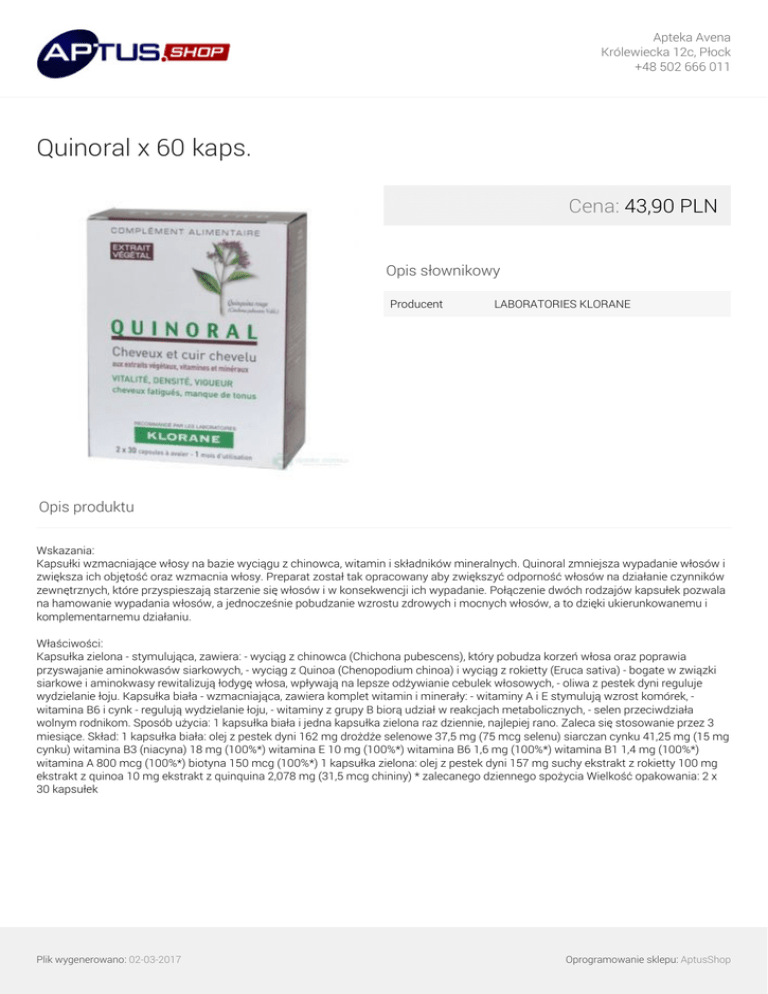 Apteka Avena Królewiecka 12c, Płock +48 502 666 011 Quinoral x 60 kaps. Cena: 43,90 PLN Opis słownikowy Producent LABORATORIES KLORANE Opis produktu Wskazania: Kapsułki wzmacniające włosy na bazie wyciągu z chinowca, witamin i składników mineralnych. Quinoral zmniejsza wypadanie włosów i zwiększa ich objętość oraz wzmacnia włosy. Preparat został tak opracowany aby zwiększyć odporność włosów na działanie czynników zewnętrznych, które przyspieszają starzenie się włosów i w konsekwencji ich wypadanie. Połączenie dwóch rodzajów kapsułek pozwala na hamowanie wypadania włosów, a jednocześnie pobudzanie wzrostu zdrowych i mocnych włosów, a to dzięki ukierunkowanemu i komplementarnemu działaniu. Właściwości: Kapsułka zielona - stymulująca, zawiera: - wyciąg z chinowca (Chichona pubescens), który pobudza korzeń włosa oraz poprawia przyswajanie aminokwasów siarkowych, - wyciąg z Quinoa (Chenopodium chinoa) i wyciąg z rokietty (Eruca sativa) - bogate w związki siarkowe i aminokwasy rewitalizują łodygę włosa, wpływają na lepsze odżywianie cebulek włosowych, - oliwa z pestek dyni reguluje wydzielanie łoju. Kapsułka biała - wzmacniająca, zawiera komplet witamin i minerały: - witaminy A i E stymulują wzrost komórek, witamina B6 i cynk - regulują wydzielanie łoju, - witaminy z grupy B biorą udział w reakcjach metabolicznych, - selen przeciwdziała wolnym rodnikom. Sposób użycia: 1 kapsułka biała i jedna kapsułka zielona raz dziennie, najlepiej rano. Zaleca się stosowanie przez 3 miesiące. Skład: 1 kapsułka biała: olej z pestek dyni 162 mg drożdże selenowe 37,5 mg (75 mcg selenu) siarczan cynku 41,25 mg (15 mg cynku) witamina B3 (niacyna) 18 mg (100%*) witamina E 10 mg (100%*) witamina B6 1,6 mg (100%*) witamina B1 1,4 mg (100%*) witamina A 800 mcg (100%*) biotyna 150 mcg (100%*) 1 kapsułka zielona: olej z pestek dyni 157 mg suchy ekstrakt z rokietty 100 mg ekstrakt z quinoa 10 mg ekstrakt z quinquina 2,078 mg (31,5 mcg chininy) * zalecanego dziennego spożycia Wielkość opakowania: 2 x 30 kapsułek Plik wygenerowano: 02-03-2017 Powered by TCPDF (www.tcpdf.org) Oprogramowanie sklepu: AptusShop