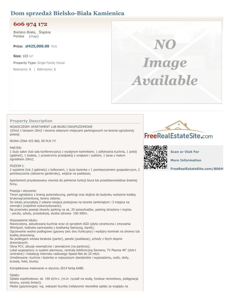 Dom sprzedaż Bielsko-Biała Kamienica 606 974 172 Bielsko-Biała, Śląskie Polska (map) Price: zł425,000.00 PLN Size: 103 m² Property Type: Single Family House Bedrooms: 1 | Bathrooms: 1 Property Description NOWOCZESNY APARTAMENT LUB BIURO DWUPOZIOMOWE 103m2 z tarasem 20m2 i dwoma własnymi miejscami parkingowymi na terenie ogrodzonej posesji. NOWA CENA 425 000, 00 PLN !!!! PARTER: 1 duży salon (lub sala konferencyjna) z wydajnym kominkiem, 1 półotwarta kuchnia, 1 pokój (gabinet), 1 toaleta, 1 przestronny przedpokój z wnękami i szafami, 1 taras z małym ogródkiem 20m2; POZIOM I: 2 sypialnie (lub 2 gabinety) z balkonami, 1 duża łazienka z 1 pomieszczeniem gospodarczym, 2 pomieszczenia (obszerne garderoby), wejście na poddasze; Apartament przystosowany również do pełnienia funkcji biura lub przedstawicielstwa średniej firmy. Posesja i otoczenie: Teren ogrodzony z bramą automatyczną, parkingi oraz dojścia do budynku wyłożone kostką brukową/cementową, tereny zielone; Do lokalu przynależą 2 własne miejsca postojowe na terenie zamkniętym i 3 miejsca na zewnątrz (wspólnie wykorzystywane); Na przeciwko posesji otwarty parking na ok. 20 samochodów, parking strzeżony i myjnia. - poczta, szkoły, przedszkola, służba zdrowia- 100-300m. Wyposażenie lokalu: Nowoczesna, zabudowana kuchnia wraz ze sprzętem AGD (płyta ceramiczna i zmywarka Whirlpool, lodówko-zamrażarka z kostkarką Samsung, barek); Ogrzewanie wodne podłogowe (gazowy piec dwu funkcyjny) i wydajny kominek na drewno lub kostkę drewnianą; Na podłogach włoska terakota (parter), panele (poddasze), schody z litych stopnic drewnianych; Okna PCV, żaluzje wewnętrzne i zewnętrzne (na parterze); Lokal wyposażony w system alarmowy, centralę telefoniczną Siemens, TV Plazma 40" (dvb-t centralne) i instalację internetu radiowego Speed-Net do 20 mb/s Umeblowane: kuchnia i łazienka w najwyższym standardzie i wyposażeniu, szafy, stoły, krzesła, fotel, biurka; Kompleksowe malowanie w styczniu 2014 farbą KABE. Opłaty: Opłata wspólnotowa: ok. 190 zł/m-c. (m.in. ryczałt na wodę, fundusz remontowy, pielęgnacja terenu, wywóz śmieci); Media (gaz/energia): wg. wskazań licznika (relatywnie niewielkie opłaty ze względu na Scan or Visit For More Information FreeRealEstateSite.com/800496 nowoczesny system grzewczy oraz lokalizację w centralnej części budynku); balkon strych ogródek dwupoziomowe miejsce parkingowe alarm telefon internet taras pomieszczenie użytkowe POLECAM I ZAPRASZAM DO PREZENTACJI! Treść niniejszego ogłoszenia nie stanowi oferty w rozumieniu Kodeksu Cywilnego. Wszelkie dane zawarte w opisie mogą nieznacznie odbiegać od stanu faktycznego. Pośrednik odpowiedzialny zawodowo za wykonanie umowy pośrednictwa: Wiesław Kuder (licencja nr: 3026) Oferta wysłana z systemu BCK Galactica Mieszko.my