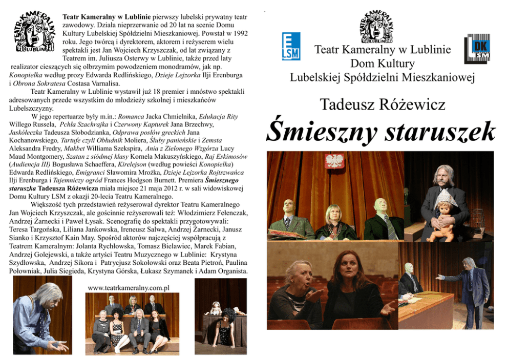 Teatr Kameralny w Lublinie pierwszy lubelski prywatny teatr zawodowy. Działa nieprzerwanie od 20 lat na scenie Domu Kultury Lubelskiej Spółdzielni Mieszkaniowej. Powstał w 1992 roku. Jego twórcą i dyrektorem, aktorem i reżyserem wielu spektakli jest Jan Wojciech Krzyszczak, od lat związany z Teatrem im. Juliusza Osterwy w Lublinie, także przed laty realizator cieszących się olbrzymim powodzeniem monodramów, jak np. Konopielka według prozy Edwarda Redlińskiego, Dzieje Lejzorka Ilji Erenburga i Obrona Sokratesa Costasa Varnalisa. Teatr Kameralny w Lublinie wystawił już 18 premier i mnóstwo spektakli adresowanych przede wszystkim do młodzieży szkolnej i mieszkańców Lubelszczyzny. W jego repertuarze były m.in.: Romanca Jacka Chmielnika, Edukacja Rity Willego Russela, Pchła Szachrajka i Czerwony Kapturek Jana Brzechwy, Jaskółeczka Tadeusza Słobodzianka, Odprawa posłów greckich Jana Kochanowskiego, Tartufe czyli Obłudnik Moliera, Śluby panieńskie i Zemsta Aleksandra Fredry, Makbet Williama Szekspira, Ania z Zielonego Wzgórza Lucy Maud Montgomery, Szatan z siódmej klasy Kornela Makuszyńskiego, Raj Eskimosów (Audiencja III) Bogusława Schaeffera, Kirelejson (według powieści Konopielka) Edwarda Redlińskiego, Emigranci Sławomira Mrożka, Dzieje Lejzorka Rojtszwańca Ilji Erenburga i Tajemniczy ogród Frances Hodgson Burnett. Premiera Śmiesznego staruszka Tadeusza Różewicza miała miejsce 21 maja 2012 r. w sali widowiskowej Domu Kultury LSM z okazji 20-lecia Teatru Kameralnego. Większość tych przedstawień reżyserował dyrektor Teatru Kameralnego Jan Wojciech Krzyszczak, ale gościnnie reżyserowali też: Włodzimierz Fełenczak, Andrzej Żarnecki i Paweł Łysak. Scenografię do spektakli przygotowywali: Teresa Targońska, Liliana Jankowska, Ireneusz Salwa, Andrzej Żarnecki, Janusz Sianko i Krzysztof Kain May. Spośród aktorów najczęściej współpracują z Teatrem Kameralnym: Jolanta Rychłowska, Tomasz Bielawiec, Marek Fabian, Andrzej Golejewski, a także artyści Teatru Muzycznego w Lublinie: Krystyna Szydłowska, Andrzej Sikora i Patrycjusz Sokołowski oraz Beata Pietroń, Paulina Połowniak, Julia Siegieda, Krystyna Górska, Łukasz Szymanek i Adam Organista. www.teatrkameralny.com.pl - Teatr Kameralny w Lublinie Dom Kultury Lubelskiej Spółdzielni Mieszkaniowej Tadeusz Różewicz Śmieszny staruszek Teatr Kameralny w Lublinie: Jak cierń Tadeusz Różewicz napisał „Śmiesznego staruszka” w 1963 roku i przypomnienie tego wydaje się istotne. Bowiem lata, które upłynęły od owego czasu oraz przemiany społeczne i obyczajowe, jakie zaszły w naszym kraju i w nas samych sprawiają, że inaczej dziś odczytujemy ów dramat, inaczej nań patrzymy. Wtedy ów tytułowy staruszek mógł rzeczywiście wydawać się śmieszny, dziwaczny, a opisana w sztuce sytuacja wręcz groteskowa. Dziś jednak, gdy obowiązuje wszechobecny kult młodości, a ludzie starzy spychani są już nawet nie na margines, lecz wręcz gdzieś jeszcze dalej, bohater sztuki jawi się nam jako postać bez mała tragiczna. Tym bardziej, że zdaje się nie rozumieć, o co właściwie jest oskarżany i za co postawiony przed sądem. Niejednoznaczny jest też nasz stosunek do niego. Z jednej strony możemy mu współczuć, bowiem samo życie podpowiada, jak łatwo dziś stać się ofiarą pomówień, nieuzasadnionych oskarżeń oraz prowokacji i jak złudne bywa poczucie prywatności. Z drugiej jednak towarzyszy nam wrażenie, iż być może rzeczywiście zbliżył się niebezpiecznie do cienkiej linii oddzielającej zachowania dopuszczalne od występku. Jan Wojciech Krzyszczak nie daje nam jednoznacznej odpowiedzi. Wyznacza publiczności rolę swego rodzaju ławy przysięgłych, która ma wydać werdykt. A każdy wchodzący w jej skład musi wcześniej rozważyć sprawę we własnym sumieniu. I nie będę udawał, że jest to proste. Długo po opadnięciu kurtyny zastanawiałem się nad tym, jak zagłosowałbym jako przysięgły i wciąż nie mam jeszcze stuprocentowej pewności. I to jest duży walor tej realizacji. Dobrze, że wciąż powstają spektakle, które nie ulatują ze świadomości natychmiast po zakończeniu, lecz tkwią w nas jak cierń. Również od strony artystycznej spektakl w pełni zadowala. Jan Wojciech Krzyszczak nie pozwala zapomnieć, że należy do elitarnego grona najlepszych polskich monodramistów. "Śmieszny staruszek" to bowiem w gruncie rzeczy monodram, czy - mówiąc inaczej - jeden długi monolog. Co prawda występują w nim inne postacie, że wspomnę o irytująco wiarygodnych Krystynie Szydłowskiej i Jolancie Deszcz-Pudzianowskiej czy imponującej ruchową sprawnością Julii Siegiedzie, ale ciężar spektaklu spoczywa jednak na postaci tytułowej. A Krzyszczak prowadzi ją wręcz znakomicie; świetnie oddając jej niejednoznaczność i nadzwyczaj umiejętnie różnicując nastroje. Przypomina - banalną skądinąd, ale zbyt często zapominaną prawdę - jak ważny w teatrze jest aktor. Także dlatego ten spektakl trzeba zobaczyć. Andrzej Z. Kowalczyk http://www.kurierlubelski.pl/ Teatr Kameralny w Lublinie pod dyrekcją Jana Wojciecha Krzyszczaka Dom Kultury Lubelskiej Spółdzielni Mieszkaniowej serdecznie zapraszają na spektakl Tadeusza Różewicza Śmieszny staruszek Obsada: Śmieszny staruszek - Jan Wojciech Krzyszczak Sędzia - Beata Pietroń Lalka - Julia Siegieda Baby - Krystyna Szydłowska, - Jolanta Deszcz-Pudzianowska Strażnik - Mariusz Budkowski Reżyseria: Jan Wojciech Krzyszczak Muzyka: Tomasz Kobiela Scenografia: Ireneusz Salwa Przedstawienie odbędzie się we wtorek 27 maja 2014 r. o godz. 18.00 w sali widowiskowej Domu Kultury LSM w Lublinie, ul. K. Wallenroda 4a, tel. 81 743 48 29 www.domkulturylsm.pl Wstęp wolny Spektakl przeznaczony dla osób powyżej 16 lat