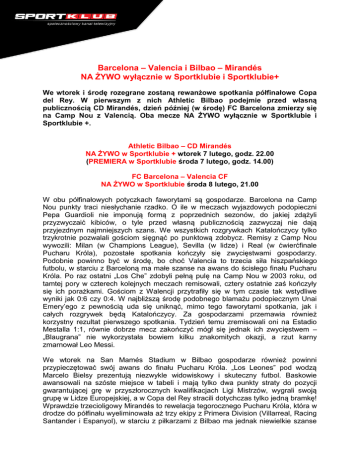 Barcelona – Valencia i Bilbao – Mirandés NA ŻYWO wyłącznie w Sportklubie i Sportklubie+ We wtorek i środę rozegrane zostaną rewanżowe spotkania półfinałowe Copa del Rey. W pierwszym z nich Athletic Bilbao podejmie przed własną publicznością CD Mirandés, dzień później (w środę) FC Barcelona zmierzy się na Camp Nou z Valencią. Oba mecze NA ŻYWO wyłącznie w Sportklubie i Sportklubie +. Athletic Bilbao – CD Mirandés NA ŻYWO w Sportklubie + wtorek 7 lutego, godz. 22.00 (PREMIERA w Sportklubie środa 7 lutego, godz. 14.00) FC Barcelona – Valencia CF NA ŻYWO w Sportklubie środa 8 lutego, 21.00 W obu półfinałowych potyczkach faworytami są gospodarze. Barcelona na Camp Nou punkty traci niesłychanie rzadko. O ile w meczach wyjazdowych podopieczni Pepa Guardioli nie imponują formą z poprzednich sezonów, do jakiej zdążyli przyzwyczaić kibiców, o tyle przed własną publicznością zazwyczaj nie dają przyjezdnym najmniejszych szans. We wszystkich rozgrywkach Katalończycy tylko trzykrotnie pozwalali gościom sięgnąć po punktową zdobycz. Remisy z Camp Nou wywozili: Milan (w Champions League), Sevilla (w lidze) i Real (w ćwierćfinale Pucharu Króla), pozostałe spotkania kończyły się zwycięstwami gospodarzy. Podobnie powinno być w środę, bo choć Valencia to trzecia siła hiszpańskiego futbolu, w starciu z Barceloną ma małe szanse na awans do ścisłego finału Pucharu Króla. Po raz ostatni „Los Che” zdobyli pełną pulę na Camp Nou w 2003 roku, od tamtej pory w czterech kolejnych meczach remisowali, cztery ostatnie zaś kończyły się ich porażkami. Gościom z Walencji przytrafiły się w tym czasie tak wstydliwe wyniki jak 0:6 czy 0:4. W najbliższą środę podobnego blamażu podopiecznym Unai Emery’ego z pewnością uda się uniknąć, mimo tego faworytami spotkania, jak i całych rozgrywek będą Katalończycy. Za gospodarzami przemawia również korzystny rezultat pierwszego spotkania. Tydzień temu zremisowali oni na Estadio Mestalla 1:1, równie dobrze mecz zakończyć mógł się jednak ich zwycięstwem – „Blaugrana” nie wykorzystała bowiem kilku znakomitych okazji, a rzut karny zmarnował Leo Messi. We wtorek na San Mamés Stadium w Bilbao gospodarze również powinni przypieczętować swój awans do finału Pucharu Króla. „Los Leones” pod wodzą Marcelo Bielsy prezentują niezwykle widowiskowy i skuteczny futbol. Baskowie awansowali na szóste miejsce w tabeli i mają tylko dwa punkty straty do pozycji gwarantującej grę w przyszłorocznych kwalifikacjach Ligi Mistrzów, wygrali swoją grupę w Lidze Europejskiej, a w Copa del Rey stracili dotychczas tylko jedną bramkę! Wprawdzie trzecioligowy Mirandés to rewelacja tegorocznego Pucharu Króla, która w drodze do półfinału wyeliminowała aż trzy ekipy z Primera Division (Villarreal, Racing Santander i Espanyol), w starciu z piłkarzami z Bilbao ma jednak niewielkie szanse na awans do ścisłego finału. Tym bardziej, że tydzień temu Baskowie wygrali na kameralnym Estadio Municipal de Anduva 2:1, w pełni kontrolując spotkanie od pierwszej do ostatniej minuty. Kontakt dla mediów: Jan Mierzejewski, PR and Marketing Coordinator, [email protected], tel. 502 292 601, ul. Domaniewska 41, 02-672 Warszawa Materiały do wykorzystania w kontekście transmisji Sportklubu: host: ftp.playout.hu; username: 3rdParty; password: thirdPARTY Sportklub w Internecie: www.sportklub.pl Facebook Google+ You Tube Sportklub dostępny jest na platformach cyfrowych „n” (kanał 117) i „Cyfra+” (kanał 128) oraz w ofercie większości operatorów kablowych, m.in. w UPC, Vectra, Multimedia i Aster. Jeśli nie chcą otrzymywać Państwo zapowiedzi programowych Sportklubu, lub jeśli życzą sobie Państwo otrzymywać informacje jedynie z wybranych dyscyplin sportowych prosimy o kontakt pod podany powyżej adres mailowy.