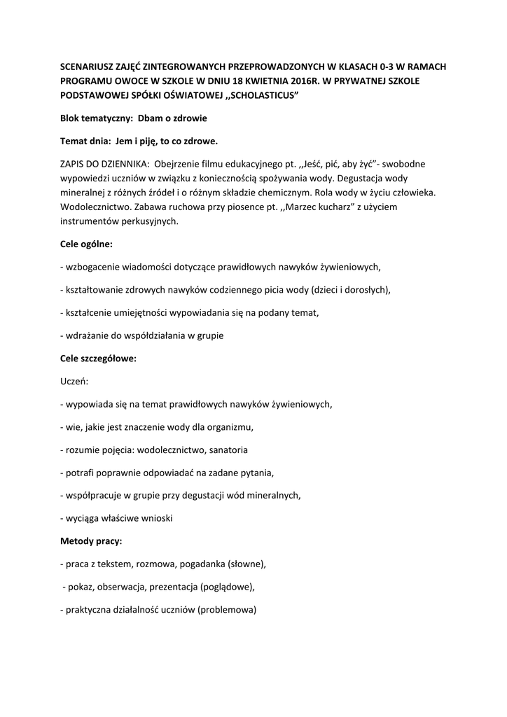 SCENARIUSZ ZAJĘĆ ZINTEGROWANYCH PRZEPROWADZONYCH W KLASACH 0-3 W RAMACH PROGRAMU OWOCE W SZKOLE W DNIU 18 KWIETNIA 2016R. W PRYWATNEJ SZKOLE PODSTAWOWEJ SPÓŁKI OŚWIATOWEJ ,,SCHOLASTICUS” Blok tematyczny: Dbam o zdrowie Temat dnia: Jem i piję, to co zdrowe. ZAPIS DO DZIENNIKA: Obejrzenie filmu edukacyjnego pt. ,,Jeść, pić, aby żyć”- swobodne wypowiedzi uczniów w związku z koniecznością spożywania wody. Degustacja wody mineralnej z różnych źródeł i o różnym składzie chemicznym. Rola wody w życiu człowieka. Wodolecznictwo. Zabawa ruchowa przy piosence pt. ,,Marzec kucharz” z użyciem instrumentów perkusyjnych. Cele ogólne: - wzbogacenie wiadomości dotyczące prawidłowych nawyków żywieniowych, - kształtowanie zdrowych nawyków codziennego picia wody (dzieci i dorosłych), - kształcenie umiejętności wypowiadania się na podany temat, - wdrażanie do współdziałania w grupie Cele szczegółowe: Uczeń: - wypowiada się na temat prawidłowych nawyków żywieniowych, - wie, jakie jest znaczenie wody dla organizmu, - rozumie pojęcia: wodolecznictwo, sanatoria - potrafi poprawnie odpowiadać na zadane pytania, - współpracuje w grupie przy degustacji wód mineralnych, - wyciąga właściwe wnioski Metody pracy: - praca z tekstem, rozmowa, pogadanka (słowne), - pokaz, obserwacja, prezentacja (poglądowe), - praktyczna działalność uczniów (problemowa) Formy pracy: - zbiorowa jednolita, - indywidualna jednolita i zróżnicowana, - grupowa Środki dydaktyczne: Film edukacyjny pt. ,,Jeść, pić, aby żyć” z serii Niebieski Smok (wyd. Nowa Era), różne wody mineralne do degustacji: Muszynianka, Żywiec, Żywiec o smaku cytryny, Jan, jednorazowe kubeczki, instrumenty perkusyjne, magnetofon, płyta z piosenką pt. ,,Marzec kucharz”. Przebieg zajęć: 1.Powitanie zgromadzonych uczniów z klas 1-3 i zapowiedź tematu zajęć. 2. Zabawa ruchowa przy piosence pt. ,,Marzec kucharz” z użyciem instrumentów perkusyjnych. 3. Obejrzenie filmu edukacyjnego pt. ,,Jeść, pić, aby żyć”- rozmowa na temat jego treści. 4. Degustacja wody mineralnej z różnych źródeł i o różnym składzie chemicznym – wyciąganie wniosków. 5. Rozmowa na temat wodolecznictwa. 6. Rozmowa kierowana – spostrzeżenia uczniów, podsumowanie filmu i lekcji. 7. Zabawa ,,Prawda – fałsz” (N. wypowiada zdania dotyczące zdrowego i niezdrowego trybu życia oraz zdrowego i niezdrowego odżywiania się. Kiedy wypowie prawdziwe, U. klaszczą w ręce, gdy wypowie fałszywe – rozkładają ręce). 8. Zakończenie.