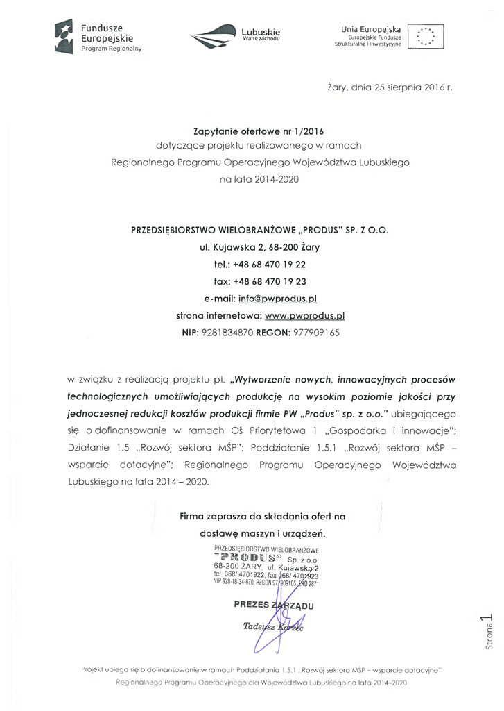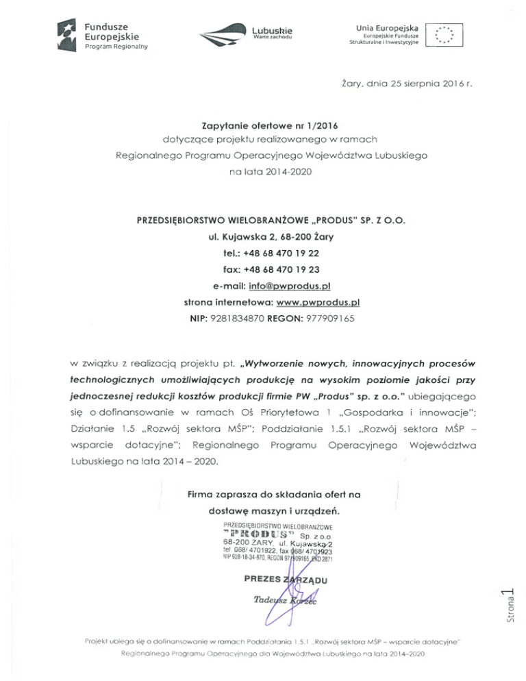 Fundusze Europejskie Unia Europejska Lubuskie Europejskie Fundusze Strukturalne i Inwestycyjne Warte zachodu Program Regionalny Żary, dnia 25 sierpnia 201 6 r. Zapytanie ofertowe nr 1/2016 dotyczące projektu realizowanego w ramach Regionalnego Programu Operacyjnego Województwa Lubuskiego na lata 2014-2020 PRZEDSIĘBIORSTWO WIELOBRANŻOWE „PRODUS" SP. Z O.O. ul. Kujawska 2, 68-200 Żary tel.: +48 68 470 19 22 fax: +48 68 470 19 23 e-mail: [email protected] strona internetowa: www.pwprodus.pl NIP: 9281834870 REGON: 977909165 w związku z realizacją projektu pt. „Wytworzenie nowych, innowacyjnych procesów technologicznych umożliwiających produkcję na wysokim poziomie jakości przy jednoczesnej redukcji kosztów produkcji firmie PW „Produs" sp. z o.o.” ubiegającego się o dofinansowanie w ramach Oś Priorytetowa 1 „Gospodarka i innowacje”; Działanie 1.5 „Rozwój sektora MŚP”; Poddziałanie 1.5.1 „Rozwój sektora MSP wsparcie dotacyjne”; Regionalnego Programu Operacyjnego Województwa Lubuskiego na lata 2014 - 2020. Firma zaprasza do składania ofert na dostawę maszyn i urządzeń. PRZEDSIĘBIORSTWO WIELOBRANŻOWE ,,P E © D i'§ !’ s P. zo.o. Strona 6 8 -2 0 0 Ż A R Y , ul. Kujawską/2 tel. 068/ 4701922, fax $68/ 4701323 NIP 928-18-34-670, REGON 97/&091652KD 2871 Projekt ubiega się o dofinansowanie w ramach Poddziałania 1.5.1 ,,Rozwój sektora MŚP - wsparcie dotacyjne" Regionalnego Programu Operacyjnego dla Województwa Lubuskiego na lata 2014-2020 Fundusze Europejskie Lubuskie Warte zachodu Program Regionalny Unia Europejska Europejskie Fundusze Strukturalne i Inwestycyjne PRZEDMIOT ZAMÓWIENIA: Lp. Nazwa wydatku Minimalne parametry techniczne: - szerokość dęcia - min. 1500 max 3500 mm - szybkość pozycjonowania - min. 24 000 - grubość cięcia - min. do 100 max do 200 mm - długość stołu - min. 6000mm - napęd dwustronny - serwonapędy - cięcie 2D i 3D, - kompresor min. 11 kW - dokładność pozycjonowania min. 0,005 max 0,01 mm - filtrowentylacja o mocy silnika wentylatora min. 5,5 max 11 kW, wydajności ssania min. 5000 max 10000 m3/h i podciśnieniu min. 2300 max 3000 Pa - monitor kolorowy dotykowy min. 15", - napęd dwustronny serwomotory AC - przedłużenie jezdni o min. 2000 mm - dodatkowa szerokość portalu min. 700mm wraz z pilotem plazmowo-tlenowa - automatyczna konsola gazowa wraz z elektrozaworami proporcjonalnymi - reduktory butlowe tlen i gaz palny - suport palnika tlenowego z pojemnościowym czujnikiem odległości oraz z palnikiem tlenowym i zapalarką automatyczną - suport głowicy obrotowo-uchylnej 3D z czujnikiem pomiaru natężenia łuku dla palnika plazmowego HD - czujnik elektroniczny detekcji materiału - agregat plazmowy Smartfocus200 Kjellberg lub równoważny, konsola automatyczna - zestaw części szybkozużywających się - zestaw reduktorów, filtrów i bezpiecznik tlenu - sekcyjny stół odciągowy min. 2000x6000, 1 kanałowy - filtrowentylator min 7.5 kW - elementy instalacji odciągowej 10 mb - program Lantek Expert II z modułem Bevel 3D lub równoważny g V Projekt ubiega się o dofinansowanie w ramach Poddziatania 1.5.1 „Rozwój sektora MSP - wsparcie dotacyjne" Regionalnego Programu Operacyjnego dla Województwa Lubuskiego na lata 2014-2020 Strona 1. - doprowadzenie mediów do maszyny Przecinarka Fundusze Europejskie Unia Europejska Lubuskie Europejskie Fundusze Strukturalne i Inwestycyjne Warte zachodu Program Regionalny ***** * * *** II. MIEJSCE I TERMIN REALIZACJI ZAMÓWIENIA a) Miejsce realizacji zamówienia: ul. Kujawska 2, 68-200 Żary b) Termin realizacji zamówienia: do 31 grudnia 2016 r. III. SPOSÓB OBLICZANIA CENY 1. Oferowana cena powinna zawierać: wszystkie koszty związane z realizacją zamówienia (koszty wytworzenia, dostawę, montaż, uruchomienie). 2. Ceny należy podawać w PLN w rozbiciu na: brutto, netto, VAT (kwota oraz stawka podatku) IV. OPIS SPOSOBU PRZYGOTOWANIA OFERTY 1. Każdy Oferent może złożyć tylko jedną ofertę. 2. Oferty należy składać tylko i wyłącznie na formularzu oferty stanowiącym załącznik nr 1 do niniejszego zapytania ofertowego. 3. Cena oferty musi być podana w PLN lub EUR (oferty podane w EUR zostaną przeliczone zgodnie z kursem sprzedaży EUR w NBP na dzień wystawienia oferty). 4. Cena oferty musi zawierać wszystkie koszty związane z realizacją przedmiotu zamówienia w pełnym rzeczowym zakresie i musi zostać ustalona zgodnie z Zapytaniem ofertowym. 5. Oferta powinna zostać sporządzona w języku polskim, w formie pisemnej. 6. Oferta powinna być czytelna. 7. Oferta, musi zostać podpisana przez osobę uprawnioną do reprezentowania przedsiębiorstwa w obrocie prawnym, zgodnie z postanowieniami wynikającymi z mocy prawa bądź umowy. V. KRYTERIA OCENY OFERT Wybór najkorzystniejszej oferty nastąpi w oparciu o następujące kryterium: Nazwa kryterium Lp. 1. 2. Cena netto (w PLN) Waga kryterium (W) 85% Gwarancja (długość minimalna okresu gwarancji 24 miesiące) Razem 15% 100% Projekt ubiega się o dofinansowanie w ramach Poddziałania 1.5.1 „Rozwój sektora MSP - wsparcie dotacyjne" Regionalnego Programu Operacyjnego dla Województwa Lubuskiego na lata 2014-2020 Fundusze Europejskie Unia Europejska Lubuskie „* * *. Europejskie Fundusze Strukturalne i Inwestycyjne Warte zachodu Program Regionalny * * * ** Punkty za kryterium cena zostaną obliczone za pomocą następującego wzoru: a) Sposób obliczenia kryterium 1: wartość oferty najkorzystniejszej -------------------------------- xW wartość oferty badanej b) Sposób obliczenia kryterium 2: wartość oferty badanej -------------------------------- xW wartość oferty najkorzystniejszej Zamawiający wybierze najkorzystniejszą ofertę, która uzyska najwyższą ilość punktów, w oparciu o ustalone wyżej kryteria i podpisze umowę z wybranym wykonawcą. VI. MIEJSCE, SPOSÓB I TERMINY SKŁADANIA OFERTY ■ osobiście: ul. Kujawska 2, 68-200 Żary ■ pocztą lub kurierem: ul. Kuj