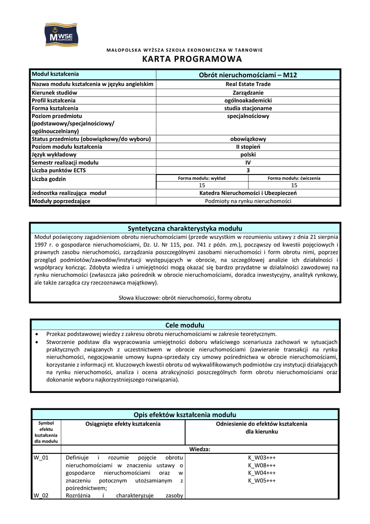 MAŁOP OLSKA WYŻSZ A SZ KOŁA E KONOMICZNA W TARN OW IE KARTA PROGRAMOWA Moduł kształcenia Obrót nieruchomościami – M12 Nazwa modułu kształcenia w języku angielskim Kierunek studiów Profil kształcenia Forma kształcenia Poziom przedmiotu (podstawowy/specjalnościowy/ ogólnouczelniany) Status przedmiotu (obowiązkowy/do wyboru) Poziom modułu kształcenia Język wykładowy Semestr realizacji modułu Liczba punktów ECTS Liczba godzin Real Estate Trade Zarządzanie ogólnoakademicki studia stacjonarne specjalnościowy obowiązkowy II stopień polski IV 3 Forma modułu: wykład Forma modułu: ćwiczenia 15 15 Katedra Nieruchomości i Ubezpieczeń Podmioty na rynku nieruchomości Jednostka realizująca moduł Moduły poprzedzające Syntetyczna charakterystyka modułu Moduł poświęcony zagadnieniom obrotu nieruchomościami (przede wszystkim w rozumieniu ustawy z dnia 21 sierpnia 1997 r. o gospodarce nieruchomościami, Dz. U. Nr 115, poz. 741 z późn. zm.), począwszy od kwestii pojęciowych i prawnych zasobu nieruchomości, zarządzania poszczególnymi zasobami nieruchomości i form obrotu nimi, poprzez przegląd podmiotów/zawodów/instytucji występujących w obrocie, na szczegółowej analizie ich działalności i współpracy kończąc. Zdobyta wiedza i umiejętności mogą okazać się bardzo przydatne w działalności zawodowej na rynku nieruchomości (zwłaszcza jako pośrednik w obrocie nieruchomościami, doradca inwestycyjny, analityk rynkowy, ale także zarządca czy rzeczoznawca majątkowy). Słowa kluczowe: obrót nieruchomości, formy obrotu Cele modułu Przekaz podstawowej wiedzy z zakresu obrotu nieruchomościami w zakresie teoretycznym. Stworzenie podstaw dla wypracowania umiejętności doboru właściwego scenariusza zachowań w sytuacjach praktycznych związanych z uczestnictwem w obrocie nieruchomościami (zawieranie transakcji na rynku nieruchomości, negocjowanie umowy kupna-sprzedaży czy umowy pośrednictwa w obrocie nieruchomościami, korzystanie z informacji nt. kluczowych kwestii obrotu od wykwalifikowanych podmiotów czy instytucji działających na rynku nieruchomości, analiza i ocena atrakcyjności poszczególnych form obrotu nieruchomościami oraz dokonanie wyboru najkorzystniejszego rozwiązania). Opis efektów kształcenia modułu Symbol efektu kształcenia dla modułu Osiągnięte efekty kształcenia Odniesienie do efektów kształcenia dla kierunku Wiedza: W_01 W_02 Definiuje i rozumie pojęcie obrotu nieruchomościami w znaczeniu ustawy o gospodarce nieruchomościami oraz w znaczeniu potocznym utożsamianym z pośrednictwem; Rozróżnia i charakteryzuje zasoby K_W03+++ K_W08+++ K_W04+++ K_W05+++ W_03 U_01 U_02 U_03 K_01 K_02 nieruchomości oraz formy obrotu nimi. Identyfikuje podmioty/zawody/instytucje biorące udział w obrocie nieruchomościami i wskazuje ich zadania, obowiązki i kompetencje. Umiejętności: Potrafi zastosować wiedzę teoretyczną z zakresu obrotu nieruchomościami do analizowania warunków determinujących ten obrót w danym momencie i podjęcia decyzji do samodzielnego w nim uczestnictwa bądź doradzenia aktywnego w nim udziału innym osobom/podmiotom. Potrafi przeprowadzać negocjacje z innymi uczestnikami obrotu nieruchomościami (stronami umowy kupna-sprzedaży czy potencjalnymi klientami). Potrafi zdecydować o wyborze najkorzystniejszej formy obrotu nieruchomościami dla siebie czy też klienta jak też odpowiednio wybrać i skorzystać z oferty usług podmiotów zajmujących się obrotem nieruchomości w praktyce (analizuje i ocenia proponowaną umowę pośrednictwa w obrocie nieruchomościami). Kompetencje społeczne: Jest przygotowany do aktywnego uczestniczenia w obrocie nieruchomościami (jako podmiot indywidualny lub/i w strukturach zawodowych instytucji i organizacji biorących udział w obrocie jako członek zespołu) Jest zdeterminowany do ciągłego podnoszenia swoich kwalifikacji w ww. zakresie K_U06+++ K_U08+++ K_U04++ K_U03++ K_U07+++ K_U08+++ K_U10+++ K_K05++ K_K01+ Treści kształcenia modułu Forma modułu: wykład 1. Pojęcie obrotu i rynku nieruchomości: - podstawowe definicje (przypomnienie: nieruchomości i ich klasyfikacje wg różnych kryteriów, rynek nieruchomości i jego charakterystyka – cechy, rynku, funkcje i czynniki tego rynku, kryteria podziału, główne podmioty), - obrót nieruchomościami w znaczeniu ustawy z 21 sierpnia 1997 r. o gospodarce nieruchomościami (Dz. U. Nr 115, poz. 741 z późn. zm.), - obrót nieruchomościami z znaczeniu szerszym i potocznym, - obrót nieruchomościami a pośrednictwo na rynku nieruchomości. 2. Podstawowe zagadnienia prawne związane z obrotem nieruchomościami w Polsce (przede wszystkim KC, Ustawa z dnia 21 sierpnia 1997 r. o gospodarce nieruchomościami) - zasób nieruchomości – ich tworzenie i charakterystyka (zasób SP, zasoby wojewódzkie, zasoby powiatowe, gminne), - zarządzanie poszczególnymi rodzajami zasobów. 3. Formy obrotu nieruchomościami (podstawowe informacje oraz szczegółowe niuanse prawne) Forma modułu: ćwiczenia 1. Elementy obrotu nieruchomościami i jego uczestnicy. 2. Pośrednictwo w obrocie nieruchomościami. Pośrednik w podsystemie obrotu nieruchomościami. Zawód pośrednika w obrocie nieruchomościami – rys historyczny i stan obecny. Zakres odpowiedzialności pośrednika. Rola pośrednika na przykładzie transakcji sprzedaży nieruchomości. Prawne i organizacyjne zasady działania biur obrotu nieruchomościami. Nowoczesne narzędzia pośrednika w obrocie nieruchomościami. Gromadzenie informacji o stanie prawnym nieruchomości. Współpraca z innymi podmiotami na rynku nieruchomości. 3. Umowa pośrednictwa w obrocie nieruchomościami. 4. Udział rzeczoznawcy majątkowego w obrocie nieruchomościami. 5. Notariusz w obrocie nieruchomościami. Obowiązki i zakres odpowiedzialności notariusza. Opłaty. 6. Zasady współdziałania rzeczoznawców, zarządców, pośredników, notariuszy w obrocie na rynku nie
