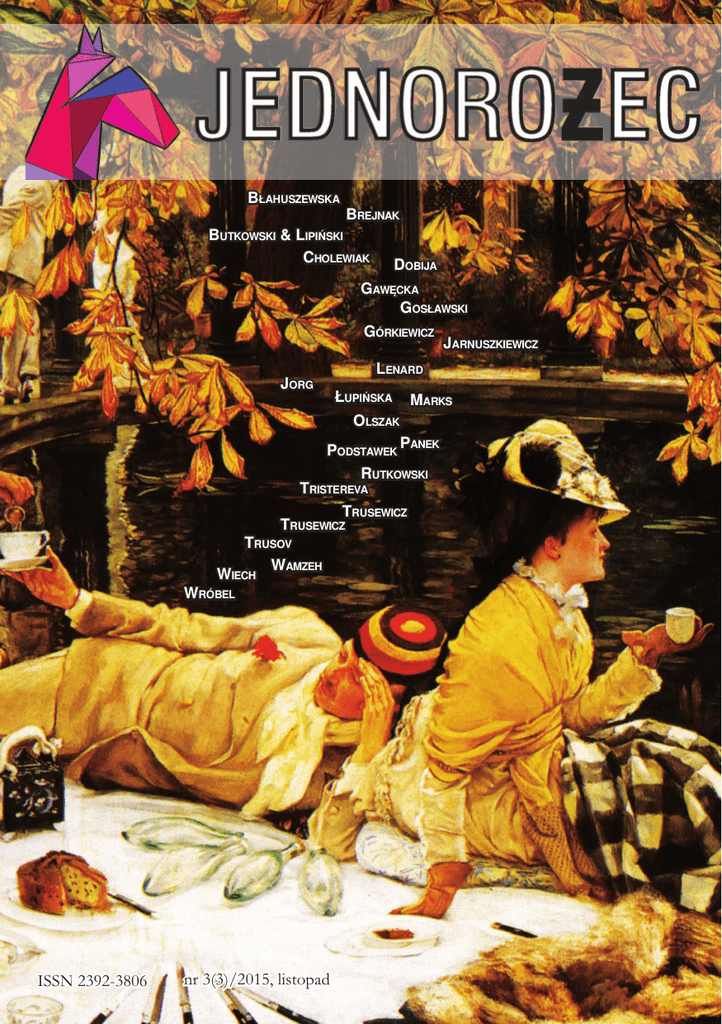 Błahuszewska Brejnak Butkowski & Lipiński Cholewiak Dobija Gawęcka Gosławski Górkiewicz Lenard Jorg Łupińska Olszak Marks Podstawek Panek Rutkowski Tristereva Trusewicz Trusewicz Trusov Wamzeh Wiech Wróbel ISSN 2392-3806 Jarnuszkiewicz nr 3(3)/2015, listopad ISSN 2392-3806 nr 3, 2015 Redaktorzy naczelni / Content Management: Marta Marciniak, Michał Stefaniak Autorzy: Zuzanna Błahuszewska, Sebastian Brejnak, Stanisław Butkowski, Justyna Cholewiak, Paulina Dobija, Magdalena Gawęcka, Mariusz Gosławski, Daria Górkiewicz, Natalia Jarnuszkiewicz, Jorg, Andrzej Lenard, Jan Lipiński, Patrycja Łupińska, Sebastian Marks, Piotr Olszak, Monika Panek, Katarzyna Podstawek, Krzysztof Rutkowski, Arnelia Tristereva, Dominika Trusewicz, Michał Trusewicz, Denis Trusov, Wamzeh, Jakub Wiech, Dorota Anna Wróbel Fotograf redakcji: Joanna Kowalska Korekta: Ada Chudzik, Agata Nowak, Anna Omińska, Patrycja Piotrowska Skład i łamanie: Joanna Prajzendanc Logo: Dariuszka Okładka: Jacques Joseph Tissot, Holyday, 1876 Opracowanie okładki: Joanna Prajzendanc Ilustracje: Joanna Prajzendanc Wydawca: Marta Marciniak, Michał Stefaniak Miejsce wydania: Warszawa Strona internetowa: www.jednorozec.uw.edu.pl Kontakt: [email protected] FB: www.facebook.com/czasopismojednorozec Wszelkie prawa zastrzeżone. Współpracujemy z: Współpracujemy z: Drodzy Artyści i Czytelnicy! Z radością dzielimy się z Wami kolejnym, już trzecim numerem Jednorożca! Bardzo cieszy nas obraz młodych twórców, jaki maluje się przed nami przy każdej kolejnej odsłonie czasopisma, bowiem rośnie nie tylko mnogość zgłoszeń, ale też wartość artystyczna Waszych prac. Mamy nadzieję, że lektura Jednorożca będzie dla Was przyjemnością, szczególnie dla Waszego oka, zważając na bogatą paletę form wizualnych, w tym całkowicie dla nas nowych, takich jak malowanie kawą, czy komiks. Ta różnorodność dobrze oddaje fundamentalny zamysł, który towarzyszy nam od początków Jednorożca. Wielkim zaszczytem jest dla nas możliwość publikowania twórczości wybitnych przedstawicieli świata sztuki i kultury, niekwestionowanych autorytetów w tej dziedzinie – w tym wydaniu prezentujemy Wam „Pont Marie”, opowiadanie profesora Krzysztofa Rutkowskiego – postaci o niezwykle barwnym życiorysie i nietypowym spojrzeniu na rzeczywistość. Mamy nadzieję, że będzie to nowa tradycja służąca inspiracji i dialogowi między pokoleniem adeptów artystycznego świata, a pokoleniem osób doświadczonych w dziedzinie sztuki, ale nie pozbawionych młodzieńczego wigoru i zdolnych do rzucenia nowego światła na, wydawałoby się, przebrzmiałe zagadnienia. Raz jeszcze życzymy miłej lektury, serdecznie zapraszamy do kontaktu z redakcją i dzielenia się swoimi próbami artystycznymi oraz refleksjami. Zapraszamy do lektury! Jednorożec Refleks Andrzej Lenard, Światło czułe 6 Natchnienie Zuzanna Błahuszewska, Śniły mi się Twoje buty obok moich Zuzanna Błahuszewska, Warsztaty jęz ykowe Zuzanna Błahuszewska, Listy do domu Jakub Wiech, Na Skrz ypaczkę Jakub Wiech, Czekolada Jakub Wiech, Zazdrość Jakub Wiech, Na lenia Sebastian Brejnak, Jakub i anioł Sebastian Brejnak, Jedyne co można powiedzieć Sebastian Brejnak, Abstrakt Dorota Anna Wróbel, Drogi Dorota Anna Wróbel, Piątek Dorota Anna Wróbel, Luty Wamzeh, spadająca gwiazda Wamzeh, piromancja Wamzeh, granica kosmosu Arnelia Tristereva, Spód powiek Michał Trusewicz, róż Michał Trusewicz, kyrie Michał Trusewicz, kalendarz Felek Żołądź, Eric Garner Felek Żołądź, Total 15 16 17 18 18 19 19 20 21 22 23 24 24 25 26 26 27 28 29 30 31 31 Myśli Denis Trusov, Pani chce Denis Trusov, Kundalini Samotnego Narciarza Justyna Cholewiak, Złoty Komar Jorg, List do M. Sebastian Marks, Bądź wolny Krzysztof Rutkowski, Most Marii (Pont Marie) 32 33 34 37 40 47 Impresje Pulina Dobija, Definiowanie miłości Natalia Jarnuszkiewicz, Niedawno SSUW, Początek semestru z Samorządem Studentów UW 56 57 110 Kreska Mariusz Gosławski, Z filiżanki Patrycja Łupińska, Lustro Katarzyna Podstawek, Białe złoto Dominika Trusewicz, Soma Magdalena Gawęcka, Wejrzenie Monika Panek, Nieobecność Piotr Olszak, Element Daria Górkiewicz, Panie Piaskowe Stanisław Butkowski & Jan Lipiński, Symbol miasta 63 72 74 79 82 91 96 99 102 Andrzej Lenard Światło czułe 6 Andrzej Lenard Światło czułe 7 Światło czułe 8 Andrzej Lenard Andrzej Lenard Światło czułe 9 Światło czułe 10 Andrzej Lenard Andrzej Lenard Światło czułe 11 Światło czułe 12 Andrzej Lenard Andrzej Lenard Światło czułe 13 Światło czułe 14 Andrzej Lenard Zuzanna Błahuszewska Śniły mi się Twoje buty obok moich cieszmy się z małych rzeczy przekręcając klucz w zamku naprzeciw wybiega mi cisza rytmicznym stukaniem moich własnych butów o które chciałabym potknąć parę bliskich nóg czyje oczy zostawiły mi parę na lustrze? parę na szybie? parę na zdjęciu? parę razy uszczypnę się jeszcze licząc na pobudkę obok butów w korytarzu więc jeszcze nie wyszedłeś! cieszyłabym się z małych rzeczy gdybym nie potykała się o ich echo na wycieraczce 15 Zuzanna Błahuszewska Warsztaty językowe jak przetłumaczyć na język ludzki to co odczytałam z alfabetu Braille’a wpisanego w temperaturę gęsią skórkę wilgotną bibułkę na uchylonych powiekach jak przetłumaczyć szyfr Morse’a? w nocy wzywały mnie kreski i kropki i krótkie takty z wplecionymi pauzami na oddech kreska kropka kreska kreska kropka kreska wykrzyknik język zawodzi przy nowo odkrytych przyprawach bo nie może jednocześnie mówić o fakturach, których dotyka po raz pierwszy o słowach, na których przygryza go wstyd kiedy gubi się na wargach w najbliższych sobie uśmiechach jak złapać w siatkę ze strun głosowych tego motyla tuż tuż prawie w gardle jak opisać sposób powstawania prądu na szyi i światła w przestrzeni nie umiem słowa są wielkie a ja malutka jak rzęsa na poduszce zmieni