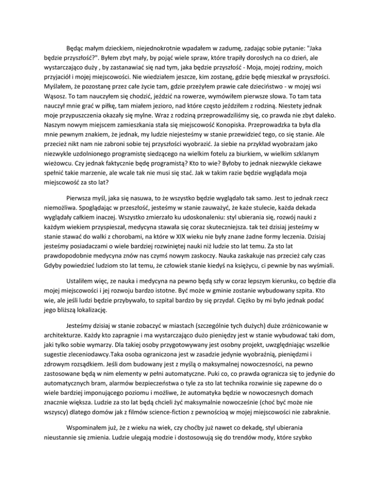 Będąc małym dzieckiem, niejednokrotnie wpadałem w zadumę, zadając sobie pytanie: "Jaka będzie przyszłość?". Byłem zbyt mały, by pojąć wiele spraw, które trapiły dorosłych na co dzień, ale wystarczająco duży , by zastanawiać się nad tym, jaka będzie przyszłość - Moja, mojej rodziny, moich przyjaciół i mojej miejscowości. Nie wiedziałem jeszcze, kim zostanę, gdzie będę mieszkał w przyszłości. Myślałem, że pozostanę przez całe życie tam, gdzie przeżyłem prawie całe dzieciństwo - w mojej wsi Wąsosz. To tam nauczyłem się chodzić, jeździć na rowerze, wymówiłem pierwsze słowa. To tam tata nauczył mnie grać w piłkę, tam miałem jezioro, nad które często jeździłem z rodziną. Niestety jednak moje przypuszczenia okazały się mylne. Wraz z rodziną przeprowadziliśmy się, co prawda nie zbyt daleko. Naszym nowym miejscem zamieszkania stała się miejscowość Konopiska. Przeprowadzka ta była dla mnie pewnym znakiem, że jednak, my ludzie niejesteśmy w stanie przewidzieć tego, co się stanie. Ale przecież nikt nam nie zabroni sobie tej przyszłości wyobrazić. Ja siebie na przykład wyobrażam jako niezwykle uzdolnionego programistę siedzącego na wielkim fotelu za biurkiem, w wielkim szklanym wieżowcu. Czy jednak faktycznie będę programistą? Kto to wie? Byłoby to jednak niezwykle ciekawe spełnić takie marzenie, ale wcale tak nie musi się stać. Jak w takim razie będzie wyglądała moja miejscowość za sto lat? Pierwsza myśl, jaka się nasuwa, to że wszystko będzie wyglądało tak samo. Jest to jednak rzecz niemożliwa. Spoglądając w przeszłość, jesteśmy w stanie zauważyć, że każe stulecie, każda dekada wyglądały całkiem inaczej. Wszystko zmierzało ku udoskonaleniu: styl ubierania się, rozwój nauki z każdym wiekiem przyspieszał, medycyna stawała się coraz skuteczniejsza. tak też dzisiaj jesteśmy w stanie stawać do walki z chorobami, na które w XIX wieku nie były znane żadne formy leczenia. Dzisiaj jesteśmy posiadaczami o wiele bardziej rozwiniętej nauki niż ludzie sto lat temu. Za sto lat prawdopodobnie medycyna znów nas czymś nowym zaskoczy. Nauka zaskakuje nas przecież cały czas Gdyby powiedzieć ludziom sto lat temu, że człowiek stanie kiedyś na księżycu, ci pewnie by nas wyśmiali. Ustaliłem więc, ze nauka i medycyna na pewno będą szły w coraz lepszym kierunku, co będzie dla mojej miejscowości i jej rozwoju bardzo istotne. Być może w gminie zostanie wybudowany szpita. Kto wie, ale jeśli ludzi będzie przybywało, to szpital bardzo by się przydał. Ciężko by mi było jednak podać jego bliższą lokalizację. Jesteśmy dzisiaj w stanie zobaczyć w miastach (szczególnie tych dużych) duże zróżnicowanie w architekturze. Każdy kto zapragnie i ma wystarczająco dużo pieniędzy jest w stanie wybudować taki dom, jaki tylko sobie wymarzy. Dla takiej osoby przygotowywany jest osobny projekt, uwzględniając wszelkie sugestie zleceniodawcy.Taka osoba ograniczona jest w zasadzie jedynie wyobraźnią, pieniędzmi i zdrowym rozsądkiem. Jeśli dom budowany jest z myślą o maksymalnej nowoczesności, na pewno zastosowane będą w nim elementy w pełni automatyczne. Puki co, co prawda ogranicza się to jedynie do automatycznych bram, alarmów bezpieczeństwa o tyle za sto lat technika rozwinie się zapewne do o wiele bardziej imponującego poziomu i możliwe, że automatyka będzie w nowoczesnych domach znacznie większa. Ludzie za sto lat będą chcieli żyć maksymalnie nowocześnie (choć być może nie wszyscy) dlatego domów jak z filmów science-fiction z pewnościoą w mojej miejscowości nie zabraknie. Wspominałem już, że z wieku na wiek, czy choćby już nawet co dekadę, styl ubierania nieustannie się zmienia. Ludzie ulegają modzie i dostosowują się do trendów mody, które szybko wchodzą w styl najzwyklejszego codziennego ubioru. Zauważyć pragnę, że każdy wiek w ubiorze miał swoje luźne jak i eleganckie odzwierciedlenie. Jako, że niestety na eleganckim ubiorze znam się raczej miernie, nie napiszę o nim zbyt wiele. Jestem jednak miemal pewny, że za sto lat pojawi się taki materiał, taki krój w modzie, który będzie niezwykle uniwersalny i który będzie chętnie wybierany przez obie płci, chodź pewnie nie nada się na każdą okazję, okaże się być po prostu dobry i przyjmie się bez problemu. Tutaj myśląc o ubraniu uniwersalnym mam na myśli jeans i znane spodnie jeansowe, w których i ja chodzę na co dzień. Motoryzacia i środki transportu pojawiły się nie z dnia na dzień, aczkolwiek niezwykle szybko. Pierwszy samochód wyjechał z garażu Karla Benza 129 lat temu. Od tamtego czasu motoryzacja rozwinęła się niesamowicie, do takiego stopnia jakiego możemy obserwować na drogach. W wielu filmach fantastyczno-naukowych pojawiają się takie momenty, w których możemy zobaczyć, że ludzie przemieszczają się w latających samochodach. Bym może takimi pojazdami będą poruszać się ludzie za sto lat. Asfaltowe drogi nie będą im więc potrzebne, co ominie konieczność ich ewentualnych napraw. Internet już dzisiaj jest uznawany za jedno z mediów obok prasy, telewizji i radia. Preferowany jest przez młodych ludzi dlatego, że jest nie tylko szeroko dostępny ale i również dlatego, że jest dostępne na wielu rodziajach użądzeń codziennego użytku, na przykład telefonach, tabletach, czy nawet telewizorach. W dużych miastach dostępne są już od pewnego czasu miejsca gdzie dostęp do internetu na dowolnym użądzeniu jest darmowy. Takie miejsca to na przykład kawiatnie czy restauracje do których często przychodzą młodzi ludzie. Takich miejsc jest coraz więcej i choć teraz spotkać można jes wyłącznie w miastach to za sto lat będzie ich tak wiele, że dostęp do nowych informacji będzie na wyciągnięcie ręki, a nawet możliwe, że obejmi cały świat. Wpominam o tym medium dlatego, że jako przysz