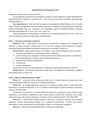 Objaśnienia do formularza G-10.3 Objaśnienia dotyczą wzoru formularza za 2015 r. Do sporządzania sprawozdania są zobowiązane podmioty, których działalność została zaklasyfikowana według PKD 2007 do sekcji B, C, D (bez klas 35.1 i 35.3) oraz do innych sekcji w przypadku, gdy wytwarzają energię elektryczną. Kod województwa (2 znaki) powinien być zgodny z rozporządzeniem Rady Ministrów z dnia 15 grudnia 1998 r. w sprawie szczegółowych zasad prowadzenia, stosowania i udostępniania krajowego rejestru urzędowego podziału terytorialnego kraju oraz związanych z tym obowiązków organów administracji rządowej i jednostek samorządu terytorialnego (Dz. U. Nr 157, poz. 1031, z późn. zm.). Należy wykazywać kod województwa, na którego terenie położona jest elektrownia; może on być inny niż kod województwa właściwego dla siedziby przedsiębiorstwa. Dział 1. Zdolności produkcyjne elektrowni Wiersze 01 i 07 – należy podać moc elektryczną zainstalowaną, osiągalną brutto, osiągalną netto (wielkości te należy podawać z dokładnością do 0,1) oraz moc osiągalną cieplną (wyrażoną w liczbach całkowitych) całej elektrociepłowni odpowiednio według stanu na początek i koniec roku. Wiersze 02–06 – należy podać przyrost (+) lub ubytek (-) mocy dla poszczególnych przyczyn zmiany: I - inwestycja (wprowadzenie do eksploatacji nowego urządzenia), K - korekta (dotyczy mocy osiągalnej i może być spowodowana wieloma przyczynami, np. likwidacją kotła współpracującego z turbinami, modernizacją turbozespołu itp.), L - likwidacja (np. likwidacja turbozespołu), M - modernizacja, O - zmiany organizacyjne. W przypadku zmiany mocy zainstalowanej lub osiągalnej urządzenia należy wypełnić Działy 6÷8. Wiersze 08–15 – dla każdego turbozespołu należy podać moc elektryczną zainstalowaną, osiągalną brutto według stanu na koniec roku. Dział 2. Bilans energii elektrycznej, w MWh Wiersz 01 – produkcja energii elektrycznej brutto jest to energia elektryczna wytworzona przez wszystkie generatory elektrowni, mierzona na zaciskach generatorów. Wiersz 02 – za energię elektryczną wytworzoną w skojarzeniu należy uważać energię elektryczną wytworzoną w procesie skojarzonym (w tym w układach kombinowanych, gazowo-parowych) wyznaczoną zgodnie z PN-93/M-35500. W układach kombinowanych za energię elektryczną wytworzona w skojarzeniu należy uważać energię wytwarzaną w generatorach napędzanych przez turbinę gazową (również silniki spalinowe) oraz energię wytworzoną przez człon parowy w skojarzeniu. Energię tę można wyznaczyć zgodnie z PN-93/M-35500. Wiersz 03 – należy podać energię elektryczną wytworzoną w turbinach gazowych przez agregaty napędzane silnikami wewnętrznego spalania oraz w układzie kombinowanym, w którym człon parowy zasilany jest z kotłów odzysknicowych wykorzystujących ciepło z turbin gazowych i agregatów. Wiersz 04 – należy wykazać energię elektryczną z odnawialnych źródeł energii. W wierszu 05 należy podać ilość energii elektrycznej uzyskanej ze spalania biomasy/biogazu a w wierszu 06 należy podać ilość energii elektrycznej wytworzonej w układach hybrydowych (zgodnie z rozporządzeniem Ministra Gospodarki z dnia 18 października 2012 r. w sprawie szczegółowego zakresu obowiązków uzyskania i przedstawienia do umorzenia świadectw pochodzenia, uiszczenia opłaty zastępczej, zakupu energii elektrycznej i ciepła wytworzonych w odnawialnych źródłach energii oraz obowiązku potwierdzania danych dotyczących ilości energii elektrycznej wytworzonej w odnawialnym źródle energii (Dz. U. poz. 1229, z późn. zm.)). Wiersz 07 – należy podać ilość energii elektrycznej wytworzonej ze spalania biomasy/biogazu w urządzeniach spalających jednocześnie te paliwa z innymi paliwami. Energię elektryczną wytworzoną z biomasy/biogazu należy obliczać jako część energii odpowiadającą udziałowi energii chemicznej biomasy/biogazu w całości energii chemicznej wszystkich paliw zużytych do produkcji energii elektrycznej. Wiersz 08 – należy wykazać energię elektryczną pobraną przez elektrownię z zewnątrz na potrzeby przemian energetycznych. Energia ta wchodzi do bilansu energii elektrycznej. Wiersz 09 – należy wykazać ilość energii pobranej z sieci energetyki zawodowej (sieci OSP lub OSD). Wiersz 10 – należy podać ilość energii pobranej bezpośrednio od innych elektrowni bez pośrednictwa sieci OSP lub OSD. Wiersze 12 i 13 – należy podać zużycie energii elektrycznej (z własnej produkcji lub pobranej z sieci) na potrzeby przemian energetycznych. W wierszu 12 należy podać energię elektryczną zużytą na produkcję energii elektrycznej, a w wierszu 13 na produkcję ciepła. Zasady podziału zostały podane w Polskiej Normie PN-93/M-35500 (IV strefa bilansowa). W wierszu 14 należy podać zużycie energii elektrycznej w elektrociepłowni i w przedsiębiorstwie przemysłowym do innych celów niż przemiana energetyczna. Zużycie na produkcję energii mechanicznej zużywanej w przedsiębiorstwie do innych celów niż przemiana energetyczna należy doliczać do zużycia przez własny zakład przemysłowy. Wiersze 15, 16 i 17 należy podać ilość energii fizycznie oddanej do sieci OSP lub OSD, odbiorcom końcowym oraz innym odbiorcom bezpośrednio z elektrowni. Dział 3. Sprzedaż i zakup energii elektrycznej W dziale tym należy wykazywać sprzedaż energii elektrycznej, pochodzącej z własnej produkcji lub kupowanej w celu dalszej odsprzedaży (obrót energią). W dziale tym należy wykazywać również zakup energii elektrycznej na potrzeby energetyczne elektrowni oraz potrzeby przedsiębiorstwa macierzystego lub byłego macierzystego. Energię sprzedawaną/kupowaną należy rozdzielić odpowiednio na kierunki sprzedaży/zakupu zgodnie ze wzorem Działu 3. W wartości energii należy uwzględnić tylko przychody ze sprzedaży e