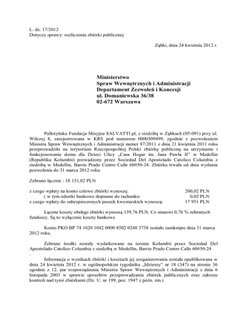 L. dz. 17/2012 Dotyczy sprawy: rozliczenia zbiórki publicznej Ząbki, dnia 24 kwietnia 2012 r. Ministerstwo Spraw Wewnętrznych i Administracji Departament Zezwoleń i Koncesji ul. Domaniewska 36/38 02-672 Warszawa Pallotyńska Fundacja Misyjna SALVATTI.pl, z siedzibą w Ząbkach (05-091) przy ul. Wilczej 8, zarejestrowana w KRS pod numerem 0000309499, zgodnie z pozwoleniem Ministra Spraw Wewnętrznych i Administracji numer 87/2011 z dnia 21 kwietnia 2011 roku przeprowadziła na terytorium Rzeczpospolitej Polski zbiórkę publiczną na utrzymanie i funkcjonowanie domu dla Dzieci Ulicy „Casa Hogar im. Jana Pawła II” w Medellin (Republika Kolumbii) prowadzony przez Sociedad Del Apostolado Catolico Columbia z siedzibą w Medellin, Barrio Prado Centro Calle 60#50-24. Zbiórka trwała od dnia wydania pozwolenia do 31 marca 2012 roku. Zebrano łącznie : 18 151,02 PLN z czego wpłaty na konto celowe zbiórki wynoszą: ( w tym odsetki bankowe dopisane do rachunku: z czego wpłaty do zabezpieczonych puszek kwestarskich wynoszą: 200,02 PLN 0,02 PLN 17 951 PLN Łączne koszty obsługi zbiórki wynoszą 139,76 PLN. Co stanowi 0,76 % zebranych funduszy. Są to wyłącznie koszty bankowe Konto PKO BP 74 1020 1042 0000 8502 0248 3758 zostało zamknięte dnia 31 marca 2012 roku. Zebrane środki zostały wydatkowane na terenie Kolumbii przez Sociedad Del Apostolado Catolico Columbia z siedzibą w Medellin, Barrio Prado Centro Calle 60#50-24 . Informacja o wynikach zbiórki i kosztach jej zorganizowania została opublikowana w dniu 24 kwietnia 2012 r. w ogólnopolskim tygodniku „Idziemy” nr 18 (347) na stronie 36 zgodnie z 12. par rozporządzenia Ministra Spraw Wewnętrznych i Administracji z dnia 6 listopada 2003 w sprawie sposobów przeprowadzania zbiórek publicznych oraz zakresu kontroli nad tymi zbiórkami (Dz. U. nr 199, poz. 1947 z późn. zm.)