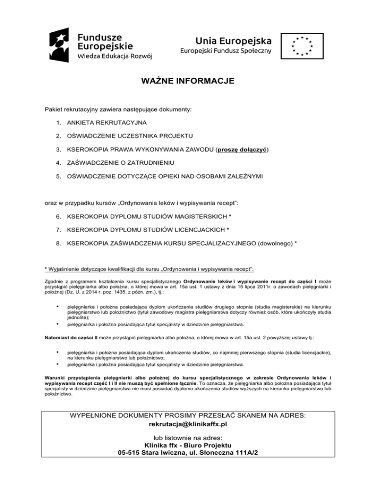 WAŻNE INFORMACJE Pakiet rekrutacyjny zawiera następujące dokumenty: 1. ANKIETA REKRUTACYJNA 2. OŚWIADCZENIE UCZESTNIKA PROJEKTU 3. KSEROKOPIA PRAWA WYKONYWANIA ZAWODU (proszę dołączyć) 4. ZAŚWIADCZENIE O ZATRUDNIENIU 5. OŚWIADCZENIE DOTYCZĄCE OPIEKI NAD OSOBAMI ZALEŻNYMI oraz w przypadku kursów „Ordynowania leków i wypisywania recept”: 6. KSEROKOPIA DYPLOMU STUDIÓW MAGISTERSKICH * 7. KSEROKOPIA DYPLOMU STUDIÓW LICENCJACKICH * 8. KSEROKOPIA ZAŚWIADCZENIA KURSU SPECJALIZACYJNEGO (dowolnego) * * Wyjaśnienie dotyczące kwalifikacji dla kursu „Ordynowania i wypisywania recept”: Zgodnie z programem kształcenia kursu specjalistycznego Ordynowanie leków i wypisywanie recept do części I może przystąpić pielęgniarka albo położna, o której mowa w art. 15a ust. 1 ustawy z dnia 15 lipca 2011r. o zawodach pielęgniarki i położnej (Dz. U. z 2014 r. poz. 1435, z późn. zm.), tj.: • pielęgniarka i położna posiadająca dyplom ukończenia studiów drugiego stopnia (studia magisterskie) na kierunku pielęgniarstwo lub położnictwo (tytuł zawodowy magistra pielęgniarstwa dotyczy również osób, które ukończyły studia jednolite); • pielęgniarka i położna posiadająca tytuł specjalisty w dziedzinie pielęgniarstwa. Natomiast do części II może przystąpić pielęgniarka albo położna, o której mowa w art. 15a ust. 2 powyższej ustawy tj.: • • pielęgniarka i położna posiadająca dyplom ukończenia studiów, co najmniej pierwszego stopnia (studia licencjackie), na kierunku pielęgniarstwo lub położnictwo; pielęgniarka i położna posiadająca tytuł specjalisty w dziedzinie pielęgniarstwa. Warunki przystąpienia pielęgniarki albo położnej do kursu specjalistycznego w zakresie Ordynowania leków i wypisywania recept część I i II nie muszą być spełnione łącznie. To oznacza, że pielęgniarka albo położna posiadająca tytuł specjalisty w dziedzinie pielęgniarstwa nie musi posiadać dyplomu ukończenia studiów wyższych na kierunku pielęgniarstwo lub położnictwo. WYPEŁNIONE DOKUMENTY PROSIMY PRZESŁAĆ SKANEM NA ADRES: [email protected] lub listownie na adres: Klinika ffx - Biuro Projektu 05-515 Stara Iwiczna, ul. Słoneczna 111A/2 Klinika ffx Grażyna Maria Nowak ul. Jurija Gagarina 30/7, 00-754 Warszawa ANKIETA REKRUTACYJNA Numer projektu WND-POWR.05.04.00-00-0009/15 „Nowe kwalifikacje dla pielęgniarek Dolnego Śląska, Łódzkiego, Mazowsza, Małopolski, Śląska i Wielkopolski” Tytuł projektu Nazwa wsparcia Zaznacz właściwe !!!! Pielęgniarstwo onkologiczne Pielęgniarstwo psychiatryczne Ordynowanie leków i wypisywanie recept dla pielęgniarek i położnych" -Część I Ordynowanie leków i wypisywanie recept dla pielęgniarek i położnych" - Część II Imię: Płeć : M Nazwisko: ∗ Data i miejsce urodzenia: _ _ - _ _- _ _ _ _ ____________________________________ PESEL K Wiek w latach: Dane do kontaktu (przynajmniej jedno pole wypełnić obowiązkowo): Adres zamieszkania ( z dowodu tożsamości) : numer telefonu (domowy):_____________ ul. _________________________________nr ________ telefon komórkowy: _________________ miejscowość __________________ e-mail ___________________________ (miasto / wieś) ∗ kod pocztowy_ _-_ _ _ poczta ____________________ powiat _______________________________ województwo _______________________________ Opieka nad dziećmi do lat 7 lub opieka nad osobą zależną a. TAK/NIE(dziecko do lat 7 b. TAK/NIE(dziecko powyżej 7lat) c. TAK/NIE (opieka nad osobą zależną) (Osoba zależna to w szczególności osoba, wymagająca ze względu na stan zdrowia lub wiek stałej opieki, połączona więzami rodzinnymi lub powinowactwem z uczestnikiem szkolenia lub pozostająca z nim we wspólnym gospodarstwie domowym). Osoba niepełnosprawna – Tak /Nie/ odmawiam podania danych) Poziom wykształcenia q niższe niż podstawowe, (ISCED 0) q podstawowe, (ISCED 1) q gimnazjalne, (ISCED 2) q ponadgimnazjalne (ISCED 3) q policealne (ISCED 4) q wyższe (ISCED 5-8) (posiadająca stwierdzony stopień niepełnosprawności) Oświadczenia: Należę do mniejszości narodowej lub etnicznej, migrant, osoba obcego pochodzenia (tak/nie/odmawiam podania danych) Osoba bezdomna lub dotknięta wykluczeniem z dostępu do mieszkań - tak/nie Osoba przebywająca w gospodarstwie domowym bez osób pracujących - tak/nie w tym: w gospodarstwie domowym z dziećmi pozostającymi na utrzymaniu - tak/nie Osoba żyjąca w gospodarstwie składającym się z jednej osoby dorosłej i dzieci pozostających na utrzymaniu tak/nie ∗ Właściwe zakreślić Projekt współfinansowany ze środków Unii Europejskiej w ramach Europejskiego Funduszu Społecznego Osoba w innej niekorzystnej sytuacji społecznej (innej niż wymienione powyżej) – tak/nie/odmawiam podania danych ( pochodzenie z obszarów wiejskich, byli więźniowie, narkomani itp.). Kobieta powracająca do pracy po urodzeniu dziecka - tak/nie Status osoby na rynku pracy w chwili przystąpienia do projektu * 1. Osoba bezrobotna niezarejestrowana w ewidencji urzędów pracy - tak/nie W tym: długotrwale bezrobotna – tak/nie , inne - tak/nie 2. Osoba bezrobotna zarejestrowana w ewidencji urzędów pracy – tak/nie W tym: długotrwale bezrobotna * – tak/nie inne – tak/nie 3. Bierna zawodowo - tak/nie W tym : inne - tak/nie osoba ucząca się - tak/nie osoba nieuczestnicząca w kształceniu lub szkoleniu – tak/nie 4. Osoba pracująca – tak/nie W tym : osoba pracująca w administracji rządowej - tak/nie osoba pracująca w administracji samorządowej - tak/nie inne - tak/nie osoba pracująca w mikro, małym, średnim przedsiębiorstwie (MMŚP) – (do 250 osób) - tak/nie osoba pracująca w organizacji pozarządowej - tak/nie osoba prowadząca działalność na własny rachunek - tak/nie osoba pracująca w dużym przedsiębiorstwie (powyżej 250 osób) - tak/nie 5. Zakład pracy , w którym jestem zatrudniona/y realizuje świadczenia w zakresie Podstawowej O