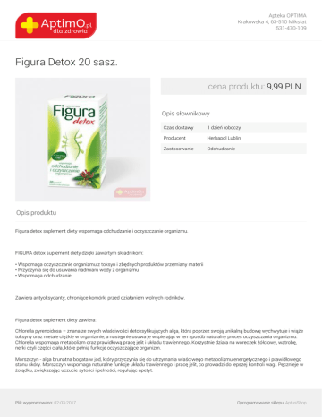 Apteka OPTIMA Krakowska 4, 63-510 Mikstat 531-470-109 Figura Detox 20 sasz. cena produktu: 9,99 PLN Opis słownikowy Czas dostawy 1 dzień roboczy Producent Herbapol Lublin Zastosowanie Odchudzanie Opis produktu Figura detox suplement diety wspomaga odchudzanie i oczyszczanie organizmu. FIGURA detox suplement diety dzięki zawartym składnikom: • Wspomaga oczyszczanie organizmu z toksyn i zbędnych produktów przemiany materii • Przyczynia się do usuwania nadmiaru wody z organizmu • Wspomaga odchudzanie Zawiera antyoksydanty, chroniące komórki przed działaniem wolnych rodników. Figura detox suplement diety zawiera: Chlorella pyrenoidosa – znana ze swych właściwości detoksyfikujących alga, która poprzez swoją unikalną budowę wychwytuje i wiąże toksyny oraz metale ciężkie w organizmie, a następnie usuwa je wspierając w ten sposób naturalny proces oczyszczania organizmu. Chlorella wspomaga metabolizm oraz prawidłową pracę jelit i układu trawiennego. Korzystnie działa na woreczek żółciowy, wątrobę, nerki czyli części ciała, które pełnią funkcje oczyszczające organizm. Morszczyn - alga brunatna bogata w jod, który przyczynia się do utrzymania właściwego metabolizmu energetycznego i prawidłowego stanu skóry. Morszczyn wspomaga naturalne funkcje układu trawiennego i pracę jelit, co prowadzi do lepszej kontroli wagi. Pęcznieje w żołądku, zwiększając uczucie sytości i pełności, regulując apetyt. Plik wygenerowano: 02-03-2017 Oprogramowanie sklepu: AptusShop Apteka OPTIMA Krakowska 4, 63-510 Mikstat 531-470-109 Owoc kopru, liść mate i liść oliwki – wspomagają funkcje eliminacyjne organizmu, szczególnie usuwanie nadmiaru wody. Cynk – przyczynia się do prawidłowego metabolizmu węglowodanów, kwasów tłuszczowych i makroskładników odżywczych, czyli do właściwej przemiany materii. Pomaga również zachować zdrową skórę, włosy i paznokcie. Ma właściwości antyoksydacyjne tj. chroni komórki przed działaniem wolnych rodników. Zestaw witamin: E, B6, biotyna. Wit. E jest antyoksydantem i pomaga w ochronie komórek przed stresem oksydacyjnym. Wit. B6 i biotyna przyczyniają się do utrzymania prawidłowego metabolizmu energetycznego. Wit. B6 pomaga w prawidłowej produkcji krwinek czerwonych i w regulacji aktywności hormonalnej. Biotyna pomaga zachować zdrowe włosy i skórę. Skład: herbata rooibos, jabłko, skórka cytryny, owoc kopru, liść mate, aromat, chlorella, kora cynamonu, winian L-karnityny, kwiat goździkowca, morszczyn, witaminy: wit. E, wit. B6, biotyna, cynk, L-arginina, wyciąg suchy z liścia oliwki. Sposób użycia: Saszetkę zalać szklanką wrzącej wody. Naparzać pod przykryciem ok. 5 min. Pić 2 razy dziennie po 1 saszetce. Zaw. opakowania: 20 saszetek po 2,0 g. Plik wygenerowano: 02-03-2017 Powered by TCPDF (www.tcpdf.org) Oprogramowanie sklepu: AptusShop