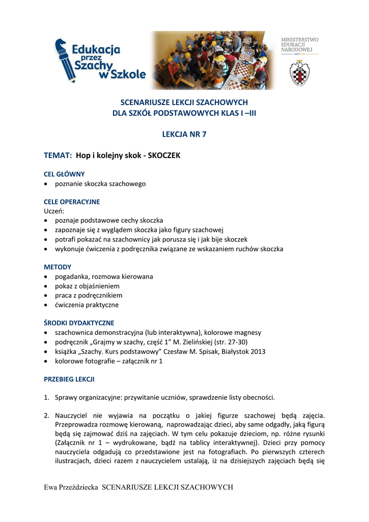 SCENARIUSZE LEKCJI SZACHOWYCH DLA SZKÓŁ PODSTAWOWYCH KLAS I –III LEKCJA NR 7 TEMAT: Hop i kolejny skok - SKOCZEK CEL GŁÓWNY poznanie skoczka szachowego CELE OPERACYJNE Uczeń: poznaje podstawowe cechy skoczka zapoznaje się z wyglądem skoczka jako figury szachowej potrafi pokazać na szachownicy jak porusza się i jak bije skoczek wykonuje ćwiczenia z podręcznika związane ze wskazaniem ruchów skoczka METODY pogadanka, rozmowa kierowana pokaz z objaśnieniem praca z podręcznikiem ćwiczenia praktyczne ŚRODKI DYDAKTYCZNE szachownica demonstracyjna (lub interaktywna), kolorowe magnesy podręcznik „Grajmy w szachy, część 1” M. Zielińskiej (str. 27-30) książka „Szachy. Kurs podstawowy” Czesław M. Spisak, Białystok 2013 kolorowe fotografie – załącznik nr 1 PRZEBIEG LEKCJI 1. Sprawy organizacyjne: przywitanie uczniów, sprawdzenie listy obecności. 2. Nauczyciel nie wyjawia na początku o jakiej figurze szachowej będą zajęcia. Przeprowadza rozmowę kierowaną, naprowadzając dzieci, aby same odgadły, jaką figurą będą się zajmować dziś na zajęciach. W tym celu pokazuje dzieciom, np. różne rysunki (Załącznik nr 1 – wydrukowane, bądź na tablicy interaktywnej). Dzieci przy pomocy nauczyciela odgadują co przedstawione jest na fotografiach. Po pierwszych czterech ilustracjach, dzieci razem z nauczycielem ustalają, iż na dzisiejszych zajęciach będą się Ewa Przeździecka SCENARIUSZE LEKCJI SZACHOWYCH uczyć o SKOCZKU. Pokazując cztery kolejne obrazki i nazywając, co przedstawiają, dzieci poznają drugie imię skoczka – KONIK. Nauczyciel opowiada o tym, że w dawnych czasach w każdym wojsku była kawaleria, czyli rycerze walczący na koniach, dlatego też nie mogło ich zabraknąć w szachowych szrankach. 3. Nauczyciel pokazuje uczniom na szachownicy demonstracyjnej, jak porusza się skoczek oraz jak może zbijać figury przeciwnika. Ruchy skoczka może wytłumaczyć na dwa sposoby: porównując je do literki „L”. Skoczek idzie najpierw o dwa pola po linii prostej a następnie skręca w prawo lub lewo o jedno pole, wykonując w sumie trzy kroki. Jeden kroczek, drugi kroczek i przy trzecim w boczek. Kropkami zaznaczono miejsca, przez które skoczek jedynie „przeskakuje” a krzyżykiem, pola, na które może się ruszyć. Manewr ten może wykonać ruszając skoczkiem w każdą stronę: Skoczek, który stoi na białym, polu może ruszyć się jedynie na czarne i odwrotnie, stojąc na czarnym może w następnym ruchu zająć jedynie białe. Skoczek stoi na polu e4. Kropkami zrobiona jest „przeszkoda” (do zaprezentowania tego sposobu na tablicy demonstracyjnej w miejsce kropek można postawić pionki szachowe lub przyczepić magnesy), którą skoczek musi przeskoczyć (diagram 1). Skoro skoczek stoi na białym polu, może w następnym ruchu skoczyć jedynie na czarne. Polami, na które może poruszyć się z pola e4, są wszystkie czarne pola znajdujące się zaraz, bezpośrednio za „przeszkodą” (oznaczone krzyżykiem, diagram 2). diagram 1 Ewa Przeździecka SCENARIUSZE LEKCJI SZACHOWYCH diagram 2 4. Aby łatwiej było zapamiętać ruchy skoczka, nauczyciel uczy dzieci rymowanki: Dwa do przodu, jeden w bok, Taki jest konika skok. Może nauczyć również innego wierszyka o skoczku: Konia złapać – dziwna sprawa, Tego z łąki – to zabawa. Gdy chcesz zrobić to z szachami, Skacze wszystkim nad głowami. Uczniowie kilkakrotnie powtarzają wierszyk za nauczycielem do momentu jego opanowania. 5. Nauczyciel pokazuje na tablicy demonstracyjnej ustawienie skoczków w pozycji wyjściowej. 6. Nauczyciel ustawia skoczka na wybranym przez siebie polu. Dzieci podchodzą po kolei do tablicy demonstracyjnej i przyklejają magnes do pola, na które w danej sytuacji może poruszyć się skoczek. 7. Wykonanie ćwiczenia 1 str. 29, z podręcznika „Grajmy w szachy” (Załącznik nr 1) 8. **Ćwiczenie dodatkowe („Szachy. Kurs podstawowy”, Czesław M. Spisak) 1) Znajdź jaką drogą powinien przejść skoczek, aby odwiedzić wszystkie pola, zatrzymując się na każdym tylko jeden raz (diagram 1)! Rozwiązanie – diagram 2 (cyframi zaznaczono kolejność ruchów skoczka). diagram 1 diagram 2 2) Zadanie polega na obejściu skoczkiem, jak największej ilości pól na całej szachownicy. Każde pole, skoczek może odwiedzić tylko jeden raz! Ewa Przeździecka SCENARIUSZE LEKCJI SZACHOWYCH 9. Podsumowanie zajęć z przypomnieniem ruchów i bicia skoczka. Pożegnanie z uczniami. Ewa Przeździecka SCENARIUSZE LEKCJI SZACHOWYCH Załącznik nr 1 SKOCZEK NARCIARSKI SKOCZEK PUSTYNNY (EGIPSKI) SKOCZEK SPADOCHRONOWY SKOCZEK KRÓLEWSKI KONIK KONIK MORSKI KONIK POLNY KONIK NA BIEGUNACH Ewa Przeździecka SCENARIUSZE LEKCJI SZACHOWYCH Załącznik nr 2 Rozwiązanie ćwiczenia 1 s. 29 (Podręcznik). Ewa Przeździecka SCENARIUSZE LEKCJI SZACHOWYCH Ewa Przeździecka SCENARIUSZE LEKCJI SZACHOWYCH