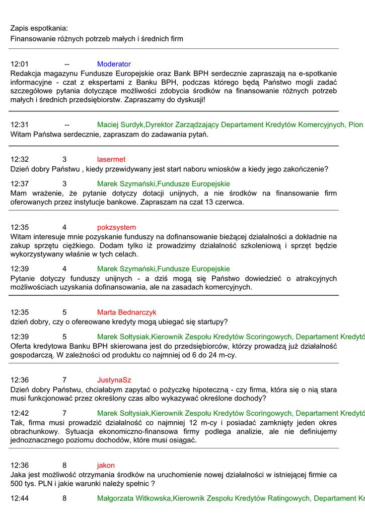Zapis espotkania: Finansowanie różnych potrzeb małych i średnich firm 12:01 -Moderator Redakcja magazynu Fundusze Europejskie oraz Bank BPH serdecznie zapraszają na e-spotkanie informacyjne - czat z ekspertami z Banku BPH, podczas którego będą Państwo mogli zadać szczegółowe pytania dotyczące możliwości zdobycia środków na finansowanie różnych potrzeb małych i średnich przedsiębiorstw. Zapraszamy do dyskusji! 12:31 -Maciej Surdyk,Dyrektor Zarządzający Departament Kredytów Komercyjnych, Pion Witam Państwa serdecznie, zapraszam do zadawania pytań. 12:32 3 lasermet Dzień dobry Państwu , kiedy przewidywany jest start naboru wniosków a kiedy jego zakończenie? 12:37 3 Marek Szymański,Fundusze Europejskie Mam wrażenie, że pytanie dotyczy dotacji unijnych, a nie środków na finansowanie firm oferowanych przez instytucje bankowe. Zapraszam na czat 13 czerwca. 12:35 4 pokzsystem Witam interesuje mnie pozyskanie funduszy na dofinansowanie bieżącej działalności a dokładnie na zakup sprzętu ciężkiego. Dodam tylko iż prowadzimy działalność szkoleniową i sprzęt będzie wykorzystywany właśnie w tych celach. 12:39 4 Marek Szymański,Fundusze Europejskie Pytanie dotyczy funduszy unijnych - a dziś mogą się Państwo dowiedzieć o atrakcyjnych możliwościach uzyskania dofinansowania, ale na zasadach komercyjnych. 12:35 5 Marta Bednarczyk dzień dobry, czy o ofereowane kredyty mogą ubiegać się startupy? 12:39 5 Marek Sołtysiak,Kierownik Zespołu Kredytów Scoringowych, Departament Kredytó Oferta kredytowa Banku BPH skierowana jest do przedsiębiorców, którzy prowadzą już działalność gospodarczą. W zależności od produktu co najmniej od 6 do 24 m-cy. 12:36 7 JustynaSz Dzień dobry Państwu, chciałabym zapytać o pożyczkę hipoteczną - czy firma, która się o nią stara musi funkcjonować przez określony czas albo wykazywać określone dochody? 12:42 7 Marek Sołtysiak,Kierownik Zespołu Kredytów Scoringowych, Departament Kredytó Tak, firma musi prowadzić działalność co najmniej 12 m-cy i posiadać zamknięty jeden okres obrachunkowy. Sytuacja ekonomiczno-finansowa firmy podlega analizie, ale nie definiujemy jednoznacznego poziomu dochodów, które musi osiągać. 12:36 8 jakon Jaka jest możliwość otrzymania środków na uruchomienie nowej działalności w istniejącej firmie ca 500 tys. PLN i jakie warunki należy spełnic ? 12:44 8 Małgorzata Witkowska,Kierownik Zespołu Kredytów Ratingowych, Departament Kr Witam,pytanie rozumiem jako rozszerzenie istniejącej działalności, jeżeli nie to proszę o doprecyzowanie. W przypadku gdy chodzi o pozyskanie środków na działalność bieżącą proponuję jeden z kredytów o charakterze krótkoterminowym. Jeżeli natomiast chodzi o nakłady inwestycyjne to proponuję skorzystać z kredytu inwestycyjnego. Dodatkowo jeżeli istnieje możliwość zabezpieczenia kredytu nieruchomością proponuję kredyt długoterminowy na dowolny cel. Wymagamy: dokumenty rejestracyjne firmy, dokumenty finansowe, formularze bankowe oraz dokumenty dotycząca zabezpieczenia. Wymogiem jest także prowadzenie działalności gospodarczej minimum 12-18 miesięcy. 12:37 10 Marta S Witam. Czy z Państwa oferty mogą skorzystać firmy, które niedawno rozpoczęły działalnosć (3 miesiące temu)? Zajmujemy się produkcją filmową i potrzebujemy środków na zakup dodatkowych narzędzi naszej pracy - specjalistycznego sprzętu. 12:43 10 Maciej Surdyk,Dyrektor Zarządzający Departament Kredytów Komercyjnych, Pion oferta kredytowa kierowana jest przede wszystkim do podmiotów, które prowadzą działalność gospodarczą min. 12 miesięcy. Podstawą oceny zdolności kredytowej jest analiza historycznych wyników finansowych firmy. 12:38 11 Romek Witam mam rozpoczętą inwestycję która z braku środków nie została dokończona. Z jakich środków mógłbym skorzystać by ją dokończyć, biorąc pod uwagę znaczny spadek obrotów i dochodów. 12:59 11 Marek Sołtysiak,Kierownik Zespołu Kredytów Scoringowych, Departament Kredytó W ofercie dla małych firm mamy Prosty Kredyt Inwestycyjny, którym można sfinansować dokończenie rozpoczętej inwestycji zgodnie z jej harmonogramem i kosztorysem. Spadek przychodów nie dyskwalifikuje Pana, ale może mieć wpływ na ostateczną decyzję kredytową. Wiele będzie zależało od innych czynników kondycji finansowej Pana firmy. 12:39 12 aprzybylska Dzień doby, czy o jakiekolwiek dofinansowanie może starać się firma posiadająca stratę za ubiegły rok (pierwszy rok działalności ? 13:25 12 Marek Szymański,Fundusze Europejskie Proszę o to pytać w ,,swoim'' urzędzie marszałkowskim (właściwy regionalny program operacyjny) 12:39 13 elżbieta11 Witam, Jak pozyskać fundusze na działalność firmy około 500tyś zł, prowadzona działalność 20 lat E.Sz. 13:01 13 Marek Szymański,Fundusze Europejskie Jeśli chodzi o wsparcie unijne to proszę przede wszystkim zajrzeć na stronę internetową urzędu marszałkowskiego województwa, w którym Pani prowadzi działalność gospodarczą. Tam są także dane teleadresowe do punktów informacyjnych. Jeśli firma działa na obszarach wiejskich proszę wejść na stronę Agencji Restrukturyzacji i Modernizacji Rolnictwa (pomoc w ramach PROW). W przypadku programów ogólnopolskich proszę zajrzeć na stronę PARP (www.parp.gov.pl) 12:39 14 EFI24052012 Czy EFI może poręczyć (udzielić gwarancji) na pożyczkę Z NFOŚiGW na budowę elektrociepłowni, na którą Fundusz udzielił promesy? 12:53 14 Małgorzata Witkowska,Kierownik Zespołu Kredytów Ratingowych, Departament Kr W przypadku poręczenia EFI nie ma możliwości koncentrowania poręczeń, czyli jeżeli środki Funduszu pochodzą z pomocy unijnej to nie. 12:40 15 Edward BUDNY dzień dobry, pytanie: czy oferowane środki pomocowe mają ograniczenia terytorialne (ograniczają sie do województw, na terenie którego prowadzona jest działalność/ 13:05 15 