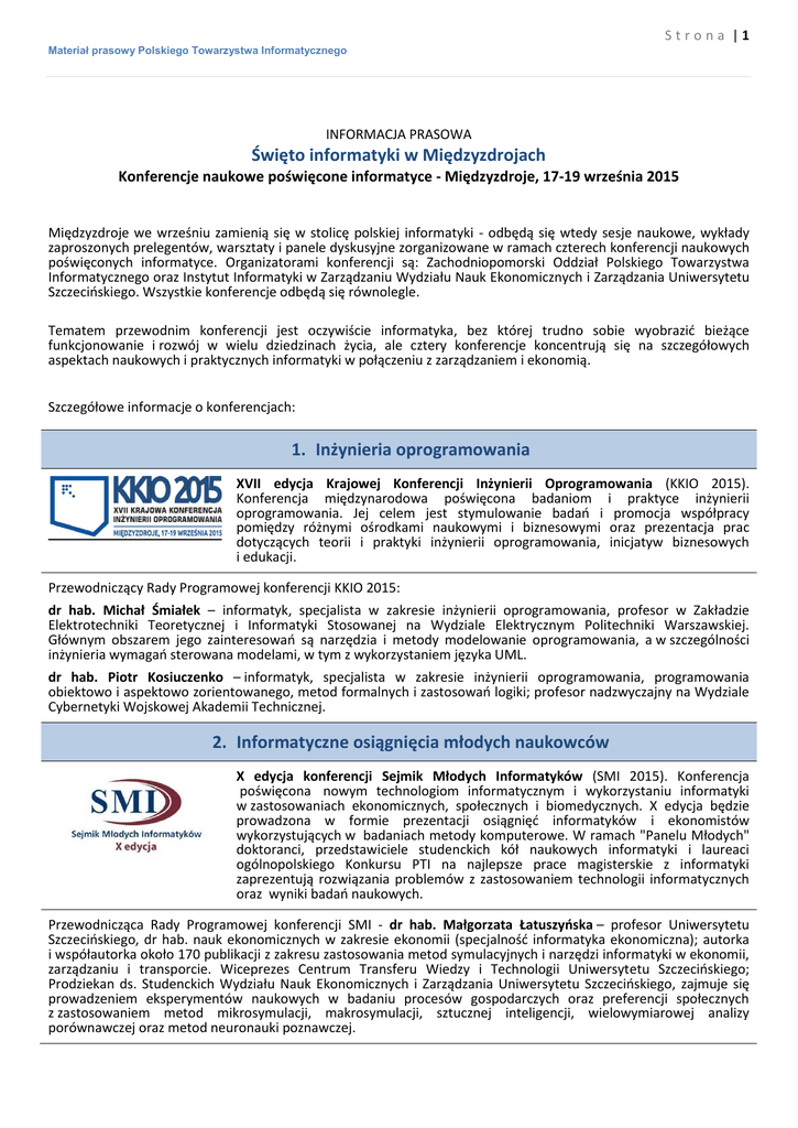 Strona |1 Materiał prasowy Polskiego Towarzystwa Informatycznego INFORMACJA PRASOWA Święto informatyki w Międzyzdrojach Konferencje naukowe poświęcone informatyce - Międzyzdroje, 17-19 września 2015 Międzyzdroje we wrześniu zamienią się w stolicę polskiej informatyki - odbędą się wtedy sesje naukowe, wykłady zaproszonych prelegentów, warsztaty i panele dyskusyjne zorganizowane w ramach czterech konferencji naukowych poświęconych informatyce. Organizatorami konferencji są: Zachodniopomorski Oddział Polskiego Towarzystwa Informatycznego oraz Instytut Informatyki w Zarządzaniu Wydziału Nauk Ekonomicznych i Zarządzania Uniwersytetu Szczecińskiego. Wszystkie konferencje odbędą się równolegle. Tematem przewodnim konferencji jest oczywiście informatyka, bez której trudno sobie wyobrazić bieżące funkcjonowanie i rozwój w wielu dziedzinach życia, ale cztery konferencje koncentrują się na szczegółowych aspektach naukowych i praktycznych informatyki w połączeniu z zarządzaniem i ekonomią. Szczegółowe informacje o konferencjach: 1. Inżynieria oprogramowania XVII edycja Krajowej Konferencji Inżynierii Oprogramowania (KKIO 2015). Konferencja międzynarodowa poświęcona badaniom i praktyce inżynierii oprogramowania. Jej celem jest stymulowanie badań i promocja współpracy pomiędzy różnymi ośrodkami naukowymi i biznesowymi oraz prezentacja prac dotyczących teorii i praktyki inżynierii oprogramowania, inicjatyw biznesowych i edukacji. Przewodniczący Rady Programowej konferencji KKIO 2015: dr hab. Michał Śmiałek – informatyk, specjalista w zakresie inżynierii oprogramowania, profesor w Zakładzie Elektrotechniki Teoretycznej i Informatyki Stosowanej na Wydziale Elektrycznym Politechniki Warszawskiej. Głównym obszarem jego zainteresowań są narzędzia i metody modelowanie oprogramowania, a w szczególności inżynieria wymagań sterowana modelami, w tym z wykorzystaniem języka UML. dr hab. Piotr Kosiuczenko – informatyk, specjalista w zakresie inżynierii oprogramowania, programowania obiektowo i aspektowo zorientowanego, metod formalnych i zastosowań logiki; profesor nadzwyczajny na Wydziale Cybernetyki Wojskowej Akademii Technicznej. 2. Informatyczne osiągnięcia młodych naukowców X edycja konferencji Sejmik Młodych Informatyków (SMI 2015). Konferencja poświęcona nowym technologiom informatycznym i wykorzystaniu informatyki w zastosowaniach ekonomicznych, społecznych i biomedycznych. X edycja będzie prowadzona w formie prezentacji osiągnięć informatyków i ekonomistów wykorzystujących w badaniach metody komputerowe. W ramach "Panelu Młodych" doktoranci, przedstawiciele studenckich kół naukowych informatyki i laureaci ogólnopolskiego Konkursu PTI na najlepsze prace magisterskie z informatyki zaprezentują rozwiązania problemów z zastosowaniem technologii informatycznych oraz wyniki badań naukowych. Przewodnicząca Rady Programowej konferencji SMI - dr hab. Małgorzata Łatuszyńska – profesor Uniwersytetu Szczecińskiego, dr hab. nauk ekonomicznych w zakresie ekonomii (specjalność informatyka ekonomiczna); autorka i współautorka około 170 publikacji z zakresu zastosowania metod symulacyjnych i narzędzi informatyki w ekonomii, zarządzaniu i transporcie. Wiceprezes Centrum Transferu Wiedzy i Technologii Uniwersytetu Szczecińskiego; Prodziekan ds. Studenckich Wydziału Nauk Ekonomicznych i Zarządzania Uniwersytetu Szczecińskiego, zajmuje się prowadzeniem eksperymentów naukowych w badaniu procesów gospodarczych oraz preferencji społecznych z zastosowaniem metod mikrosymulacji, makrosymulacji, sztucznej inteligencji, wielowymiarowej analizy porównawczej oraz metod neuronauki poznawczej. Strona |2 Materiał prasowy Polskiego Towarzystwa Informatycznego 3. Informatyka wpierająca zarządzanie i zarządzani informatyką I edycja konferencji Informatyka w Zarządzaniu (IwZ 2015). Podczas konferencji będą prezentowane wyniki badań naukowych z zakresu informatyki oraz nauk o zarządzaniu, w szczególności wykorzystania nowoczesnych technologii informacyjnych do wspomagania funkcjonowania organizacji. Konferencja skierowana jest do szerokiego grona pracowników naukowych, studentów i przedstawicieli biznesu wielu branż, m.in. informatyków, ekonomistów, socjologów i psychologów. Jednym z wydarzeń konferencji jest także warsztat realizowany przy współpracy z PMI (Project Management Institute). Przewodniczący Rady Programowej konferencji IwZ - prof. dr hab. Zdzisław Szyjewski - informatyk, matematyk, ekonomista, wykładowca akademicki, działacz społeczny, dyrektor Instytutu Informatyki w Zarządzaniu na Wydziale Nauk Ekonomicznych i Zarządzania Uniwersytetu Szczecińskiego i Członek Honorowy Polskiego Towarzystwa Informatycznego. Odznaczony Złotym Krzyżem Zasługi za za wybitne osiągnięcia dla informatyzacji kraju. Autor ponad 150 publikacji z zakresu projektowania, programowania i zastosowań informatyki; kierownik zespołów tworzących duże systemy informatyczne realizowane na potrzeby centralnych jednostek administracji państwowej i w ramach współpracy międzynarodowej. Wykonał liczne recenzje i opinie dotyczące projektów i koncepcji dużych systemów informatycznych. Obecne zainteresowania to zarządzanie projektami, zarządzanie wiedzą, workflow oraz standaryzacja w informatyce. 4. Eksperymenty, informatyka i ekonomia I edycja konferencji Metody komputerowe w ekonomii eksperymentalnej (Computational Methods in Experimental Economics CMEE 2015). Międzynarodowa konferencja prezentująca najnowsze osiągnięcia naukowe w zakresie wykorzystania metod komputerowych w ekonomii eksperymentalnej. Główne tematy konferencji: modelowanie i symulacja komputerowa, analiza i metody formalne, neuronauka poznawcza, ekonomia eksperymentalna, metody sztucznej inteligencji. Przewodniczący Rady Programowej konferencji CMEE - dr hab. inż. Kesra Nermend – dr hab. nauk ekonomicznych w zakr