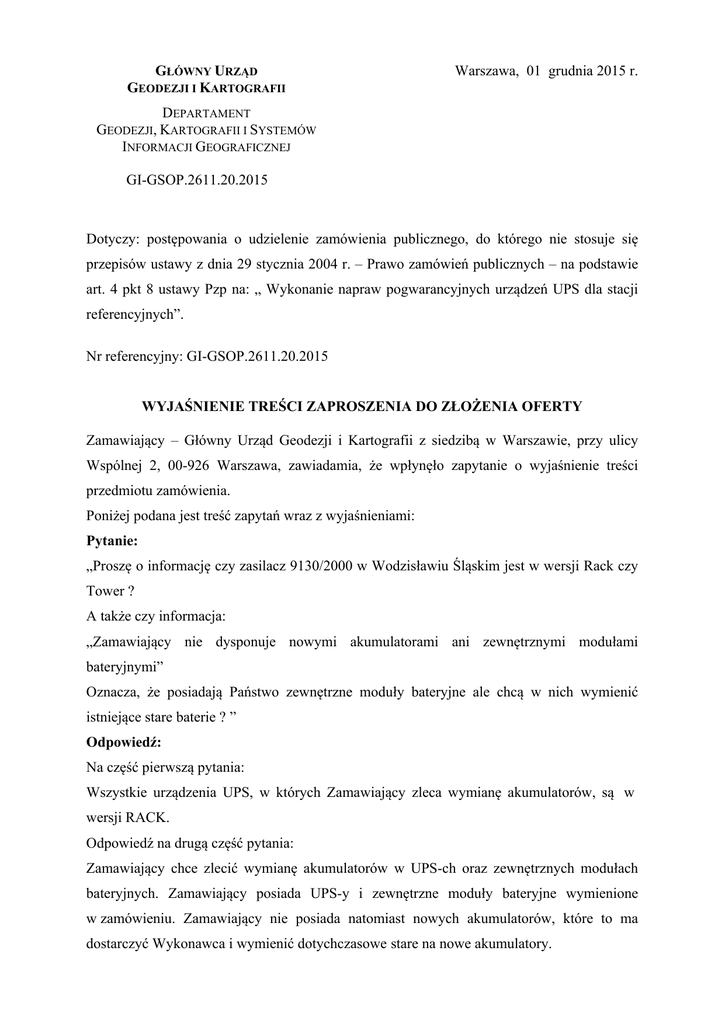 GŁÓWNY URZĄD GEODEZJI I KARTOGRAFII Warszawa, 01 grudnia 2015 r. DEPARTAMENT GEODEZJI, KARTOGRAFII I SYSTEMÓW INFORMACJI GEOGRAFICZNEJ GI-GSOP.2611.20.2015 Dotyczy: postępowania o udzielenie zamówienia publicznego, do którego nie stosuje się przepisów ustawy z dnia 29 stycznia 2004 r. – Prawo zamówień publicznych – na podstawie art. 4 pkt 8 ustawy Pzp na: „ Wykonanie napraw pogwarancyjnych urządzeń UPS dla stacji referencyjnych”. Nr referencyjny: GI-GSOP.2611.20.2015 WYJAŚNIENIE TREŚCI ZAPROSZENIA DO ZŁOŻENIA OFERTY Zamawiający – Główny Urząd Geodezji i Kartografii z siedzibą w Warszawie, przy ulicy Wspólnej 2, 00-926 Warszawa, zawiadamia, że wpłynęło zapytanie o wyjaśnienie treści przedmiotu zamówienia. Poniżej podana jest treść zapytań wraz z wyjaśnieniami: Pytanie: „Proszę o informację czy zasilacz 9130/2000 w Wodzisławiu Śląskim jest w wersji Rack czy Tower ? A także czy informacja: „Zamawiający nie dysponuje nowymi akumulatorami ani zewnętrznymi modułami bateryjnymi” Oznacza, że posiadają Państwo zewnętrzne moduły bateryjne ale chcą w nich wymienić istniejące stare baterie ? ” Odpowiedź: Na część pierwszą pytania: Wszystkie urządzenia UPS, w których Zamawiający zleca wymianę akumulatorów, są w wersji RACK. Odpowiedź na drugą część pytania: Zamawiający chce zlecić wymianę akumulatorów w UPS-ch oraz zewnętrznych modułach bateryjnych. Zamawiający posiada UPS-y i zewnętrzne moduły bateryjne wymienione w zamówieniu. Zamawiający nie posiada natomiast nowych akumulatorów, które to ma dostarczyć Wykonawca i wymienić dotychczasowe stare na nowe akumulatory. Zamawiający wprowadza zmianę w „Zaproszeniu do złożenia oferty”, poprzez skreślenie wyrazów „ani zewnętrznymi modułami bateryjnymi” w pkt II tego „Zaproszenia”. Skorygowana wersja „Zaproszenia do złożenia oferty” ma nazwę: „Zaproszenie do złożenia oferty – skorygowane”. Jednocześnie Zamawiający informuje, iż ulega zmianie termin składania ofert w wyżej wymienionym postępowaniu: termin składania ofert upływa w dniu 07.12.2015 r. o godz. 10:00. Z poważaniem, DYREKTOR Departamentu Geodezji, Kartografii i Systemów Informacji Geograficznej Jerzy Zieliński Pismo podpisane elektronicznie.