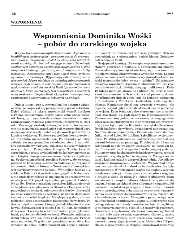 38 Głos Ziemi Urzędowskiej 2015 WSPOMNIENIA Wspomnienia Dominika Wośki – pobór do carskiego wojska W życiu Dominika nastąpiły duże zmiany. Jego rocznik kwalifikował się do wojska – zmuszony został do przerwania nauki w Ursynowie i został wcielony jako rekrut do armii carskiej. Na kartach swojego pamiętnika opisuje okoliczności poboru do wojska oraz długą podróż w głąb Rosji do Orenburga, gdzie rozpoczął odbywanie służby wojskowej. Szczegółowe opisy jego nowej drogi życiowej są bardzo interesujące. Wypełniają kilkadziesiąt stron wspomnień. Mamy nadzieję, że wzbudzą zainteresowanie naszych czytelników. Autor wspomnień był świadkiem wydarzeń ostatnich lat carskiej Rosji i przewrotów rewolucyjnych, które wstrząsnęły tym mocarstwem i otworzyły nowy rozdział w dziejach Rosji. Opisy Dominika będziemy zamieszczać sukcesywnie w kolejnych odcinkach. Dnia 2 lutego 1915 r. otrzymałem list z domu z wiadomością, że rozpoczął się przyspieszony pobór rekrutów. Dzień później na lekcję matematyki wszedł dyrektor z dwoma żandarmami, którzy kazali sobie podać dziennik lekcyjny i wynotowali z niego nazwiska i miejsce zamieszkania rodziców poborowych urodzonych w 1894 roku. Zwracając się do dyrektora, podkreślili, że ci uczniowie nie mogą już się uczyć, gdyż pod rygorem dużej kary muszą opuścić szkołę i udać się do swoich powiatów na komisję wojskową. Te słowa przyjęliśmy bez sprzeciwu, ale z wielkim niezadowoleniem. Po dzwonku po lekcji zebrała się nas gromadka składająca się z 6 uczniów. Dyskutowaliśmy nad tym, jaką obrać taktykę w dalszym naszym życiu. Pożegnałem kolegów. Trochę książek sprzedałem, a resztę wyłudzili młodsi koledzy, mówiąc, że nam książki i inne pomoce naukowe nie będą już potrzebne. Spakowałem pościel i prosiłem Sączuwę, aby te rzeczy przesłał do Urzędowa. Jeszcze się łudziłem, że otrzymam odroczenie. Dnia 4 lutego z Tomkiem Kalbarczykiem wyruszyliśmy w podróż do domu. Wykupiłem bilet za 1,7 rubla do Dęblina i dojechałem na „gapę” do Nałęczowa, a nie znalazłszy nikogo ze znajomych po przenocowaniu na stacji za 30 kopiejek wykupiłem przejazd do Lublina. Na ul. Św. Ducha w zajeździe spotkałem kilku znajomych z Urzędowa, a między innymi Starolca z Bęczyna, który przyjechał po towar do miejscowych sklepów. Przyrzekł mi, że po załadowaniu na wóz mąki podjedzie do zajazdu i zabierze mnie do Urzędowa. Minęło parę godzin, a on nie podjechał, więc postanowiłem pieszo udać się w drogę. Po drodze mijał mnie wóz, którym jechał chłop do Strzeszkowic. Skorzystałem z okazji i za 50 kop. dojechałem do tej wsi. O nocleg było bardzo trudno, gdyż było dużo ludzi, przybyłych do budowy kolei. Wreszcie trafiłem do domu byłego ławnika, który znał urzędowiaków. Przyjął mnie na nocleg. W godzinach popołudniowych dotarłem wreszcie do domu. Sołtys poradził mi, abym o odrocze- niu pomówił z Fiutem, sekretarzem gminnym. Ten mi powiedział, że z odroczeniem będzie kłopot. Żołnierzy potrzebują na front. Staję przed komisją. Na wstępie wspomniałem o przesłanym poprzednio podaniu o odroczenie mi służby. Przewodniczący komisji uśmiechnął się ironicznie i nic nie odpowiedział. Zmierzyli moją wysokość, wagę. Lekarz pobieżnie mnie obadał i odwróciwszy głowę do sekretarza, rzekł monotonnie jeden wyraz – „zdolny”. Usłyszawszy ten wyraz zapytałem: „Co z moim odroczeniem?”. Ten ręce bezradnie rozłożył. Badają drugiego delikwenta. Dnia 19 lutego mam się stawić do Lublina. Na furze z beczkami dostałem się do Szastarki, a stąd pieszo do domu. Po kilkunastu dniach znów jadę do Lublina pociągiem z Pułankowic z Piotrkiem Gozdalskim. Jedziemy bez biletów. Konduktor chciał nas wyprosić z wagonu, ale tego nie uczynił, gdyż dowiedział się od nas, że jedziemy do wojska. Dnia 9 marca zakwaterowano nas w spalonym klasztorze ks. Salezjanów na Kalinowszczyźnie. Przenocowaliśmy jedną noc na słomie, a drugiego dnia wieczorem uciekliśmy przez mur (w bramie stał wartownik) przez łąki, pola do Kraśnika, a stąd do Urzędowa. Dowiedzieliśmy się w domu, że żandarmi nas poszukują. Na drugi dzień udajemy się z Piotrusiem pieszo do Kraśnika, a stąd koleją do Lublina. Zgłosiliśmy swoje przybycie. Po kilku godzinach st. podoficer zaprowadził nas parami do katedry na przysięgę. Po obiedzie dn. 12 marca załadowali nas do wagonów „cielęcych” na bocznym torze. To wsiadanie do wagonów trwało powyżej godziny. Plutonowy przydzielał partie do każdego wagonu, rekruci przesiadali się, aby jechać ze znajomymi. Pociąg z rekrutami z Lublina ruszył w drogę około południa. Jechaliśmy wagonami towarowymi – „cielęcymi”. Wagon miał dwoje rozsuwanych drzwi i 4 małe okna bez szyb, niektóre były zakratowane. W razie mrozu wagon był opalany węglem w żelaznym piecyku. Przy piecu stało wiadro z węglem, a drugie z wodą do picia. Na jednej z dłuższych ścian wisiała mała lampka naftowa, która trochę oświetlała wagon. Pociąg ten składał się z kilkunastu wagonów. Od parowozu do ostatniego wagonu z hamulcem i hamulcowym przeciągnięta była wzdłuż wszystkich wagonów cienka linka służąca do porozumiewania się maszynisty z hamulcowym na breku. Maszynista przez pociągnięcie za linkę dawał hamulcowemu sygnały, kiedy trzeba było pociąg zatrzymać i kiedy hamulec zwolnić. Ruszyliśmy w minorowym nastroju, później już zaczęły się rozmowy, obserwacja krajobrazów, ale śpiew nam nie wychodził – brak było ześpiewania, repertuaru. Gawędy, żarty, dowcipy towarzyszyły nam przez całą podróż. Stary parowóz pamiętający jeszcze czasy Aleksandra III prychając, ciężko dysząc i skrzypiąc, ledwo dawał sobie radę 2015 Głos Ziemi Urzędowskiej z wagonami. Pociąg przystawał na każdej stacji, niekiedy stał dłuższy czas, aby