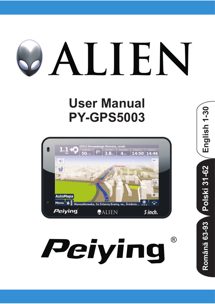 Polski 31-62 English 1-30 User Manual PY-GPS5003 Românã 63-93 ALIEN ALIEN PY-GPS5003 PY-GPS5003 User's Manual Welcome to use our GPS navigator - We are reserves the final explanation right on this User’s Manual. - Specifications are subject to change without notice. Sorry for any inconvenience caused! - Please make a copy of the important data. Factory assumes no responsibility for the data loss. - This manual has been carefully checked. Please contact our service center when any typing mistake is found. - Please read the operating instruction carefully and use the accessories only provided by the original factory to avoid any unexpected damage. No warranty will be executed if you are not following the instruction or connecting with the incompatible accessories, factory assumes no responsibility for any loss and damage caused hereby. - The electronic navigation data may be not in conformity with the actual transporting marks due to the traffic construction development. Please be sure to comply with the real road condition and follow the traffic rules. Operating and viewing the GPS during driving may cause severe traffic accident. Our company will not be responsible for any loss caused by the unexpected accident. - Users can update and upgrade software from website at his/her option. - Any discrepancy between the pictures with real products hereinafter, the real ones prevail. WWW.PEIYING.PL 1 PY-GPS5003 ALIEN Table of Contents PRODUCT INTRODUCTION 1.1 INTRODUCTION 1.2 PACKAGE CHAPTER TWO FEATURES AND SPECIFICATION 2.1 MAIN FEATURES 2.2 SPECIFICATION 2.3 PRODUCT APPEARANCE CHAPTER THREE MANUAL INSTRUCTION 3.1 POWER SUPPLY AND CHARGE 3.1.1 POWER SUPPLY 3.1.2 USE THE CHAGER TO SUPPLY POWER 3.2 POWER ON/OFF 3.2.1 POWER ON 3.2.2 POWER OFF 3.3 RESET SYSTEM 3.4 USE BRACKET TO FIX NAVAGITOR 3.5 STYLUS 3.6 T-FLASH CARD 3.7 CONNECT WITH COMPUTER CHAPTER FOURE PRIMARY FUNCTION 4.1 THE MAIN INTERFACE AND FUNCTION 4.2 NAVIGATION FUNCTION FEATURE AND OPERATION NOTES 4.3 MUSIC PLAYER OPERATION INTERFACE 4.3.1 FUNCTION FEATURE 4.3.2 OPERATION MEATHOD 4.4 VEDIO PLAYER INTERFACE 4.4.1 FUNCTION FEATURE 4.4.2 OPERATION METHOD 4.5 PHOTO VIEWER OPERATION INTERFACE 4.5.1 FUNCTION FEATURE 4.5.2 OPERATION METHOD 4.6 E-BOOK OPERATION 2 4 4 4 5 5 5 7 8 8 8 9 9 9 10 10 10 10 11 11 12 12 13 13 14 14 15 17 17 17 19 19 19 20 WWW.PEIYING.PL ALIEN 4.7 SYSTEM SETTING INTERFACE 4.7.1 BACK LIGHT SETTING 4.7.2 VOLUME ADJUST 4.7.3 LANAUGUE SETTING 4.7.4 GPS INFO 4.7.5 DATE AND TIME SETTING 4.7.6 SCREEN CALIBRATION 4.7.7 SYSTEM INFORMATION 4.7.8 DEFAULT SETTING 4.7.9 NAVIPATH CHAPTER FIVE SIMPLE PROBLEM SHOOTING AND MAINTENANCE WWW.PEIYING.PL PY-GPS5003 21 22 23 24 24 25 25 26 27 27 28 3 PY-GPS5003 ALIEN Product introduction 1.1 Introduction Welcome to use the GPS navigator, which is mainly used for navigating and also has the optional function of video playing, audio playing, Bluetooth hands free, FM, photo viewing, and E-Book etc. - High performance, low-power consumption MediaTek MT3351 CPU - Comfortable user interface: simple, easy to operate; - Power management: keep the product to work longer and more steadily; - Data transmitting: communicate with computer through USB cable; - Excellent in receiving signal: accurate position fixing provides you the satisfied navigating service; - Entertainment: MP3 and MP4 function can relieve your fatigue; You can use it when driving, walking, riding, or waiting for a meeting; the perfect “GPS + entertainment” function can make your life and work more splendid. 1.2 Package The packing box contains the following accessories, please confirm: 1. GPS navigator 2. Car charger 3. USB cable 4. User’s manual 5. Car Bracket 6. Car Cradle For the items listed above, please confirm the actual products. If any damage,please contact with the distributor or the agent as soon as possible. 4 WWW.PEIYING.PL PY-GPS5003 ALIEN Instruction Please read this user’s manual carefully to be familiar with all the operation details and to make the GPS navigator performs well: [Remark]: The instruction relates to the theme; [Relative information]: The extending information relates to the theme; [Note]:The notes and warnings relate to the theme. Please value and follow these notes, otherwise it will possibly bring damage to you and others. This user manual only adapts to our GPS navigator products. Chapter Two Features and specifications 2.1 Main features - Operating system: Microsoft Windows CE 5.0 - 4.3’’,5.0’’ TFT LCD display with resolution of 480*272 pixels - Hi-Fi stereo earphone and built-in Hi-Fi speaker, volume adjustable - Button and touch-screen operation - Built-in sensitive GPS antenna - The navigating software could run the T-FLASHSD card directly - Audio format supported :MP and WMA - Video format supported: ASF,AVI,WMV - Photo format supported: BMP,JPG - E-book format supported: TXT - MINI USB port - Built-in rechargeable Li-battery which can be powered by travel and car charger. 2.2 Specification CPU MediaTek MT3351 RAM 64 MBytes Flash memory 64 MBytes LCD display Touch-screen 5.0 inch TFT LCD display, resolution: 480RGB(H)x272(V) high-accuracy, endurable touch-screen USB USB Client 2.0, MINI USB port WWW.PEIYING.PL 5 PY-GPS5003 Card Slot Audio GPS ALIEN T-Flash card slot, the maximum capacity of TFlash Card it supports reaches to 4GB A: Built-in high fidelity speaker B: High fidelity stereo earphone Cold start: <42s Hot start: <3s(in the open area) Warm start: <36s Battery Built-in rechargeable Li-battery Battery Charging port DC 5V port Car Charger DC9-24V, 5V/ 1.5A Status of the LCD light When charging, the red light is on; when charge finished, the blue light is on. Microsoft Windows CE 5.0 Operating System Audio Player Support MPEG4, Divx 5.0, 4.0, 3.11, Xvid and MPEG2( maximum 480*272 pixels) MP3, WMA Photo viewer E-Album, JPG, GIF, BMP, PNG E-Book Viewer TXT System setting [FM Transmitter] [screen adjust] [Default set] [Volume] [Power] [Backlight] [Time and Date] [Languag