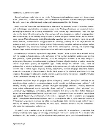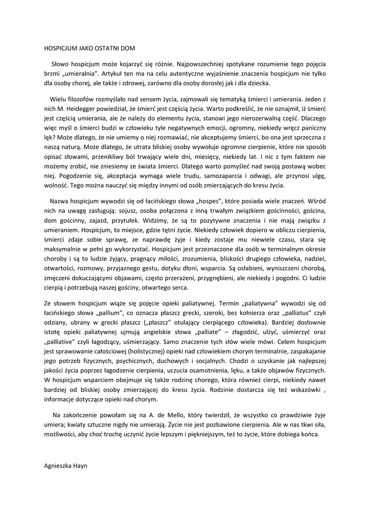 HOSPICJUM JAKO OSTATNI DOM Słowo hospicjum może kojarzyć się różnie. Najpowszechniej spotykane rozumienie tego pojęcia brzmi „umieralnia”. Artykuł ten ma na celu autentyczne wyjaśnienie znaczenia hospicjum nie tylko dla osoby chorej, ale także i zdrowej, zarówno dla osoby dorosłej jak i dla dziecka. Wielu filozofów rozmyślało nad sensem życia, zajmowali się tematyką śmierci i umierania. Jeden z nich M. Heidegger powiedział, że śmierć jest częścią życia. Warto podkreślić, że nie oznajmił, iż śmierć jest częścią umierania, ale że należy do elementu życia, stanowi jego nierozerwalną część. Dlaczego więc myśl o śmierci budzi w człowieku tyle negatywnych emocji, ogromny, niekiedy wręcz paniczny lęk? Może dlatego, że nie umiemy o niej rozmawiać, nie akceptujemy śmierci, bo ona jest sprzeczna z naszą naturą. Może dlatego, że utrata bliskiej osoby wywołuje ogromne cierpienie, które nie sposób opisać słowami, przenikliwy ból trwający wiele dni, miesięcy, niekiedy lat. I nic z tym faktem nie możemy zrobić, nie zniesiemy ze świata śmierci. Dlatego warto pomyśleć nad swoją postawą wobec niej. Pogodzenie się, akceptacja wymaga wiele trudu, samozaparcia i odwagi, ale przynosi ulgę, wolność. Tego można nauczyć się między innymi od osób zmierzających do kresu życia. Nazwa hospicjum wywodzi się od łacińskiego słowa „hospes”, które posiada wiele znaczeń. Wśród nich na uwagę zasługują: sojusz, osoba połączona z inną trwałym związkiem gościnności, gościna, dom gościnny, zajazd, przytułek. Widzimy, że są to pozytywne znaczenia i nie mają związku z umieraniem. Hospicjum, to miejsce, gdzie tętni życie. Niekiedy człowiek dopiero w obliczu cierpienia, śmierci zdaje sobie sprawę, ze naprawdę żyje i kiedy zostaje mu niewiele czasu, stara się maksymalnie w pełni go wykorzystać. Hospicjum jest przeznaczone dla osób w terminalnym okresie choroby i są to ludzie żyjący, pragnący miłości, zrozumienia, bliskości drugiego człowieka, nadziei, otwartości, rozmowy, przyjaznego gestu, dotyku dłoni, wsparcia. Są osłabieni, wyniszczeni chorobą, zmęczeni dokuczającymi objawami, często przerażeni, przygnębieni, ale niekiedy i pogodni. Ci ludzie cierpią i potrzebują naszej gościny, otwartego serca. Ze słowem hospicjum wiąże się pojęcie opieki paliatywnej. Termin „paliatywna” wywodzi się od łacińskiego słowa „pallium”, co oznacza płaszcz grecki, szeroki, bez kołnierza oraz „palliatus” czyli odziany, ubrany w grecki płaszcz („płaszcz” otulający cierpiącego człowieka). Bardziej dosłownie istotę opieki paliatywnej ujmują angielskie słowa „palliate” – złagodzić, ulżyć, uśmierzyć oraz „palliative” czyli łagodzący, uśmierzający. Samo znaczenie tych słów wiele mówi. Celem hospicjum jest sprawowanie całościowej (holistycznej) opieki nad człowiekiem chorym terminalnie, zaspakajanie jego potrzeb fizycznych, psychicznych, duchowych i socjalnych. Chodzi o uzyskanie jak najlepszej jakości życia poprzez łagodzenie cierpienia, uczucia osamotnienia, lęku, a także objawów fizycznych. W hospicjum wsparciem obejmuje się także rodzinę chorego, która również cierpi, niekiedy nawet bardziej od bliskiej osoby zmierzającej do kresu życia. Rodzinie dostarcza się też wskazówki , informacje dotyczące opieki nad chorym. Na zakończenie powołam się na A. de Mello, który twierdził, że wszystko co prawdziwie żyje umiera; kwiaty sztuczne nigdy nie umierają. Życie nie jest pozbawione cierpienia. Ale w nas tkwi siła, możliwości, aby choć trochę uczynić życie lepszym i piękniejszym, też to życie, które dobiega końca. Agnieszka Hayn