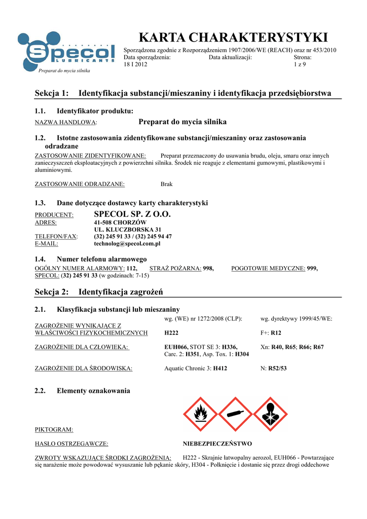 KARTA CHARAKTERYSTYKI Sporządzona zgodnie z Rozporządzeniem 1907/2006/WE (REACH) oraz nr 453/2010 Data sporządzenia: Data aktualizacji: Strona: 18 I 2012 1z9 Preparat do mycia silnika Sekcja 1: 1.1. Identyfikacja substancji/mieszaniny i identyfikacja przedsiębiorstwa Identyfikator produktu: NAZWA HANDLOWA: Preparat do mycia silnika 1.2. Istotne zastosowania zidentyfikowane substancji/mieszaniny oraz zastosowania odradzane ZASTOSOWANIE ZIDENTYFIKOWANE: Preparat przeznaczony do usuwania brudu, oleju, smaru oraz innych zanieczyszczeń eksploatacyjnych z powierzchni silnika. Środek nie reaguje z elementami gumowymi, plastikowymi i aluminiowymi. ZASTOSOWANIE ODRADZANE: 1.3. Dane dotyczące dostawcy karty charakterystyki PRODUCENT: ADRES: TELEFON/FAX: E-MAIL: 1.4. Brak SPECOL SP. Z O.O. 41-508 CHORZÓW UL. KLUCZBORSKA 31 (32) 245 91 33 / (32) 245 94 47 [email protected] Numer telefonu alarmowego OGÓLNY NUMER ALARMOWY: 112, STRAś POśARNA: 998, SPECOL: (32) 245 91 33 (w godzinach: 7-15) Sekcja 2: 2.1. POGOTOWIE MEDYCZNE: 999, Identyfikacja zagroŜeń Klasyfikacja substancji lub mieszaniny wg. (WE) nr 1272/2008 (CLP): wg. dyrektywy 1999/45/WE: H222 F+: R12 ZAGROśENIE DLA CZŁOWIEKA: EUH066, STOT SE 3: H336, Carc. 2: H351, Asp. Tox. 1: H304 Xn: R40, R65; R66; R67 ZAGROśENIE DLA ŚRODOWISKA: Aquatic Chronic 3: H412 N: R52/53 ZAGROśENIE WYNIKAJĄCE Z WŁAŚCIWOŚCI FIZYKOCHEMICZNYCH 2.2. Elementy oznakowania PIKTOGRAM: HASŁO OSTRZEGAWCZE: NIEBEZPIECZEŃSTWO H222 - Skrajnie łatwopalny aerozol, EUH066 - Powtarzające ZWROTY WSKAZUJĄCE ŚRODKI ZAGROśENIA: się naraŜenie moŜe powodować wysuszanie lub pękanie skóry, H304 - Połknięcie i dostanie się przez drogi oddechowe KARTA CHARAKTERYSTYKI Sporządzona zgodnie z Rozporządzeniem 1907/2006/WE (REACH) oraz nr 453/2010 Data sporządzenia: Data aktualizacji: Strona: 18 I 2012 2z9 Preparat do mycia silnika moŜe grozić śmiercią, H336 - MoŜe wywoływać uczucie senności lub zawroty głowy, H351 - Podejrzewa się, Ŝe powoduje raka, H412 - Działa szkodliwie na organizmy wodne, powodując długotrwałe skutki. ZWROTY WSKAZUJĄCE ŚRODKI OSTROśNOŚCI: Chronić przed dziećmi. Pojemnik pod ciśnieniem. Nie przekłuwać ani nie spalać, nawet po zuŜyciu. Przechowywać z dala od źródeł ciepła/iskrzenia/otwartego ognia/gorących powierzchni. Palenie wzbronione. Nie rozpylać nad otwartym ogniem lub innym źródłem zapłonu. Chronić przed światłem słonecznym. Nie wystawiać na działanie temperatury przekraczającej 50 oC. Unikać wdychania gazu. Stosować wymagane środki ochrony indywidualnej. W przypadku naraŜenia lub styczności: Zasięgnąć porady/zgłosić się pod opiekę lekarza. Unikać uwolnienia do środowiska. 2.3. Inne zagroŜenia Brak informacji na temat spełnienia kryteriów PBT lub vPvB Sekcja 3: 3.1. Skład/informacje o składnikach Substancje Nie dotyczy 3.2. Mieszaniny NAZWA: ZAKRES STĘśEŃ: NUMER CAS: NUMER WE: KLASYFIKACJA WG. 67/548/EWG: KLASYFIKACJA WG. 1272/2008/WE: Benzyna cięŜka hydroodsiarczona (ropa naftowa); Niskowrząca frakcja naftowa obrabiana wodorem 65-75% 64742-85-1 265-185-4 Rakotw. Kat 2: R45*, Xn: R65 Car. 1B: H350*; Asp. Tox. 1: H304 NAZWA: ZAKRES STĘśEŃ: NUMER CAS: NUMER WE: KLASYFIKACJA WG. 67/548/EWG: KLASYFIKACJA WG. 1272/2008/WE: Izobutan 17% 75-28-5 200-857-2 F+: R12 Flam. Gas 1: H220 NAZWA: ZAKRES STĘśEŃ: NUMER CAS: NUMER WE: KLASYFIKACJA WG. 67/548/EWG: KLASYFIKACJA WG. 1272/2008/WE: Tetrachloroetylen <10% 127-18-4 204-825-9 Rakotw. Kat. 3: R40, N: R51-53 Carc. 2: H351, Aquatic Chronic 2: H411 NAZWA: ZAKRES STĘśEŃ: NUMER CAS: NUMER WE: KLASYFIKACJA WG. 67/548/EWG: KLASYFIKACJA WG. 1272/2008/WE: eter monobutylowy glikolu dietylenowego <3% 112-34-5 203-961-6 Xi: R36 Eye Irrit. 2: H319 NAZWA: ZAKRES STĘśEŃ: NUMER CAS: NUMER WE: KLASYFIKACJA WG. 67/548/EWG: Diealkiloditiofosforan cynku <1% 68649-42-3 272-028-3 Xi: R38; R41, N: R51/53 KARTA CHARAKTERYSTYKI Sporządzona zgodnie z Rozporządzeniem 1907/2006/WE (REACH) oraz nr 453/2010 Data sporządzenia: Data aktualizacji: Strona: 18 I 2012 3z9 Preparat do mycia silnika KLASYFIKACJA WG. 1272/2008/WE: Skin Irrit. 2: H315, Eye Dam. 1: H318, Aquatic Chronic 2: H411 NAZWA: ZAKRES STĘśEŃ: NUMER CAS: NUMER WE: KLASYFIKACJA WG. 67/548/EWG: KLASYFIKACJA WG. 1272/2008/WE: Oksyetylowany alkohol laurylowy <0,5% 5274-68-0 226-097-1 Xi: R36/38 Eye Irrit. 2: H319, Skin Irrit.2: H315 * - benzyna cięŜka obrabiana wodorem (CAS 64742-48-9) nie została sklasyfikowana jako rakotwórcza, poniewaŜ zawiera mniej niŜ 0,1% benzenu (Nota P) Pełna treść zwrotów R i H w Sekcji 16 Sekcja 4: 4.1. Środki pierwszej pomocy Opis środków pierwszej pomocy WDYCHANIE: Zapewnić dopływ świeŜego powietrza. Jeśli oddech jest nieregularny lub nie wyczuwa się oddechu rozpocząć sztuczne oddychanie. W razie potrzeby podać tlen przez wykwalifikowany personel. W razie potrzeby natychmiast wezwać lekarza. JeŜeli poszkodowany jest przytomny zapewnić mu ciepło i bezpieczną pozycję. KONTAKT Z OCZAMI: Zanieczyszczone oczy niezwłocznie płukać ciągłym strumieniem wody, zdjąć szkła kontaktowe (jeśli są) i płukać dalej przez 15 min. Podczas przepłukiwania trzymać oczy szeroko rozwarte. W przypadku wystąpienia i utrzymywania się dolegliwości skonsultować się z lekarzem. NIE STOSOWAĆ ZBYT SILNEGO STRUMIENIA WODY, ABY UNIKNĄĆ USZKODZENIA ROGÓWKI. KONTAKT ZE SKÓRĄ: Zanieczyszczona odzieŜ niezwłocznie zdjąć. Zanieczyszczoną skórę umyć dokładnie wodą z mydłem, a następnie spłukać wodą. W przypadku pojawienia i utrzymywania się podraŜnienia skóry skonsultować się z lekarzem. POŁKNIĘCIE: 4.2. Nie wywoływać wymiotów. Przepłukać usta wodą. Skontaktować się z lekarzem. NajwaŜniejsze ostre i opóźnione objawy oraz skutki naraŜenia Nie określono 4.3. Wskazania dotyczące wszelkiej natychmiastowej pomocy lekarskiej i szczegółowego postępowania z poszkodowanym Decyzję o sposobie postępowania ratun