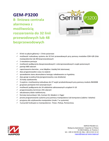 GEM-P3200 8- liniowa centrala alarmowa z możliwością rozszerzenia do 32 linii przewodowych lub 48 bezprzewodowych 8 linii na płycie głównej + 2 linie pożarowe możliwośd rozbudowy systemu do 32 linii przewodowych przy pomocy modułów EZM 4/8 i/lub manipulatorów lub 48 bezprzewodowych 2 niezależne partycje możliwośd podłączenia dwuprzewodowych i czteroprzewodowych czujek pożarowych pamięd 800 zdarzeo raportowanie alarmów , oraz błędów z każdej linii alarmowej dwa programowalne czasy na wejście sprawdzenie stanu akumulatora testując naładowanie co 4 godziny dwa gongi na jedną linię (programowalny czas działania) 32 kody użytkownika 3 wyjścia z możliwością rozbudowy do 27 wyjśd przekaźnikowych przy pomocy modułu RM3008 grupowe pomijanie linii wewnętrznych możliwośd podłączenia do 24 oddzielnie adresowanych urządzeo X-10 programowalny terminarz 255 zdarzeo wbudowany dialer telefoniczny formaty komunikacji: SIA, Contact ID, Modem 2, Pager proste programowanie systemu przy pomocy manipulatora lub komputera (zdalne i lokalne) przyjazny dla użytkownika manipulator (maks 7 w systemie) 3 przyciski funkcyjne w manipulatorze : Pożar, Policja, Pomocniczy NAPCO POLSKA S.C. Wyłączny dystrybutor i importer w Polsce 31-462 Kraków, ul. Pszona 2 tel.: +48 12 410 05 10, faks: +48 12 412 13 12 [email protected] www.napco.pl Parametry techniczne centrali Temperatura pracy Zasilanie Napięcie zasilania linii alarmowych Obciążalnośd pętli Maksymalna dopuszczalna rezystancja pętli Wyjścia przekaźnikowe Zasilanie wyjścia AUX Zdalnie sterowane wyjście Maksymalny pobór prądu w trakcie czuwania dla zasilania rezerwowego Czas podtrzymania linii alarmowych/pożarowych Pobór prądu przez moduły EZM Pobór prądu przez manipulatory Maksymalna liczba manipulatorów Wymiary (wys. x szer. x gł.) o 0 do +50 C 16.5 V AC, klasa 2, zasilacz 40VA 10-13VDC 2.5mA przy rezystorze terminującym 2.2 ohm (EOL 2.2K), 5mA dla 2-przewodowych czujek dymu maks. 300W, 50W przy 2-przewodowych czujkach dymu burglary; reset; aux): wet, 1 2Vdc, 1.2A max.; dry (cut related jumper for dry contacts), SPDT contacts 24Vdc, 2A, 0: 6 PF 12 VDC 12 VDC 650mA min. 4 godziny GEM-EZM8: wejście, 50mA (włczając wyjście PGM); wyjście PGM : 5mA, 12V GEM-RP1CAe2: 100mA; 35mA przy wyłączonym podświetleniu klawiszy (W1, W2 & W3); wyjście PGM: 5mA, 12V 7 11.1 cm x 14.9cm x 2.7cm NAPCO POLSKA S.C. Wyłączny dystrybutor i importer w Polsce 31-462 Kraków, ul. Pszona 2 tel.: +48 12 410 05 10, faks: +48 12 412 13 12 [email protected] www.napco.pl Funkcje komunikatora Zgodnośd z głównymi formatami transmisji takimi jak: 4/2, SIA , CONTACT ID, Modem 2, 4/3/1, 4+2 Wybieranie tonowe, impulsowe oraz tonowe a impulsowe jako powtórne Raport zapasowy, podwójne raportowanie, raportowanie dzielone Trzy 20-cyfrowe numery telefonów Raportowanie uzbrojenia/rozbrojenia dla każdego użytkownika Programowalny czas opóźnienia raportu o braku zasilania AC Monitorowanie linii telefonicznej z programowalnym opóźnieniem raportowania Funkcja Pagera Funkcje manipulatora Polski Język na wyświetlaczu LCD, konwencjonalne diody LED , brzęczyk Możliwośd podłączenia do siedmiu manipulatorów w systemie Przyciski Pożar, Policja oraz Pomocniczy Wbudowane 4 liniowe rozszerzenie linii EZM w klawiaturach GEM-RP1CAe2 i GEM-K1CA wyświetlanie naruszonych linii, diagnostyka usterek Składniki Systemu GEM-P3200EX Centrala Alarmowa włamaniowo-pożarowa GEM-RP1CAe2 Alfanumeryczny manipulator LCD(włamaniowo-pożarowy) 32 znakowy wyświetlacz, 4 linie EOL GEM-RP2ASe2 Manipulator LCD (włamaniowo-pożarowy), linia napadowa GEM-RP3DGTL Manipulator włamaniowo-pożarowy GEM-K1CA Alfanumeryczny manipulator LCD(włamaniowo-pożarowy) 32 znakowy wyświetlacz , 4 linie EOL GEM-K2AS Manipulator LCD (włamaniowo-pożarowy), linia napadowa GEM-K3DGTL Manipulator włamaniowo-pożarowy GEM-K4RF Ikonowy manipulator( włamaniowo-pożarowy) z wbudowanym odbiornikiem radiowym GEM-K4 Ikonowy manipulator włamaniowo-pożarowy Opcjonalne akcesoria GEM-EZM8 8 liniowy Moduł Rozszerzenia Linii GEM-EVA 1 Generator Komunikatów LIBRA -RECV8 8 liniowy odbiornik bezprzewodowy LIBRA -RECV16 16 liniowy odbiornik bezprzewodowy LIBRA -RECV96 96 liniowy odbiornik bezprzewodowy LIBRA-TRANS Kontaktron bezprzewodowy LIBRA-KEYF Pilot Wielofunkcyjny NAPCO POLSKA S.C. Wyłączny dystrybutor i importer w Polsce 31-462 Kraków, ul. Pszona 2 tel.: +48 12 410 05 10, faks: +48 12 412 13 12 [email protected] www.napco.pl LIBRA-SMK LIBRA-PIR LIBRA-GB GEM-RS232 GEM-X10KIT GEM-OUT8 RM3008 M278 PS3002 EOL2.2K EOL3.9K EOL4.7K FT2200 RB1000 RBATH1 RPB-3 TRF11 TRF14 WL1 VERI-PHONE PCD3000 PCD-WINDOWS PCI2000/3000 PCI-MINI W834-1 Ol193 Ol192 Ol249 Ol280 Ol281 OI283 WI1178 WI1179 WI1386 WI1387 WI1388 WIZARD IIe Bezprzewodowa Czujka Pożarowa Bezprzewodowa Czujka PIR Bezprzewodowa Czujka Zbicia Szyby Interfejs RS232 Interfejs do modułu X-10 Moduł 8 wyjśd tranzystorowych Moduł 8 wyjśd przekaźnikowych Moduł Line-Reversal Moduł Zasilacza , 13.2 VDC, 1.9A Rezystor Kooca Linii, 2.2 k Ohm Rezystor Kooca Linii, 3.9 k Ohm dla dublowania linii Rezystor Kooca Linii, 4.7 k Ohm Nadzorowany moduł kooca linii (pożarowy) Przekaźnik pojedynczy 12Vdc Przewody akumulatorowe Uniwersalna podstawa montażowa manipulatora Transformator, 16.5Vac/40VA, Klasa 2 Transformator, 16.5Vac/50VA, Klasa 2 Przewód podłączeniowy wyjście LUG na płycie centrali Moduł Weryfikacji Audio Oprogramowanie do komunikacji centrali z Komputerem klasy PC (pod DOS’a) Oprogramowanie do Łączenia Centrali z Komputerem klasy PC (pod WINDOWS’a) Interfejs podłączeniowy centrale z komputerem Interfejs do Notebook’a Przewód do Manipulatora (0,5m) Instrukcja Obsługi GEM-RP1CAe2 Instrukcja Obsługi GEM-RP2ASe2 Instrukcja Obsługi GEM-RP3DGTL Instrukcja Obsługi GEM-K2AS Instrukcja Obsługi GEM-K3DGTL Instrukcja Obsługi GEM-K4 & K4RF Instrukcja instalacji GEM-K4 Instrukcja instalacji GEM-K4RF Inst