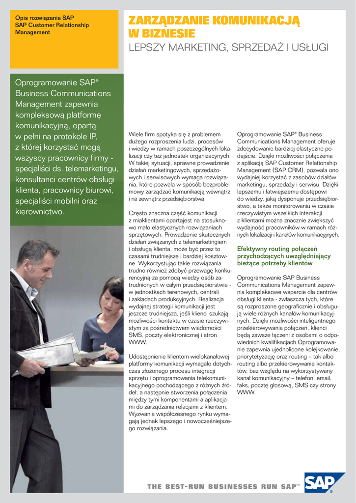 Opis rozwiązania SAP SAP Customer Relationship Management ZARZĄDZANIE KOMUNIKACJĄ W BIZNESIE LEPSZY MARKETING, SPRZEDAŻ I USŁUGI Oprogramowanie SAP® Business Communications Management zapewnia kompleksową platformę komunikacyjną, opartą w pełni na protokole IP, z której korzystać mogą wszyscy pracownicy firmy specjaliści ds. telemarketingu, konsultanci centrów obsługi klienta, pracownicy biurowi, specjaliści mobilni oraz kierownictwo. Wiele firm spotyka się z problemem dużego rozproszenia ludzi, procesów i wiedzy w ramach poszczególnych lokalizacji czy też jednostek organizacynych. W takiej sytuacji, sprawne prowadzenie działań marketingowych, sprzedażowych i serwisowych wymaga rozwiązania, które pozwala w sposób bezproblemowy zarządzać komunikacją wewnątrz i na zewnątrz przedsiębiorstwa. Często znaczna część komunikacji z miaklientami opartajest na stosuknowo mało elastycznych rozwiązaniach sprzętowych. Prowadzenie skutecznych działań związanych z telemarketingiem i obsługą klienta, może być przez to czasami trudniejsze i bardziej kosztowne. Wykorzystując takie rozwiązania trudno również zdobyć przewagę konkurencyjną za pomocą wiedzy osób zatrudnionych w całym przedsiębiorstwie w jednostkach terenowych, centrali i zakładach produkcyjnych. Realizacja wydajnej strategii komunikacji jest jeszcze trudniejsza, jeśli klienci szukają możliwości kontaktu w czasie rzeczywistym za pośrednictwem wiadomości SMS, poczty elektronicznej i stron WWW. Oprogramowanie SAP® Business Communications Management oferuje zdecydowanie bardziej elastyczne podejście. Dzięki możliwości połączenia z aplikacją SAP Customer Relationship Management (SAP CRM), pozwala ono wydajniej korzystać z zasobów działów marketingu, sprzedaży i serwisu. Dzięki lepszemu i łatwiejszemu dostępowi do wiedzy, jaką dysponuje przedsiębiorstwo, a także monitorowaniu w czasie rzeczywistym wszelkich interakcji z klientami można znacznie zwiększyć wydajność pracowników w ramach różnych lokalizacji i kanałów komunikacyjnych. Efektywny routing połączeń przychodzących uwzględniający bieżące potrzeby klientów Oprogramowanie SAP Business Communications Management zapewnia kompleksowe wsparcie dla centrów obsługi klienta - zwłaszcza tych, które są rozproszone geograficznie i obsługują wiele różnych kanałów komunikacyjnych. Dzięki możliwości inteligentnego przekierowywania połączeń, klienci będą zawsze łączeni z osobami o odpowiednich kwalifikacjach.Oprogramowanie zapewnia ujednolicone kolejkowanie, Udostępnienie klientom wielokanałowej priorytetyzację oraz routing – tak albo platformy komunikacji wymagało dotych- routing albo przekierowywanie kontakczas złożonego procesu integracji tów, bez względu na wykorzystywany sprzętu i oprogramowania telekomunikanał komunikacyjny – telefon, email, kacyjnego pochodzącego z różnych źró- faks, pocztę głosową, SMS czy strony deł, a następnie stworzenia połączenia WWW. między tymi komponentami a aplikacjami do zarządzania relacjami z klientem. Wyzwania współczesnego rynku wymagają jednak lepszego i nowocześniejszego rozwiązania. Operatorzy centrów obsługi klienta mogą być elastycznie włączani do systemu przy wykorzystaniu komputera z dostępem do siecisieci, standardowego telefonu lub urządzenia mobilnego niezależnie od miejsca, w jakim się znajdują. Zapytanie klienta może zostać przetransferowane dowłaściwego operatora wraz z niezbędnym kompletem iinformacji (zarówno o samym kliencie jak i na temat historii dotychczasowych kontaktów) z nim). Dzięki natychmiastowego dostępowi do tych danych znacznie więcej problemów może zostać rozwiązanych już przy pierwszym kontakcie, rzadziej też są potrzebne konsultacje.W pełni zintegrowane funkcje oprogramowania SAP Business Communications Management i aplikacji SAP CRM pozwalają kierować przychodzące połączenia do tych osób, które mogą najsprawniej odpowiedzieć na pytania i rozwiązać problemy. Operatorzy mogą sprawdzić dostępność odpowiednich specjalistów w całym przedsiębiorstwie i połączyć się z nimi w trybie konferencyjnym. Mogą również przekierować połączenia do innych pracowników, niezależnie od tego, czy pracownicy ci znajdują się w biurze, czy w terenie. Dzięki temu przedsiębiorstwo może natychmiast wydajnie reagować na różnorodneoczekiwania klientów. Dzięki zastąpieniu tradycyjnego sprzętu telekomunikacyjnego oprogramowaniem SAP Business Communications Management, możliwe jest zwiększenie wydajności komunikacji z klientami oraz obniżenie całkowitego kosztu posiadania takiej infrastruktury. Globalne planowanie kampanii marketingowych Kampanie sprzedażowe i telemarketingowe wymagają wydajnych i skutecznych narzędzi do ich planowania i realizacji. Oprogramowanie SAP Business Communications Management daje większą kontrolę nad procesami telemarketingu i upraszcza dostosowywanie tych procesów do dynamicznie zmieniających się potrzeb rynku. Integracja rozwiązania SAP BCM i SAP CRM Zintegrowane rozwiązania SAP Business Communications Management i SAP CRM ułatwiają planowanie kampanii telemarketingowych i pozwalają realizować je w formie pojedynczego programu, łączącego wiele ośrodków i działów sprzedaży. Współpraca tych dwóch rozwiązań umożliwia tworzenie grup docelowych,przyjmowanie zamówień, zarządzanie kontaktami oraz prowadzenie działań telesprzedażowych również podczas pracy poza biurem. W ramach jednego rozwiązania dostępna jest funkcjonalność związana z obsługą połączeń przychodzących i wychodzących. Pozwala to na automatyczną zmianę przypisania operatorów z obsługi połączeń wychodzących na przychodzące po osiągnięciu założonych celów Zarządzanie komunikacją w przedsiębiorstwie SAP Business Communications Management może stanowić podstawę funkcjonowania komunikacji w 