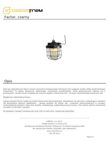 Factor, czarny Opis Dom jak laboratorium? Biuro niczym pracownia kreatywnego fachowca? Jak osiągnąć modny efekt wnętrzarskiego industrialu? To łatwe! Wystarczy udekorować mieszkanie przedmiotami, które jednoznacznie kojarzą się z przemysłem. Lampa Factor wygląda jak żywcem wyjęta z fabrycznej hali – do stylu industrialnego pasuje jak ulał. Wyjątkowo industrialna lampa. Lampa wisząca Factor chełpi się swoim fabrycznym pochodzeniem. Zawieszona na łańcuchu i połyskująca metalem nie pozostawia żadnych wątpliwości – pasuje zarówno do loftów, jak i mieszkań zaaranżowanych w surowej, mieszczańskiej estetyce. Daje silne światło, rozświetlając najbardziej ponure ściany, choć równie dobrze prezentuje się także na tle bieli i szarości. W zestawie z lampą 2 karabińczyki oraz 120 cm łańcucha. Lampa bez podsufitki. ----------------------------------------------------------------------------------------------------------------------------------LARB Sp. z o.o. S.K.A. 40-862 Katowice, ul. Gliwicka 275 Sąd Rejonowy dla Katowice-Wschód w Katowicach, VIII Wydział Gospodarczy KRS NIP: 6342817919 | REGON: 243235887 | KRS: 0000457871 www.customform.pl (32) 700 18 01 Page 1/2 Uwaga! Wybierz kolor, który najbardziej Ci odpowiada! Dostępna kolorystyka produktu w próbniku "RAL-paleta kolorów”. Czas oczekiwania na wybrany kolor przy dostępności wyrobu - 3 tygodnie. Specyfikacja Wysokość 34 cm Gwint żarówki E27 Moc żarówki max 60W Ilość żarówek 1 Żarówka w komplecie nie Materiał metal malowany proszkowo Średnica klosza 25 cm Dodatkowe zdjęcia ----------------------------------------------------------------------------------------------------------------------------------LARB Sp. z o.o. S.K.A. 40-862 Katowice, ul. Gliwicka 275 Sąd Rejonowy dla Katowice-Wschód w Katowicach, VIII Wydział Gospodarczy KRS NIP: 6342817919 | REGON: 243235887 | KRS: 0000457871 www.customform.pl (32) 700 18 01 Page 2/2 Powered by TCPDF (www.tcpdf.org)