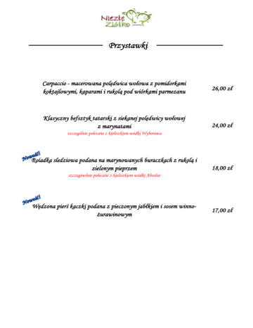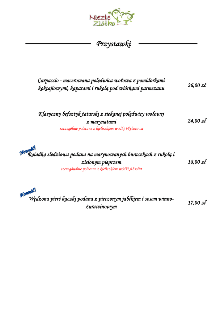 Przystawki Carpaccio - macerowana polędwica wołowa z pomidorkami koktajlowymi, kaparami i rukolą pod wiórkami parmezanu 26,00 zł Klasyczny befsztyk tatarski z siekanej polędwicy wołowej z marynatami 24,00 zł szczególnie polecane z kieliszkiem wódki Wyborowa Roladka sledziowa podana na marynowanych buraczkach z rukolą i zielonym pieprzem 18,00 zł szczegówlnie polecane z kieliszkiem wódki Absolut Wędzona pierś kaczki podana z pieczonym jabłkiem i sosem winnożurawinowym 17,00 zł Sałatki Sałatka Grecka - bukiet sałat, pomidor, ogórek , cebula czerwona, ser feta, oliwki, sos vinaigrette Sałatka z marynowaną pomarańczą - bukiet sałat, marynowana pomarańcza, grillowany kurczak , słonecznik, orzechy włoskie, sos vinaigrette lub jogurtowo czosnkowy 19,00 zł 24,00 zł szczególnie polecane z winem Roccamea Toscana Bianco Sałatka Caprese - mozzarella, świeża bazylia, pomidor, ocet balsamiczny i czosnkowa oliwa 16,00 zł Sałatka z wędzoną kaczką - bukiet sałat, pierś z kaczki, warzywa glazurowane, sos gorgonzola 26,00 zł szczególnie polecane z winem Maestri Cantinieri Rosso Zupy Rosół ze swojskim makaronem i świeżą pietruszką 8,00 zł Barszcz czerwony czysty 6,00 zł Barszcz czerwony z domowymi kołdunami 9,00 zł Krem z cebuli podawany z grzankami, serem i świeżą pietruszką 9,00 zł Żurek śląski z jajkiem podany z pieczywem czosnkowym 9,00 zł Żurek śląski podany w kociołku z gniecionymi ziemniakami 12,00 zł Krem z grzybów leśnych z grzankami i świeżą pietruszką Krem z pomidorów ześwieżą bazylią, śmietaną i chrupiącymi bułeczkami 12,00 zł 11,00 zł Makarony Peperade ze szpinakiem - makaron penne, szpinak , szynka parmeńska, pomidory suszone na słońcu, gorgonzola, sos śmietanowy, parmezan 23,00 zł szczególnie polecane z winem Maestri Cantinieri Rosso Farfalle z suszonymi pomidorami - makaron farfalle, pomidory suszone na słońcu, świeża bazylia, parmezan, oliwa Carbonara - makaron spaghetti, boczek wędzony, sos śmietanowy, parmezan, żółtko jaja, pietruszka zielona 17,00 zł 20,00 zł szczególnie polecane z winem Maestri Cantinieri Bianco Tagliatelle z łososiem, szparagami i nutką białego wina - makaron tagliatelle, filet z łososia, szparagi, pietruszka zielona, sos śmietanowy, parmezan 24,00 zł Zestawy Obiadowe Drób Rumiana pierś z kaczki Confit podana z ziemniakami gratin, buraczkami duszonymi w winie, miodzie i tymianku Pierś z kurczaka z zielonymi szparagami i białym winem podana na rostii w towarzystwie pomidorów marynowanych w czosnku i miodzie Grillowana pierś z kurczaka na szpinaku duszonym w śmietanie podana z ziemniakami gratin i rozmarynem 39,00 zł 29,00 zł 26,00 zł Grilowana pierś z kurczaka z szynką parmeńską i wędzonym serem, podana z pieczonymi ziemniakami, brokułami i masłem migdałowym 34,00 zł Pierś z kurczaka na parze z bukietem gotowanych warzyw i ryżem 25,00 zł Wołowina - Cielęcina Rolada Śląska podana z kluskami i kapustą czerwoną na ciepło 34,00 zł szczególnie polecane z piwem lanym Tyskie Placek "Niezłe Ziółko" podany z gulaszem wołowym i zestawem surówek 28,00 zł Stek z polędwicy w sosie borowikowym z nutą whiski, kluseczkami ziołowymi podany z fasolką szparagową 59,00 zł szczególnie polecane z winem Roccamea Toscana Rosso Kawałki pieczonej cielęciny podane w sosie z zielonego pieprzu z ziemniakami puree i zielonymi szparagami Sznycel cielęcy na "cały talerz" podany na carpaccio z buraczków w towarzystwie marchewkowego puree 38,00 zł 36,00 zł szczególnie polecane z piwem Książęce Ciemne Łgodne Kociołek wołowy pełen smaków podany z pieczywem 18,00 zł Wieprzowina Grillowana polędwiczka podana na podgrzybkach z cebulką, zieloną pietruszką, kluseczkami ziołowymi i kapustą czerwoną na ciepło 38,00 zł Sznycel wieprzowy na grzance, zapiekany z pieczarkami i serem camembert podany z frytkami i zestawem surówek 29,00 zł szczególnie polecane z piwem Dębowe Mocne Tradycyjny kotlet schabowy z kapustą z grzybami i ziemniakami puree 26,00 zł Pieczone golonko faszerowane kapustą i grzybami w sosie warzywnym, podane z młodymi ziemniaczkami 34,00 zł szczególnie polecane z piwem Książęce Złote Pszeniczne Ryby Dorsz bałtycki w sosie musztardowo-miętowym podany na rumianym toście w towarzystwie blanszowanego szpinaku 29,00 zł Filet z sandacza duszony w pieczarkach, śmietanie i białym winie podany z gotowanymi ziemniakami i bukietem warzyw 44,00 zł szczególnie polecane z winem Roccamea Toscana Bianco Filet z łososia z pieca podany na szpinaku z imbirowym ryżem szczególnie polecane z winem Maestri Cantinieri Bianco Filet z łososia podany z brokułami i delikatnym sosem jogurtowo koperkowym 38,00 zł 36,00 zł Klasyczne wariacje "Niezłego Ziółka" Pierogi ruskie 14,00 zł Pierogi z mięsem 15,00 zł Placki ziemniaczane z sosem grzybowym szczególnie polecane z piwem Lech Ratatouille w towarzystwie placków ziemniaczanych i białej mozzarelli 17,00 zł 18,00 zł szczególnie polecane z piwem Grolsch Premium Lager Naleśniki z fetą i szpinakiem, podane z sosem jogurtowo czosnkowym 17,00 zł Dodatki kluski śląskie 6,00 zł ziemniaki z wody 5,00 zł ziemniaki puree 5,00 zł frytki 6,00 zł ziemniaki opiekane z ziołami 6,00 zł ryż 5,00 zł kapusta zasmażana 6,00 zł kapusta czerwona na ciepło 6,00 zł brokuły z masłem migdałowym 7,00 zł bukiet warzyw z wody 7,00 zł buraczki tradycyjne 5,00 zł surówka z marchewki z chrzanem 5,00 zł surówka z białej kapusty 5,00 zł surówka z kiszonej kapusty 5,00 zł zestaw surówek 8,00 zł musztarda, chrzan, majonez, sos pomidorowy, sos czosnkowy, pieczywo, masło 2,00 zł Coś dla małych smakoszy Zupa pomidorowa z makronem lub ryżem 8,00 zł Kotlet z kurczaka podany z chrupiącymi frytkami i mizerią 16,00 zł Makaronowe kokardki z białym serem, masełkiem i soczystymi truskawkami 14,00 zł Miś ( lody o smaku: truskawkowym i waniliowym, żelki owocowe, l