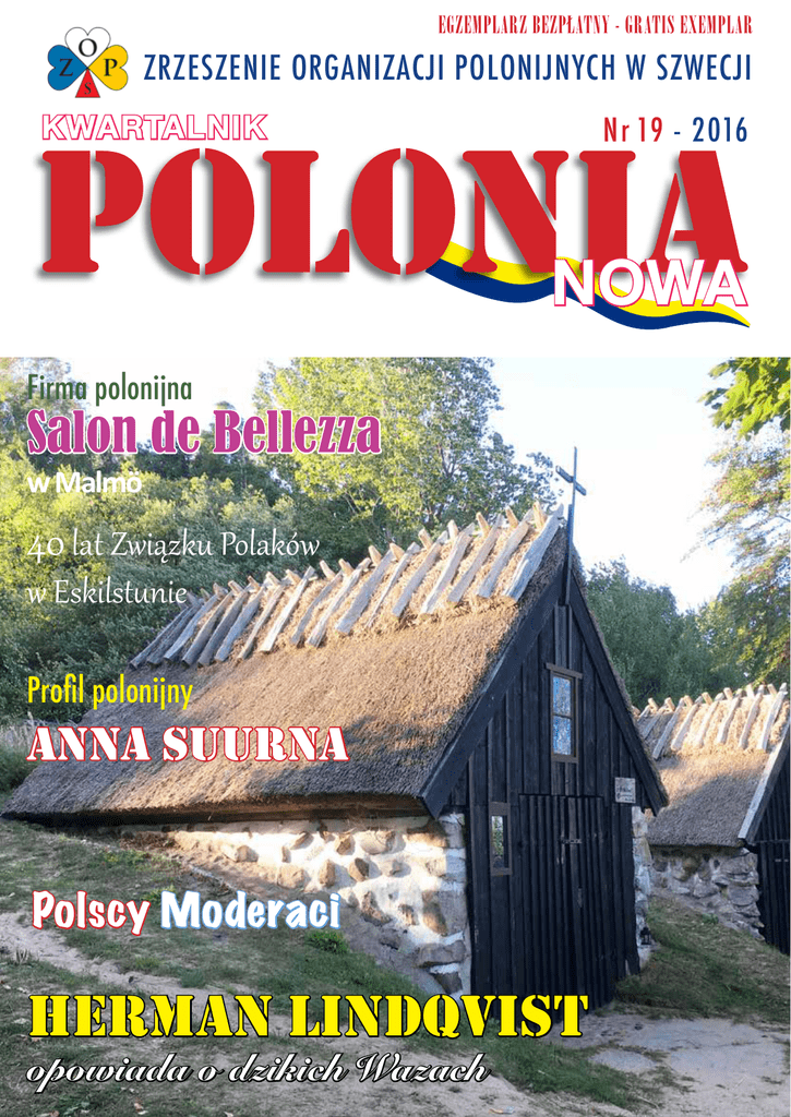 EGZEMPLARZ BEZPLATNY - GRATIS EXEMPLAR ZRZESZENIE ORGANIZACJI POLONIJNYCH W SZWECJI KWARTALNIK Nr 19 - 2016 NOWA Firma polonijna Salon de Bellezza w Malmö 40 lat Związku Polaków w Eskilstunie Profil polonijny ANNA SUURNA Polscy Moderaci Herman Lindqvist opowiada o dzikich Wazach K W A R TA L N I K NOWA Okładka: W tym numerze: Knäbäckshusen w Österlen w płd. Szwecji. W starej szopie rybackiej przy plaży mieści się kaplica św. Mikołaja, popularne miejsce ślubów i chrztów. Zdjęcie: Teresa Sygnarek Dzień Polski w Malmö - Polen Dag Redaktor naczelny: 40 jubileusz Związku Polaków w Eskilstunie 6 Polska Föreningen i Eskilstuna firar 40 år 7 Teresa Sygnarek [email protected] str. 4 Opracowanie graficzne i skład: Wywiad z Hermanem Lindqvistem Intervju med Herman Linqvist 10 Zespół redakcyjny: 25-lecie polskiego harcerstwa w Sztokholmie 25 år av polsk scuting i Stockholm Profil pod lupą - Anna Suurna Profil i närbild - Anna Suurna Polonijne firmy: de Belezza w Malmö Polska firmor: de Belezza i Malmö 12 13 Konkurs „Świat na tak” 17 Polityczna inicjatywa Polaków w Malmö Polackernas politiska initiativ i Malmö 18 19 Kabaret Linoskoczka 20 Wirus w mediach Muzeum Polaków ratująch Żydów Museum för Polacker som räddade Judar 21 „Dżungla” 26 Teresa Sygnarek Maria Olsson, [email protected] Tadeusz Adam Pilat, [email protected] Janusz Szkwarek, [email protected] Paulina Kusz, [email protected] Danuta Zasada, [email protected] Zamówienie prenumeraty: [email protected] Zamówienie ogłoszeń: [email protected] Kwartalnik w internecie: www.polonia-zop.eu Wydawca nie ponosi odpowiedzialności za treść i formę ogłoszeń i reklam. Zastrzegamy sobie prawo do redagowania i skracania nadesłanych tekstów. Nie odsyłamy nie zamówionych materiałów. Przedsięwzięcie jest współfinansowane przez Stowarzyszenie Wspólnota Polska ze środków otrzymanych od Kancelarii Senatu w ramach sprawowania opieki Senatu Rzeczypospolitej Polskiej nad Polonią i Polakami za granicą. Chcesz dostawać kwartalnik Polonia Nowa bezpośrednio na swój adres? ZAMÓW PRENUMERATĘ! Kwartalnik Polonia Nowa zarejestrowany jest w Urzędzie Patentowym, (Patent- och Registreringsverket, PRV). POLONIA NOWA wrzesień 2016 Wyślij wiadomość na adres: [email protected] i wpłać 100 kr za wysyłkę 4 numerów na Plusgiro: 92 63 09 - 6 8 9 11 14 15 22 23 3 DRODZY CZYTELNICY TERESA SYGNAREK Prezes Zrzeszenia Organizacji Polonijnych w Szwecji Skończyło się lato, które w tym roku nie przypominało szwedzkiego lata, raczej lato z krajów południowych. A w lecie zorganizowałiśmy Dzień Polski w Malmö i pomimo tej słonecznej i gorącej pogody, Polacy odwiedzili Dzień Polski w ilości dwa razy większej niż w poprzednim roku. Cieszymy się z tego, ale w takich sytuacjach ogarnia mnie równocześnie smutek i frustracja, kiedy pomyślę ile moglibyśmy zaoferować Polonii w południowej Szwecji, gdybyśmy mieli własny Dom Polonii... Są także inne powody do zadowolenia. Rząd polski, w swoim planie wspólpracy z Polonią, od dawna zachęcał do stymulowania aktywności politycznej Polonii w krajach zamieszkania. Jak dotychczas Polacy za granicą wykazywali niski poziom aktywności społecznej w obszarze poltycznym. I wreszcie mamy szansę zaistnieć w szwedzkiej polityce dzięki inicjatywie w Malmö, gdzie powstał polski oddział partii Moderaterna. Zrzeszenie przygotowuje się obecnie do III Europejskiego Forum Mediów Polonijnych, które odbędzie się w październiku, w Warszawie i w Pułtusku przy współpracy ze Stowarzyszeniem „Wspólnota Polska” i Europejską Unią Wspólnot Polonijnych. Patronat honorowy objął Marszałek SenatuRP, Stanisław Karczewski, a TVP Polonia patronat medialny. Zrzeszenie jest inicjatorem i głównym organizatorem spotkań polonijnych dziennikarzy i redaktorów z całej Europy. Z redakcyjnymi pozdrowieniami I somras organiserade Polska Riksförbundet Polen Dag i Malmö och trots det fina vädret, besöktes detta arrangemang av dubbelt så många personer som förra året. Det finns också andra skäl till belåtenhet. Den polska regeringen, i sin samarbetsplan med polackerna utomlands, har länge uppmuntrat till politisk aktivitet bland polacker i de länder där de är bosatta. Hittills har polackerna i Sverige visat en låg nivå av politisk engagemang. Och äntligen har vi en chans att bli närvarande i svensk politik tack vare ett initiativ i Malmö där man har grundat ett polskt nätverk hos partiet Moderaterna. Polska Riksförbundet förbereder just nu III Europeiskt Forum för polska medier utomlands som ska äga rum i Polen i oktober. Riksförbundet är initiativtagare och huvudarrangör av dessa sammankomster för polska journalister och redaktörer verkande utomlands. Organizacje, które pragną przyłączyć się do Zrzeszenia Organizacji Polonijnych w Szwecji, prosimy o kontakt mailem na adres: [email protected] 4 REPORTAŻ DNI POLSKIE DZIEŃ POLSKI W MALMÖ sobota ZRZESZENIE ORGANIZACJI POLONIJNYCH W SZWECJI Wstęp wolny! 12.00 - 15.30 12.15 – 13.00 13.00 – 14.00 14.00 – 14.30 15.00 15.30 Dla Polonii w Malmö 11 czerwca Limhamns Folketshus, Linnégatan 61 DLA DZIECI – Teatrzyk, zabawa, loteria „Czerwony kapturek” - występ najmłodszej grupy „Kwiatów Polskich”. Zabawa - dla dzieci gra DJ Mario Unity Line, malowanie twarzy, tańce ludowe „Kwiaty Polskie”, łowienie prezentów na wędkę. Pokaz mody dla dzieci - Studio Matylda. Śpiewa Inez - młody talent polski z Växjö, Modern dance group - „Kwiaty Polskie”. LOTERIA - 1:e losowanie! Kuchnia polska, polskojęzyczne stoiska informacyjne, pokaz mody, występy wokalne, liczne atrakcje dla dzieci i dorosłych oraz zabawa dla wszystkich - to była tegoroczna oferta organizatorów Dnia Polskiego w Malmö. 12.00 - 17.00 „Warto wiedzieć mieszkając w Szwecji” Wstęp wolny! A” RTOWY P PO B „ORLE T LU KOl• Wydział Konsularny Ambasady RP w Sztokholmie, ZUS,