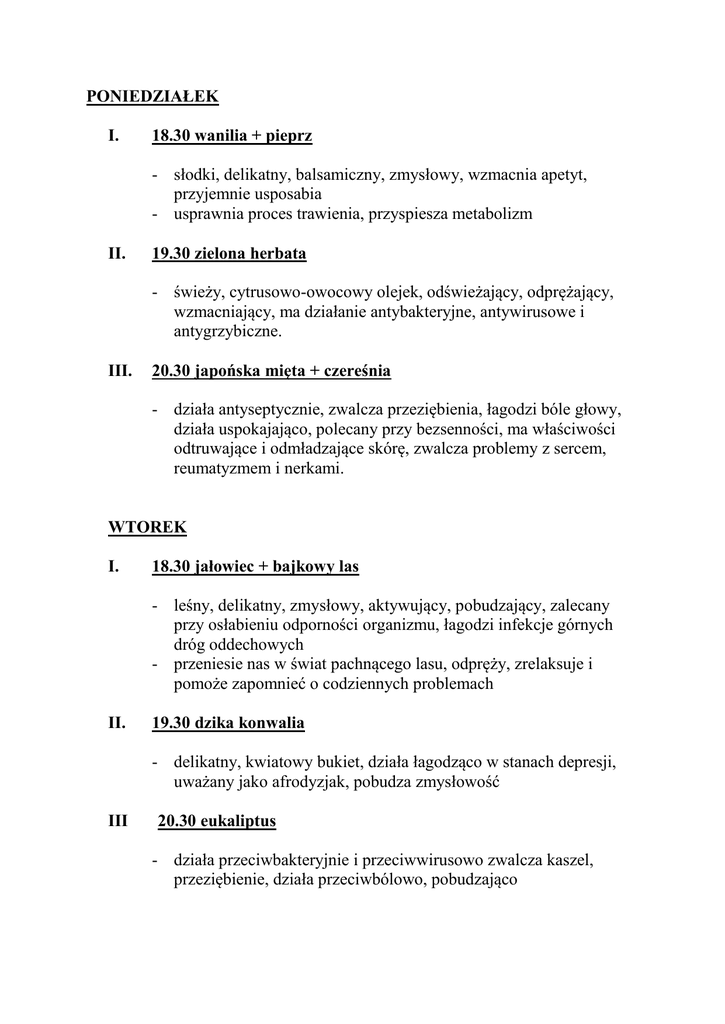PONIEDZIAŁEK I. 18.30 wanilia + pieprz - słodki, delikatny, balsamiczny, zmysłowy, wzmacnia apetyt, przyjemnie usposabia - usprawnia proces trawienia, przyspiesza metabolizm II. 19.30 zielona herbata - świeży, cytrusowo-owocowy olejek, odświeżający, odprężający, wzmacniający, ma działanie antybakteryjne, antywirusowe i antygrzybiczne. III. 20.30 japońska mięta + czereśnia - działa antyseptycznie, zwalcza przeziębienia, łagodzi bóle głowy, działa uspokajająco, polecany przy bezsenności, ma właściwości odtruwające i odmładzające skórę, zwalcza problemy z sercem, reumatyzmem i nerkami. WTOREK I. 18.30 jałowiec + bajkowy las - leśny, delikatny, zmysłowy, aktywujący, pobudzający, zalecany przy osłabieniu odporności organizmu, łagodzi infekcje górnych dróg oddechowych - przeniesie nas w świat pachnącego lasu, odpręży, zrelaksuje i pomoże zapomnieć o codziennych problemach II. 19.30 dzika konwalia - delikatny, kwiatowy bukiet, działa łagodząco w stanach depresji, uważany jako afrodyzjak, pobudza zmysłowość III 20.30 eukaliptus - działa przeciwbakteryjnie i przeciwwirusowo zwalcza kaszel, przeziębienie, działa przeciwbólowo, pobudzająco ŚRODA I. 18.30 kokos + japońska mięta - słodki, balsamiczny, wycisza, uspokaja, odpręża - działa antyseptycznie, zwalcza przeziębienia, łagodzi bóle głowy, działa uspokajająco, polecany przy bezsenności II. 19.30 kosodrzewina + bajkowy las - olejek o leśnej nucie zapachowej, stosuje się przy infekcjach dróg oddechowych - przeniesie nas w świat pachnącego lasu, odpręży, zrelaksuje o pomoże zapomnieć o codziennych problemach III. 20.30 mentol + zielona cytryna - zwalcza kaszel, przeziębienia, stany zapalne zatok, działa przeciwbólowo - działa pobudzająco, polepsza nastrój, mobilizuje do aktywności, uwalnia od stresu CZWARTEK I. 18.30 miętowa czekolada - zwalcza bóle głowy, infekcje dróg oddechowych, przeziębienia, ma miły, słodki zapach, wprowadza w dobry nastrój II. 19.30 brzoza - olejek o leśnej nucie, pobudzający apetyt, zaprowadzi w nas spokój i harmonię III. 20.30 eukaliptus - działa przeciwbakteryjnie i przeciwwirusowo zwalcza kaszel, przeziębienie, działa przeciwbólowo, pobudzająco PIĄTEK I. 18.30 lawenda + japońska mięta lub dzika konwalia - lekko słodki, kwiatowo-ziołowy zapach, harmonizujący, wzmacniający, uspokajający - działa antyseptycznie, zwalcza przeziębienia, łagodzi bóle głowy, działa uspokajająco, polecany przy bezsenności - delikatny, kwiatowy bukiet, działa łagodząco w stanach depresji, uważany jako afrodyzjak, pobudza zmysłowość II. 19.30 drzewo różane - ma właściwości bakteriobójcze, działa tonizująco, uśmierza bóle głowy, polecany przy zmęczeniu fizycznym i psychicznym III. 20.30 zielona herbata - świeży, cytrusowo-owocowy olejek, odświeżający, odprężający, wzmacniający, ma działanie antybakteryjne, antywirusowe i antygrzybiczne. SOBOTA I. 18.30 śliwka - miły owocowy zapach, orzeźwia, wprawia w dobry nastrój II. 19.30 bajkowy las + brzoza przeniesie nas w świat pachnącego lasu, odpręży, zrelaksuje i pomoże zapomnieć o codziennych problemach - olejek o leśnej nucie, pobudzający apetyt, zaprowadzi w nas spokój i harmonię - III. 20.30 mentol + pomarańcza - zwalcza kaszel, przeziębienia, stany zapalne zatok, działa przeciwbólowo - działa uspokajająco w stanach lękowych, napięciach nerwowych, nadpobudliwości, idealny na problemy z zasypianiem NIEDZIELA I. 18.30 czarna porzeczka - olejek owocowy o świeżej nucie, wzmacniający mechanizmy obronne skóry II. 19.30 drzewo sandałowe - minimalizuje napięcia nerwowe, uspokaja, ma działanie odkażające III. 20.30 japońska mięta + trawa cytrynowa - działa antyseptycznie, zwalcza przeziębienia, łagodzi bóle głowy, działa uspokajająco, polecany przy bezsenności - łagodzi lęki, zalecany przy problemach z nadciśnieniem