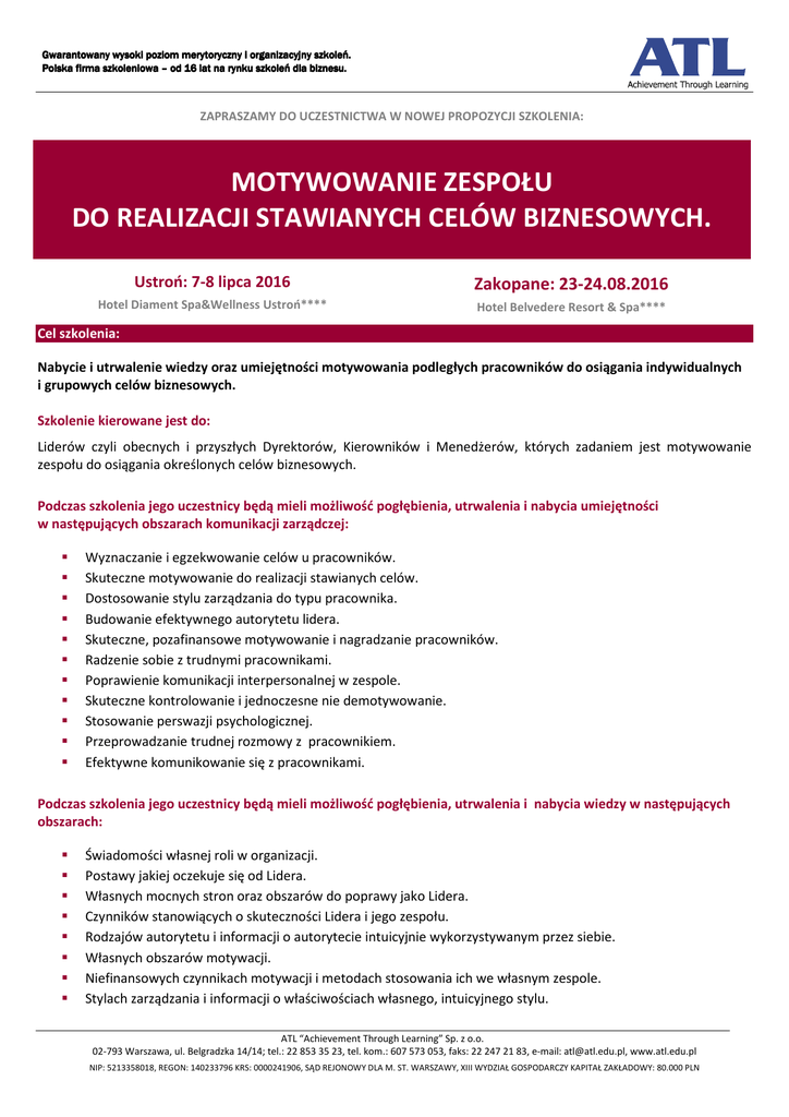 Gwarantowany wysoki poziom merytoryczny i organizacyjny szkoleń. Polska firma szkoleniowa – od 16 lat na rynku szkoleń dla biznesu. ZAPRASZAMY DO UCZESTNICTWA W NOWEJ PROPOZYCJI SZKOLENIA: MOTYWOWANIE ZESPOŁU DO REALIZACJI STAWIANYCH CELÓW BIZNESOWYCH. Ustroń: 7-8 lipca 2016 Zakopane: 23-24.08.2016 Hotel Diament Spa&Wellness Ustroń**** Hotel Belvedere Resort & Spa**** Cel szkolenia: Nabycie i utrwalenie wiedzy oraz umiejętności motywowania podległych pracowników do osiągania indywidualnych i grupowych celów biznesowych. Szkolenie kierowane jest do: Liderów czyli obecnych i przyszłych Dyrektorów, Kierowników i Menedżerów, których zadaniem jest motywowanie zespołu do osiągania określonych celów biznesowych. Podczas szkolenia jego uczestnicy będą mieli możliwość pogłębienia, utrwalenia i nabycia umiejętności w następujących obszarach komunikacji zarządczej: Wyznaczanie i egzekwowanie celów u pracowników. Skuteczne motywowanie do realizacji stawianych celów. Dostosowanie stylu zarządzania do typu pracownika. Budowanie efektywnego autorytetu lidera. Skuteczne, pozafinansowe motywowanie i nagradzanie pracowników. Radzenie sobie z trudnymi pracownikami. Poprawienie komunikacji interpersonalnej w zespole. Skuteczne kontrolowanie i jednoczesne nie demotywowanie. Stosowanie perswazji psychologicznej. Przeprowadzanie trudnej rozmowy z pracownikiem. Efektywne komunikowanie się z pracownikami. Podczas szkolenia jego uczestnicy będą mieli możliwość pogłębienia, utrwalenia i nabycia wiedzy w następujących obszarach: Świadomości własnej roli w organizacji. Postawy jakiej oczekuje się od Lidera. Własnych mocnych stron oraz obszarów do poprawy jako Lidera. Czynników stanowiących o skuteczności Lidera i jego zespołu. Rodzajów autorytetu i informacji o autorytecie intuicyjnie wykorzystywanym przez siebie. Własnych obszarów motywacji. Niefinansowych czynnikach motywacji i metodach stosowania ich we własnym zespole. Stylach zarządzania i informacji o właściwościach własnego, intuicyjnego stylu. ATL “Achievement Through Learning” Sp. z o.o. 02-793 Warszawa, ul. Belgradzka 14/14; tel.: 22 853 35 23, tel. kom.: 607 573 053, faks: 22 247 21 83, e-mail: [email protected], www.atl.edu.pl NIP: 5213358018, REGON: 140233796 KRS: 0000241906, SĄD REJONOWY DLA M. ST. WARSZAWY, XIII WYDZIAŁ GOSPODARCZY KAPITAŁ ZAKŁADOWY: 80.000 PLN Gwarantowany wysoki poziom merytoryczny i organizacyjny szkoleń. Polska firma szkoleniowa – od 16 lat na rynku szkoleń dla biznesu. PROGRAM SZKOLENIA: 1. Wprowadzenie do szkolenia. Ćwiczenie integracyjno-wprowadzające. Prezentacja programu. Oczekiwania uczestników. I. BLOK - Świadomy swojej roli w organizacji i stylu motywowania Lidera. 2. Wymagania rynku i korzyści ze sprostania nim. Oczekiwania pracodawcy i ich powody. Oczekiwania pracowników. Korzyści dla Liderów ze sprostania oczekiwaniom. 3. Postawa Lidera podczas przekazywania w ,,dół’’ informacji, poleceń pochodzących od jego przełożonych. Postawa Lidera jako reprezentanta ,,góry’’. Zasada identyfikowania się z celem. 4. Podstawowe zadania Lidera – motywowanie pracowników. Co mnie motywuje – test autoanalizy. Oznaki motywacji i demotywacji. Praktyczne pomysły na motywowanie pozafinansowe. II. BLOK – Narzędzia zarządcze wpływające na realizację celów przez podwładnych. 5. Podstawowe zadania Lidera - budowanie autorytetu lidera grupy? Idealny szef – portret. Rodzaje autorytetu w oczach pracowników i jego efektywność. Metody budowania i wzmacniania najefektywniejszych form autorytetu. 6. Podstawowe zadania Lidera – dopasowanie stylu zarządzania do dojrzałości pracownika. Mój styl zarządzania – kwestionariusz autoanalizy. Style zarządzania i dojrzałość pracowników. Dopasowanie stylu zarządzania do typu pracownika i sytuacji. 7. Podstawowe zadania Lidera – stawianie celów i zadań pracownikom. Budowanie wizji dla własnego zespołu. Cele / Marzenia - Wykorzystanie reguły SMART. Cele ilościowe i jakościowe. 8. Podstawowe zadania Lidera – monitorowanie i ocena. Kontrola prewencyjna, bieżąca i po fakcie. Standardy pracy jako podstawa do oceny. Jak przeprowadzać oceny? 9. Podstawowe zadania Lidera - udzielanie informacji zwrotnej. Przygotowanie się do rozmowy. Zmotywowanie pracownika do rozmowy. Zasady udzielania motywującej informacji zwrotnej. ATL “Achievement Through Learning” Sp. z o.o. 02-793 Warszawa, ul. Belgradzka 14/14; tel.: 22 853 35 23, tel. kom.: 607 573 053, faks: 22 247 21 83, e-mail: [email protected], www.atl.edu.pl NIP: 5213358018, REGON: 140233796 KRS: 0000241906, SĄD REJONOWY DLA M. ST. WARSZAWY, XIII WYDZIAŁ GOSPODARCZY KAPITAŁ ZAKŁADOWY: 80.000 PLN Gwarantowany wysoki poziom merytoryczny i organizacyjny szkoleń. Polska firma szkoleniowa – od 16 lat na rynku szkoleń dla biznesu. 10. Podstawowe zadania Lidera - Postępowanie w trudnych sytuacjach z pracownikami. Teoria zachowania w praktyce. Metody oddziaływania na pracownika. Analiza przypadków podanych przez uczestników. 11. Podstawowe zadania Lidera – przekonywanie. Mechanizmy perswazji psychologicznej w zarządzaniu. Techniki oparte o indywidualną specyfikę pracownika. Perswazja oparta o osobowość rozmówcy i jego stosunek do nas. Techniki presupozycji (wmawiania). 12. Podstawowe zadania Lidera – coaching narzędziowy pracowników. Kryteria wyboru celu coachingu. Zawarcie kontraktu coachingowego. Zasady pracy z pracownikiem. Wyznaczanie celów po coachingu. 13. Podstawowe zadania Lidera - expose przed pracownikami i przełożonymi. Kontrolowanie komunikacji niewerbalnej podczas wystąpień na różnych poziomach hierarchii zawodowej. Efektywna komunikacja niewerbalna. Struktura efektywnego wystąpienia. III. BLOK – Implementacja szkolenia w codziennej pracy. 14. Podsumowanie szkolenia – przyszłe działania. Syntetyczne podsumowanie treści szkolenia. Opracowanie indywidualnego planu wzmocnieni
