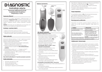 B u d o w a t e r m o m e t r u r u c h o m a s o n d a n a s a d k a o c h r o n n a n a s o n d ę I n s t r u k c j a u ż y c i a P r z y c i s k z a s i l a n i a Termometr elektroniczny ET102 na podczerwieñ do pomiaru temperatury w uchu. W y ś w i e t l a c z L C D S z a n o w n y K l i e n c i e ! Dziêkujemy za zakup termometru elektronicznego na podczerwieñ Diagnostic ET102. Urz¹dzenie przeznaczone jest do pomiaru temperatury cia³a dzieci i osób doros³ych. Przed u¿yciem urz¹dzenia prosimy uwa¿nie przeczytaæ instrukcjê u¿ycia. UWAGA: Termometr jest tak skalibrowany, ¿e do pomiaru nie nale¿y stosowaæ dodatkowych kapturków ochronnych. W y b ó r j e d n o s t k i . Termometr dokonuje pomiaru w oC lub oF. Je¿eli chcesz zmieniæ fabrycznie ustawion¹ jednostkê pomiarow¹ oC postêpuj zgodnie z krokami opisanymi poni¿ej: 1. Zdejmij z termometru pokrywê na bateriê i wyjmij jedn¹ bateriê a drug¹ pozostaw w pojemniku. 2. Naciœnij i przytrzymaj przycisk zasilania jednoczeœnie wk³adaj¹c bateriê do pojemnika. Nie zwalniaj klawisza zasilanie. 3. Na wyœwietlaczu pojawi siê "----" i migaj¹cy symbol oF. 4. Przytrzymaj klawisz zasilania do momentu, a¿ na wyœwietlaczu pojawi siê 188.8 a symbol oF przestanie migaæ. Zwolnij klawisz zasilania. 5. Termometr jest gotowy do pracy. 6. Na³ó¿ pokrywê na bateriê. Aby zmieniæ jednostkê ma oC powtórz powy¿sze czynnoœci. C e c h y t e r m o m e t r u o ? Koñcówka obracaj¹ca siê o 360 ? Pamiêæ ostatniego pomiaru ? Jednostka pomiarowa: oF lub oC ? Automatyczne wy³¹czanie: po 60 sekundach T w o j a t e m p e r a t u r a Na wyœwietlaczu pojawi siê Err, jeœli termometr by³ stosowany poza zakresem temperatury roboczej 15-40 oC H siê pojawia, gdy temperatura jest wy¿sza ni¿ 42,9 oC L oznacza, ¿e temperatura jest ni¿sza ni¿ 32 oC R o z w i ą z y w a n i e p r o b l e m ó w Termometr nie powinien sprawiaæ ¿adnych problemów, ale gdyby tak siê sta³o, poni¿sze wskazówki mog¹ okazaæ siê pomocne. g n i a z d o n a b a t e r i e P r o b l e m I n s t a l a c j a i w y m i a n a b a t e r i i . 1. Zdejmij z termometru pokrywê na bateriê. 2. W³ó¿ bateriê do pojemnika zachowuj¹c ich polaryzacjê pokazan¹ wewn¹trz i za³ó¿ z powrotem pokrywê na bateriê. Aby dokonaæ nastêpnego pomiaru poczekaj a¿ na wyœwietlaczu LCD pojawi siê wskaŸnik gotowoœci i symbol . Je¿eli w ci¹gu 1 minuty nie dokonujesz ¿adnych pomiarów, termometr wy³¹czy siê automatycznie. Po ka¿dym u¿yciu zabezpiecz sondê termometru poprzez za³o¿enie nasadki ochronnej. p o k r y w a n a b a t e r i ę J a k u ż y w a ć t e r m o m e t r Pomiar temperatury w uchu. • Wciœnij na termometrze przycisk zasilanie. Przez krótk¹ chwilê na wyœwietlaczu pojawi¹ siê wszystkie symbole, nastêpnie rosn¹cy wskaŸnik gotowoœci do pomiaru i symbol a dalej sygna³ dŸwiêkowy wskazuj¹cy gotowoœæ do pomiaru. • WprowadŸ sondê termometru do kana³u usznego w nastêpuj¹cy sposób: W przypadku dzieci w wieku 1 roku i starszych oraz doros³ych: 1. odchyl ucho delikatnie do ty³u w celu wyprostowania kana³u usznego. 2. wprowadŸ sondê do ucha tak daleko jak jest to mo¿liwe 3. upewnij siê ¿e sonda w pe³ni zakrywa kana³ uszny 4. trzymaj termometr w tej pozycji a¿ do zakoñczenia pomiaru. 5. wciœnij przycisk zasilanie. 6. po us³yszeniu sygna³u dŸwiêkowego wyjmij termometr z ucha i odczytaj wynik. W przypadku niemowl¹t poni¿ej 1 roku ¿ycia: 1. odci¹gnij uszko prosto do ty³u i w³ó¿ sondê bezpoœrednio w kana³ uszny. 2. wciœnij przycisk zasilanie. 3. po us³yszeniu sygna³u dŸwiêkowego wyjmij termometr z ucha i odczytaj wynik. W s k a z ó w k a P o n a c i ś n i ę c i u p r z y c i s k u z a s i l a n i a U p e w n i j s i ę c z y b a t e r i e z o s t a ł y w y ś w i e t l a c z j e s t p u s t y . z a ł o ż o n e p r a w i d ł o w o . U p e w n i j s i ę c z y k o ń c ó w k a s o n d y j e s t c z y s t a i n i e u s z k o d z o n a . U s u ń N i e m o ż e s z d o k o n a ć p o m i a r u n a d m i a r w o s k o w i n y , k t ó r a m o ż e l u b n a w y ś w i e t l a c z u p o j a w i ł a s i ę z a t y k a ć u c h o . P o n o w n i e w ł ó ż s o n d ę n i e p r a w i d ł o w a t e m p e r a t u r a . – p a t r z p u n k t : P o m i a r t e m p e r a t u r y w u c h u . p e w n i j s i ę , ż e d o k o n u j e s z p o m i a r u T e r m o m e t r d o u c h a n i e d z i a ł a p r a w i - U d ł o w o p o n a c i ś n i ę c i u p r z y c i s k u z s i l a n i e .p o p o j a w i e n i u s i ę s y b o l u . U ż y t k o w a n i e i k o n s e r w a c j a ? Utrzymuj termometr suchy. Nigdy nie zanurzaj go w wodzie. ? Termometr nale¿y przechowywaæ z dala od bezpoœredniego dzia³ania œwiat³a s³onecznego, kurzu i zanieczyszczeñ. ? ? U¿ywaj i przechowuj termometr w temperaturze pokojowej. ? ? Pos³uguj siê termometrem z nale¿yt¹ ostro¿noœci¹. Nie upuœæ go. ? ? Aby utrzymaæ termometr w czystoœci nale¿y jego obudowê przecieraæ wilgotn¹ szmatk¹. ? ? Soczewkê sondy czyœcimy wacikiem zwil¿onym w spirytusie. Przed ponownym u¿yciem termometru pozostaw go do wyschniêcia. Nie dopuœæ do uszkodzenia soczewki sondy poprzez czyszczenie papierowym rêcznikiem lub papierem. ? ? Nie dotykaj sondy palcami. Po ka¿dym u¿yciu zabezpiecz sondê poprzez za³o¿enie nasadki ochronnej. ? ? Nie demontuj termometru. W y j a ś n i e n i e u ż y t y c h s y m b o l i R a d y i w s k a z ó w k i . Producent / Wytwórca ? ?W celu uzyskania dok³adnego pomiaru wyczyœæ ucho z nadmiaru woskowiny. ? ? Pomiar temperatury w prawym uchu mo¿e siê ró¿niæ od pomiaru w lewym uchu. Aby uzyskaæ dok³adny pomiar mierz temperaturê zawsze w tym samym uchu. ? ?Temperaturê nale¿y mierzyæ w stanie spoczynku. Uwaga! Po gimnastyce lub k¹pieli przed pomiarem odczekaj 20 minut. ? ?Termometru nie nale¿y stosowaæ w przypadku chorób uszu lub kiedy kana³ uszny jest wilgotny. ? ? A