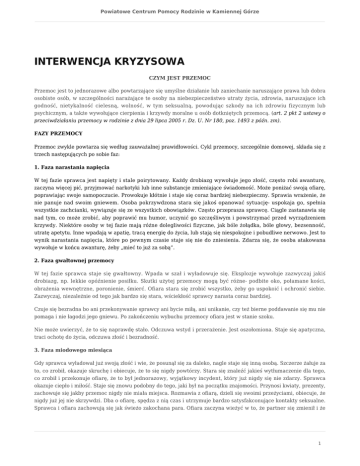 Powiatowe Centrum Pomocy Rodzinie w Kamiennej Górze INTERWENCJA KRYZYSOWA CZYM JEST PRZEMOC Przemoc jest to jednorazowe albo powtarzające się umyślne działanie lub zaniechanie naruszające prawa lub dobra osobiste osób, w szczególności narażające te osoby na niebezpieczeństwo utraty życia, zdrowia, naruszające ich godność, nietykalność cielesną, wolność, w tym seksualną, powodując szkody na ich zdrowiu fizycznym lub psychicznym, a także wywołujące cierpienia i krzywdy moralne u osób dotkniętych przemocą. (art. 2 pkt 2 ustawy o przeciwdziałaniu przemocy w rodzinie z dnia 29 lipca 2005 r. Dz. U. Nr 180, poz. 1493 z późn. zm). FAZY PRZEMOCY Przemoc zwykle powtarza się według zauważalnej prawidłowości. Cykl przemocy, szczególnie domowej, składa się z trzech następujących po sobie faz: 1. Faza narastania napięcia W tej fazie sprawca jest napięty i stale poirytowany. Każdy drobiazg wywołuje jego złość, często robi awanturę, zaczyna więcej pić, przyjmować narkotyki lub inne substancje zmieniające świadomość. Może poniżać swoją ofiarę, poprawiając swoje samopoczucie. Prowokuje kłótnie i staje się coraz bardziej niebezpieczny. Sprawia wrażenie, że nie panuje nad swoim gniewem. Osoba pokrzywdzona stara się jakoś opanować sytuację- uspokaja go, spełnia wszystkie zachcianki, wywiązuje się ze wszystkich obowiązków. Często przeprasza sprawcę. Ciągle zastanawia się nad tym, co może zrobić, aby poprawić mu humor, uczynić go szczęśliwym i powstrzymać przed wyrządzeniem krzywdy. Niektóre osoby w tej fazie mają różne dolegliwości fizyczne, jak bóle żołądka, bóle głowy, bezsenność, utratę apetytu. Inne wpadają w apatię, tracą energię do życia, lub stają się niespokojne i pobudliwe nerwowo. Jest to wynik narastania napięcia, które po pewnym czasie staje się nie do zniesienia. Zdarza się, że osoba atakowana wywołuje w końcu awanturę, żeby „mieć to już za sobą”. 2. Faza gwałtownej przemocy W tej fazie sprawca staje się gwałtowny. Wpada w szał i wyładowuje się. Eksplozje wywołuje zazwyczaj jakiś drobiazg, np. lekkie opóźnienie posiłku. Skutki użytej przemocy mogą być różne- podbite oko, połamane kości, obrażenia wewnętrzne, poronienie, śmierć. Ofiara stara się zrobić wszystko, żeby go uspokoić i ochronić siebie. Zazwyczaj, niezależnie od tego jak bardzo się stara, wściekłość sprawcy narasta coraz bardziej. Czuje się bezradna bo ani przekonywanie sprawcy ani bycie miłą, ani unikanie, czy też bierne poddawanie się mu nie pomaga i nie łagodzi jego gniewu. Po zakończeniu wybuchu przemocy ofiara jest w stanie szoku. Nie może uwierzyć, że to się naprawdę stało. Odczuwa wstyd i przerażenie. Jest oszołomiona. Staje się apatyczna, traci ochotę do życia, odczuwa złość i bezradność. 3. Faza miodowego miesiąca Gdy sprawca wyładował już swoją złość i wie, że posunął się za daleko, nagle staje się inną osobą. Szczerze żałuje za to, co zrobił, okazuje skruchę i obiecuje, że to się nigdy powtórzy. Stara się znaleźć jakieś wytłumaczenie dla tego, co zrobił i przekonuje ofiarę, że to był jednorazowy, wyjątkowy incydent, który już nigdy się nie zdarzy. Sprawca okazuje ciepło i miłość. Staje się znowu podobny do tego, jaki był na początku znajomości. Przynosi kwiaty, prezenty, zachowuje się jakby przemoc nigdy nie miała miejsca. Rozmawia z ofiarą, dzieli się swoimi przeżyciami, obiecuje, że nigdy już jej nie skrzywdzi. Dba o ofiarę, spędza z nią czas i utrzymuje bardzo satysfakconujące kontakty seksualne. Sprawca i ofiara zachowują się jak świeżo zakochana para. Ofiara zaczyna wieżyć w to, że partner się zmienił i że 1 Powiatowe Centrum Pomocy Rodzinie w Kamiennej Górze przemoc byłą jedynie incydentem. Czuje się kochana, myśli, że jest dla niego ważna i znowu go kocha. Spełniają się jej marzenia o cudownej miłości, odczuwa bliskość i zespolenie z partnerem. Życie we dwoje wydaje się piękne i pełne nadziei. Ale faza miodowego miesiąca przemija i znowu ropzoczyna się faza narastania napięcia. Zatrzymuje ona ofiarę w cyklu przemocy, bo łatwo pod jej wpływem zapomnieć o koszmarze pozostałych dwóch faz. Prawdziwe zagrożenie, jakie niesie ze sobą faza miodowego miesiąca jest związane z tym, że przemoc w następnym cyklu jest zazwyczaj gwałtowniejsza. Takie cykle przemocy mogą trwać nawet kilka lat, przy czym zwykle skracaniu ulegają fazy "miodowego miesiąca", przy jednoczesnym wydłużaniu i bardziej dramatycznym przebiegu faz napięcia i gwałtownej przemocy. Po pewnym czasie trzecia faza zanika i pozostają tylko dwie poprzedzające je fazy. PRZEMOC W RODZINIE CHARAKTERYZUJE SIĘ TYM, ŻE: 1. JEST INTENCJONALNAPrzemoc jest zamierzonym działaniem człowieka i ma na celu kontrolowanie i podorządkowanie ofiary. 2. SIŁY SĄ NIERÓWNOMIERNEW relacji jedna ze stron ma przewagę nad drugą. Ofiara jest słabsza, a sprawca silniejszy. 3. NARUSZA PRAWA I DOBRA OSOBISTESprawca wykorzystuje przewagę siły narusza podstawowe prawa ofiary (np. prawo do nietykalności fizycznej, godności, szacunku itd.). 4. POWODUJE CIERPIENIE I BÓLSprawca naraża zdrowie i życie ofiary na poważne szkody. Doświadczanie bólu i cierpienia sprawia, że ofiara ma mniejszą zdolność do samoobrony. RODZAJE PRZEMOCY Przemoc fizyczna - popychanie, odpychanie, obezwładnianie, przytrzymywanie, policzkowanie, szczypanie, kopanie, duszenie, bicie przedmiotami, ciskanie w kogoś przedmiotami, parzenie, polewanie substancjami żrącymi, nieudzielanie koniecznej pomocy, straszenie użyciem broni lub jej użycie, nieostrożne prowadzenie samochodu, zamykanie w pomieszczeniu. Przemoc psychiczna- wyśmiewanie poglądów, religii, pochodzenia, narzucanie własnych poglądów, karanie przez odmowę uczuć, zainteresowania, szacunku, stała krytyka, wmawianie choroby psychicznej, izolacja społe