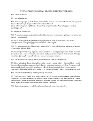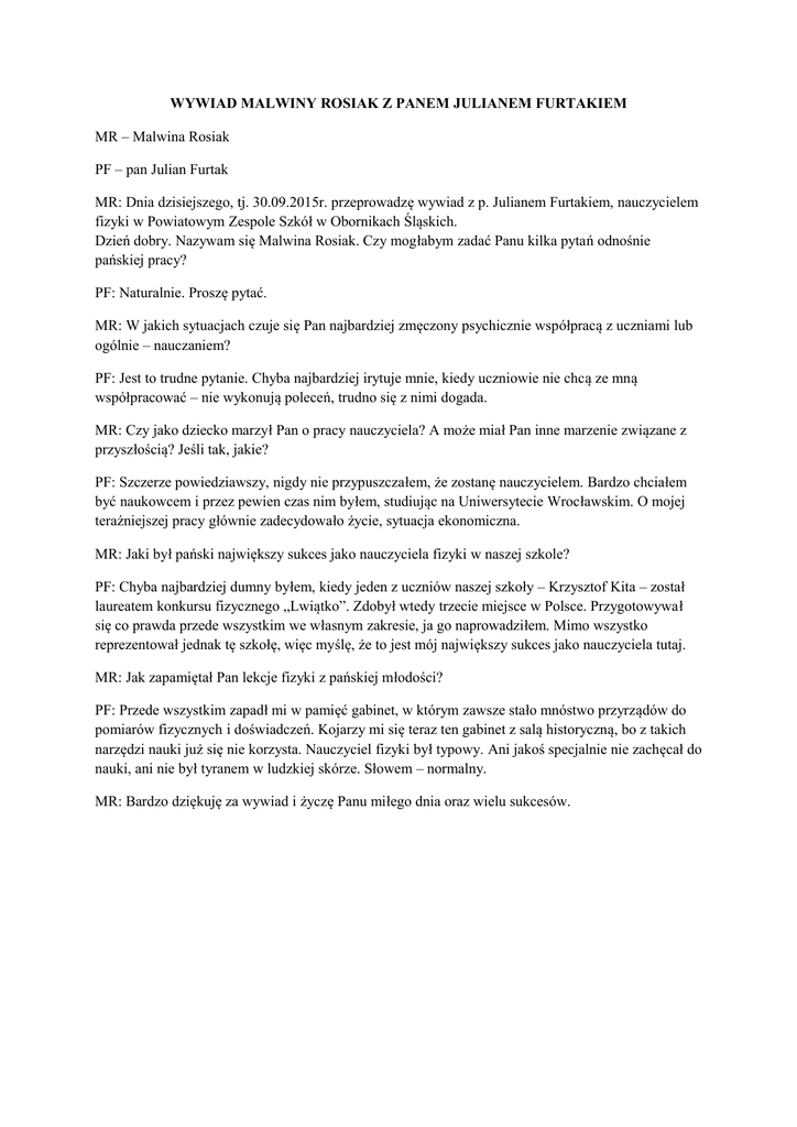 WYWIAD MALWINY ROSIAK Z PANEM JULIANEM FURTAKIEM MR – Malwina Rosiak PF – pan Julian Furtak MR: Dnia dzisiejszego, tj. 30.09.2015r. przeprowadzę wywiad z p. Julianem Furtakiem, nauczycielem fizyki w Powiatowym Zespole Szkół w Obornikach Śląskich. Dzień dobry. Nazywam się Malwina Rosiak. Czy mogłabym zadać Panu kilka pytań odnośnie pańskiej pracy? PF: Naturalnie. Proszę pytać. MR: W jakich sytuacjach czuje się Pan najbardziej zmęczony psychicznie współpracą z uczniami lub ogólnie – nauczaniem? PF: Jest to trudne pytanie. Chyba najbardziej irytuje mnie, kiedy uczniowie nie chcą ze mną współpracować – nie wykonują poleceń, trudno się z nimi dogada. MR: Czy jako dziecko marzył Pan o pracy nauczyciela? A może miał Pan inne marzenie związane z przyszłością? Jeśli tak, jakie? PF: Szczerze powiedziawszy, nigdy nie przypuszczałem, że zostanę nauczycielem. Bardzo chciałem być naukowcem i przez pewien czas nim byłem, studiując na Uniwersytecie Wrocławskim. O mojej teraźniejszej pracy głównie zadecydowało życie, sytuacja ekonomiczna. MR: Jaki był pański największy sukces jako nauczyciela fizyki w naszej szkole? PF: Chyba najbardziej dumny byłem, kiedy jeden z uczniów naszej szkoły – Krzysztof Kita – został laureatem konkursu fizycznego „Lwiątko”. Zdobył wtedy trzecie miejsce w Polsce. Przygotowywał się co prawda przede wszystkim we własnym zakresie, ja go naprowadziłem. Mimo wszystko reprezentował jednak tę szkołę, więc myślę, że to jest mój największy sukces jako nauczyciela tutaj. MR: Jak zapamiętał Pan lekcje fizyki z pańskiej młodości? PF: Przede wszystkim zapadł mi w pamięć gabinet, w którym zawsze stało mnóstwo przyrządów do pomiarów fizycznych i doświadczeń. Kojarzy mi się teraz ten gabinet z salą historyczną, bo z takich narzędzi nauki już się nie korzysta. Nauczyciel fizyki był typowy. Ani jakoś specjalnie nie zachęcał do nauki, ani nie był tyranem w ludzkiej skórze. Słowem – normalny. MR: Bardzo dziękuję za wywiad i życzę Panu miłego dnia oraz wielu sukcesów. WYWIAD KAMILI ŚCISŁOWSKIEJ Z PANIĄ ZDZISŁAWĄ TAJKIEWICZ – WOŹNIAK KŚ – Kamila Ścisłowska PTW – pani Zdzisława Tajkiewicz – Woźniak W dzisiejszym wywiadzie uczestniczyć będzie p. Zdzisława Tajkiewicz – Woźniak, nauczycielka języka angielskiego w Gimnazjum Dwujęzycznym w Obornikach Śląskich. Tematem wywiadu są urozmaicenia dotyczące prowadzenia lekcji języka angielskiego. KŚ: Witam! Czy możemy przejść do wywiadu? PTW: Witam! Oczywiście. KŚ: Więc zaczynajmy. Czy prowadzi Pani lekcje korzystając tylko i wyłącznie z podręcznika, czy urozmaica Pani lekcje filmem, zabawą? PTW: Staram się urozmaicać jak najwięcej, zabawą własną, bądź za pomocą Internetu, jak piosenki z You Tube. KŚ: Skąd czerpie Pani inspiracje na takie urozmaicenia? PTW: To znaczy nauczył mnie tego kurs w Anglii o kreatywnym nauczaniu. Oprócz pokazania nam paru zabaw, nauczono nas, jak samemu wymyślać urozmaicenia. KŚ: Z Pani spostrzeżeń. Zauważyła Pani, że dzięki urozmaiceniom uczeń jest bardziej zainteresowany lekcją? PTW: Tak, ale nie jest łatwo przygotować urozmaicenia na każdą lekcję. Fajnym pomysłem jest High 5, gdzie można potańczyć. KŚ: Czyli prowadzi Pani aktywnie lekcje. A gdyby to Pani była uczniem, a nauczyciel prowadziłby lekcje tak jak Pani, to byłaby Pani zainteresowana lekcjami? PTW: Trudno powiedzie. Wymaga to sporo przygotowań. Z tego co pamiętam, u nas w szkole w ogóle nie było urozmaiceń. Wydaje mi się, że cieszyłoby mnie każde urozmaicenie. KŚ: Dziękuję za rozmowę! Do zobaczenia. Zarówno z doświadczeń, jak i spostrzeżeń rozmówcy, wynika, że uczeń woli lekcję nietypową. Niebanalne rozwiązania, coś innego niż podręcznik – zachęca ucznia zarówno do nauki jak i do aktywnego uczestnictwa w zajęciach. WYWIAD PAULINY NOWACKIEJ Z PANIĄ DOROTĄ MATUSIAK PN – Paulina Nowacka PM – pani Dorota Matusiak Dzisiaj przeprowadzę wywiad z Panią Dorotą Matusiak – naszą nauczycielką języka polskiego. PN: Dzień dobry. Chciałabym przeprowadzić z Panią wywiad na temat zawodu nauczyciela. Czy zechciałaby Pani odpowiedzieć na kilka pytań? PM: Dzień dobry. Tak, chętnie odpowiem na wszystkie pytania. PN: Dlaczego wybrała Pani zawód nauczyciela? PM: Od małego bardzo lubiłam czytać książki. Praktycznie było to moje ulubione zajęcie. W szkole średniej skoncentrowałam się głównie na literaturze polskiej. Myślę, że to zdecydowało o wyborze kierunku studiów, czyli filologii polskiej. PN: Czyli z góry było wiadome, iż zostanie Pani nauczycielem języka polskiego? PM: Nie. O tym, że zostanę polonistką postanowiłam dopiero w trakcie studiów, po kilku zajęciach z metodyki. Bardzo mi się podobały. A gdybym nie została polonistką, to studiowałabym psychologię. PN: Jakie są wady, a jakie zalety pracy jako nauczyciel? PM: Niewątpliwie zaletą są dwa miesiące wakacji. Nie wyobrażam sobie zrezygnować z nich. A wadą… Najgorsze jest to, że trzeba przenosi tę pracę ze sobą do domu. PN: Dziękuję bardzo za udzielenie wywiadu. Do widzenia. PM: Do widzenia. WYWIAD ALEKSANDRA KRASOWSKIEGO Z PANEM JULIANEM FURTAKIEM AK – Aleksander Krasowski PF – pan Julian Furtak AK: Dzień Dobry. PF: Dzień dobry. AK: Chciałbym przedstawić p. Juliana Furtaka, nauczyciela fizyki i wychowawcę klasy 2a w naszej szkole. Czy mógłbym Panu zadać kilka pytań związanych z przedmiotem jakiego Pan uczy? PF: Tak, oczywiście. AK: Kiedy zainteresował się Pan fizyką? PF: W szóstej klasie szkoły podstawowej – gdy pani pokazywała doświadczenie ze spadkownicą Atwooda do zademonstrowania przyciągania ziemskiego. AK: Jaki jest Pana ulubiony dział w fizyce? PF: Fizyka relatywistyczna – kompletnie nie wiem co się tam dzieje. AK: Kto jest Pana „idolem” w dziedzinie fizyki? PF: Stephen Hawking. Człowiek, któ