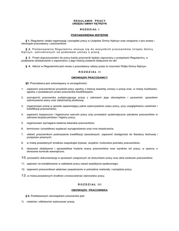 R E G U L AM I N P R AC Y URZĘDU GMINY KĘTRZYN ROZDZIAŁ I POSTANOWIENIA WSTĘPNE § 1. Regulamin ustala organizację i porządek pracy w Urzędzie Gminy Kętrzyn oraz związane z tym prawa i obowiązki pracodawcy i pracowników. § 2 . P o s t a n o w i e n i a R e g u l a m i n u s t o s u j e s i ę d o ws z ys t k i c h p r a c o wn i k ó w U r zę d u G m i n y K ę t r z y n , z a t r u d n i o n y c h n a p o d s t a w i e u m o wy o p r a c ę . § 3 . Przed dopuszczeniem do pracy każdy pracownik będzie zapoznany z przepisami Regulaminu, a podpisane oświadczenie o zapoznaniu z jego treścią zostanie dołączone do akt. § 4 . Ilekroć w Regulaminie jest mowa o pracodawcy należy przez to rozumieć Wójta Gminy Kętrzyn. ROZDZIAŁ II OBOWIĄZKI PRACODAWCY §5. Pracodawca jest zobowiązany w szczególności: 1. zapewnić pracownikowi przydział pracy zgodny z treścią zawartej umowy o pracę oraz, w miarę możliwości, zgodny z posiadanymi przez pracownika kwalifikacjami; 2. zaznajomić pracownika podejmującego pracę z zakresem jego obowiązków i uprawnień, sposobem wykonywania pracy oraz zależnością służbową; 3. organizować pracę w sposób zapewniający pełne wykorzystanie czasu pracy, przy uwzględnieniu uzdolnień i kwalifikacji pracowników; 4. zapewnić bezpieczne i higieniczne warunki pracy oraz prowadzić systematyczne szkolenie pracowników w zakresie bezpieczeństwa i higieny pracy; 5. organizować wymagane badania lekarskie pracowników; 6. terminowo i prawidłowo wypłacać wynagrodzenie oraz inne świadczenia; 7. ułatwić pracownikom podnoszenie kwalifikacji zawodowych, zapewnić dostępność do literatury fachowej i przepisów prawnych; 8. w miarę posiadanych środków zaspokajać bytowe, socjalne i kulturalne potrzeby pracowników; 9. stosować obiektywne i sprawiedliwe kryteria oceny pracowników oraz wyników ich pracy, w oparciu o okresowe kontrole wewnętrzne; 10. prowadzić dokumentację w sprawach związanych ze stosunkiem pracy oraz akta osobowe pracowników; 11. wpływać na kształtowanie w zakładzie pracy zasad współżycia społecznego; 12. zapewnić pracownikowi właściwe zaopatrzenie w potrzebne materiały i narzędzia pracy; 13. w miarę posiadanych środków unowocześniać stanowisko pracy. ROZDZIAŁ III OBOWIĄZKI PRACOWNIKA § 6. Podstawowym obowiązkiem pracownika jest: 1) rzetelnie i efektywnie wykonywać pracę; 2 2) stosować się do poleceń przełożonych, które dotyczą pracy, jeśli nie są one sprzeczne z przepisami prawa lub umową o pracę; 3) przestrzegać ustalonego czasu pracy; 4) przestrzegać regulaminu pracy; 5) przestrzegać przepisów i zasad bezpieczeństwa pracy oraz przepisów przeciwpożarowych; 6) uzupełniać swoją wiedzę i doskonalić umiejętności w zakresie swojego stanowiska pracy; 7) dbać o dobro i mienie Urzędu, zachować w tajemnicy informacje, których ujawnienie mogłoby narazić Gminę na szkodę; 8) przestrzegać tajemnicy państwowej i służbowej; 9) przestrzegać zasad współżycia społecznego; 10) zachować grzeczność w kontaktach z interesantami; 11) dbać o czystość i porządek wokół swego stanowiska pracy; 12) po zakończeniu pracy należycie zabezpieczyć narzędzia, urządzenia i pomieszczenia pracy. § 7. Przyjęcie do wiadomości obowiązku przestrzegania tajemnicy określonej w obowiązujących ustawach pracownicy potwierdzają własnoręcznym podpisem na dokumencie przechowywanym w aktach osobowych. § 8. Pracownicy są obowiązani do wykonywania każdej, zleconej im pracy, odpowiadającej ich kwalifikacjom zawodowym i niewykraczającej poza warunki wynikające z umowy o pracę, jeśli praca ta nie stanowi zagrożenia dla zdrowia lub życia pracownika ani innych osób. § 9. W związku z rozwiązaniem lub wygaśnięciem stosunku pracy pracownik jest zobowiązany do: 1. rozliczenia się z pracodawcą z pobranych zaliczek, powierzonych narzędzi, materiałów i sprzętu, pobranej odzieży roboczej i ochronnej 2. protokolarnego przekazania stanowiska pracy, tj. dokumentów, akt, urządzeń technicznych, podręcznego zbioru literatury fachowej, będącego własnością Urzędu. § 10. 1. Kierowników referatów obciążają odpowiednio obowiązki wynikające z § 6-9. 2. Kierownicy są zobowiązani ponadto do: )1 koordynowania i organizowania pracy w podległych im komórkach; )2 sprawowania bezpośredniego nadzoru nad porządkiem i dyscypliną pracy w podległej komórce; )3 nadzorowania przestrzegania obowiązku trzeźwości przez podwładnych; )4 dbania o bezpieczny i higieniczny stan pomieszczeń i urządzeń oraz egzekwowania przestrzegania przez podwładnych przepisów bhp; )5 zapewnienia równomiernego obciążania pracą w okresie zastępstw nieobecnych w pracy podwładnych. § 11. Pracownicy są zobowiązani do przestrzegania zasad trzeźwości określonych w rozdziale XI Regulaminu. § 12. 1. Pracownicy są zobowiązani do przestrzegania zakazu palenia tytoniu w pomieszczeniach pracy. 2. Palenie jest dozwolone tylko w wydzielonych palarniach, odpowiednio oznakowanych i wyposażonych. § 13. Do rażących naruszeń porządku i dyscypliny pracy, uzasadniających zastosowanie odpowiednich sankcji prawa pracy, do zwolnienia dyscyplinarnego włącznie należą: 1) niewłaściwe pod względem merytorycznym lub niezgodne z obowiązującymi przepisami prawa wykonywanie pracy; 3 2) wykonywanie w czasie pracy, bez wiedzy i zezwolenia bezpośredniego przełożonego, prac nie związanych z zadaniami określonymi w umowie o pracę; 3) samowolne korzystanie z urządzeń technicznych i sprzętu do celów nie związanych ze stanowiskiem pracy; 4) nieusprawiedliwione nieprzybycie albo spóźnienie się do pracy lub jej samowolne opuszczenie; 5) naruszanie przez pracowników obowiązku trzeźwości; 6) niewykonywanie lub niewłaściwe wykonywanie poleceń przełożonych; 7) nieprzestrzeganie przepisów i zasad bhp oraz przeciwpożarowych; 8) zakłócanie porządku i spokoj