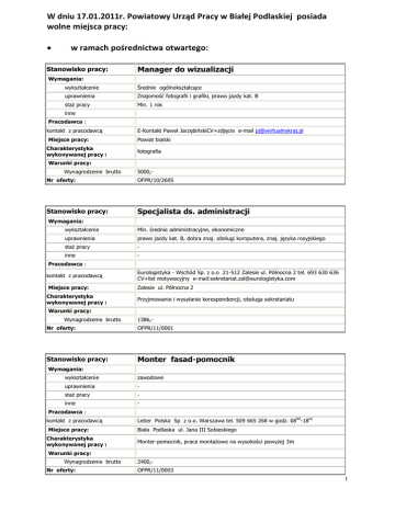W dniu 17.01.2011r. Powiatowy Urząd Pracy w Białej Podlaskiej posiada wolne miejsca pracy: w ramach pośrednictwa otwartego: Stanowisko pracy: Manager do wizualizacji Wymagania: wykształcenie Średnie ogólnokształcące uprawnienia Znajomość fotografii i grafiki, prawo jazdy kat. B staż pracy Min. 1 rok inne Pracodawca : kontakt z pracodawcą Miejsce pracy: Charakterystyka wykonywanej pracy : E-Kontakt Paweł JarzębińskiCV+zdjęcie e-mail [email protected] Powiat bialski fotografia Warunki pracy: Wynagrodzenie brutto 5000,- Nr oferty: OFPR/10/2605 Stanowisko pracy: Specjalista ds. administracji Wymagania: wykształcenie Min. średnie administracyjne, ekonomiczne uprawnienia prawo jazdy kat. B, dobra znaj. obsługi komputera, znaj. języka rosyjskiego staż pracy - inne - Pracodawca : kontakt z pracodawcą Miejsce pracy: Charakterystyka wykonywanej pracy : Eurologistyka - Wschód Sp. z o.o 21-512 Zalesie ul. Północna 2 tel. 693 630 636 CV+list motywacyjny e-mail:[email protected] Zalesie ul. Północna 2 Przyjmowanie i wysyłanie korespondencji, obsługa sekretariatu Warunki pracy: Wynagrodzenie brutto 1386,- Nr oferty: OFPR/11/0001 Stanowisko pracy: Monter fasad-pomocnik Wymagania: wykształcenie zawodowe uprawnienia - staż pracy - inne - Pracodawca : kontakt z pracodawcą Miejsce pracy: Charakterystyka wykonywanej pracy : Leiter Polska Sp z o.o. Warszawa tel. 509 665 268 w godz. 0800-18oo Biała Podlaska ul. Jana III Sobieskiego Monter-pomocnik, prace montażowe na wysokości powyżej 3m Warunki pracy: Wynagrodzenie brutto Nr oferty: 2400,OFPR/11/0003 1 Stanowisko pracy: Kierowca w transporcie międzynarodowym Wymagania: wykształcenie średnie uprawnienia prawo jazdy kat. C+E, ADR, kurs na przewóz rzeczy staż pracy - inne biegła znajomość języka rosyjskiego, ukraińskiego i białoruskiego Pracodawca : kontakt z pracodawcą Miejsce pracy: Charakterystyka wykonywanej pracy : KOCIUK&MAGIER, 21-500 Biała Podl. ul. Sidorska 76, tel. 344 91 05 Europa Przewóz rzeczy w transporcie międzynarodowym Warunki pracy: Wynagrodzenie brutto 1386,- Nr oferty: OFPR/11/0007 Stanowisko pracy: Sprzedawca na stacji paliw Wymagania: wykształcenie średnie uprawnienia - staż pracy - inne Orzeczenie o niepełnosprawności- lekki stopień Pracodawca : kontakt z pracodawcą Miejsce pracy: Charakterystyka wykonywanej pracy : CONKRET 21-500 Biała Podl. ul. Sidorska 59, kontakt osobisty CV+zdjęcie, Biała Podlaska Obsługa klientów na stacji paliw Warunki pracy: Wynagrodzenie brutto 1400,- Nr oferty: OFPR/11/0012 Stanowisko pracy: Pozostali spawacze i pokrewni Wymagania: wykształcenie - uprawnienia Umiejętność spawania metoda elektryczną i gazową staż pracy Min. 2 lata inne Pracodawca : kontakt z pracodawcą Miejsce pracy: Charakterystyka wykonywanej pracy : Warunki pracy: Wynagrodzenie brutto Nr oferty: PPHU KRUSZYWO S.C M.Nazarewicz, J. Stefaniuk 607 320 610 p.SylwiaNikończuk Biała Podlaska: ul. Sielczyk 2 Spawanie metodą elektryczną i gazową Umowa na czas określony 1386,00 Ofpr/11/0014 2 Stanowisko pracy: Sprzątaczka Wymagania: wykształcenie - uprawnienia - staż pracy Mile widziany na podobnym stanowisku inne Orzeczenie o stopniu niepełnosprawności : umiarkowany Pracodawca : kontakt z pracodawcą Miejsce pracy: Charakterystyka wykonywanej pracy : Warunki pracy: Wynagrodzenie brutto Nr oferty: P.U. ,,ROKA’’ Piotrków Trybunalski CV czystość[email protected], 887 963 187 Elżbieta Chmielewska Biała Podlaska : LUBZEL Dbanie o czystość w obiekcie Pół etatu 693,00 OfPr/11/0016 w ramach pośrednictwa zamkniętego szczegółowe informacje udzielają pośrednicy pracy pod nr tel. (83) 341 65 70 - 80 Stanowisko pracy: Sprzedawca Wymagania: wykształcenie średnie uprawnienia staż pracy min. rok inne Obsługa komputera, znajomość dokumentacji magazynowej Charakterystyka wykonywanej pracy : Sprzedaż artykułów spożywczo-przemysłowych Warunki pracy: wynagrodzenie brutto 1386,- Nr oferty: Ofpr/11/0006 Stanowisko pracy: Kosmetyczka Wymagania: wykształcenie średnie zawodowe: technik usług kosmetycznych uprawnienia - staż pracy mile widziany inne - Charakterystyka wykonywanej pracy : Wykonywanie zabiegów pielęgnacyjnych na twarz i ciało Warunki pracy: wynagrodzenie brutto 1386 ,- + premie Nr oferty: OfPr/11/0008 Stanowisko pracy: Monter instalacji i urządzeń sanitarnych Wymagania: wykształcenie Zawodowe, techniczne budowlane: monter instalacji i urządzeń uprawnienia - staż pracy mile widziany inne - 3 Charakterystyka wykonywanej pracy : Montaż instalacji sanitarnych wewnętrznych i zewnętrznych Warunki pracy: wynagrodzenie brutto Nr oferty: 1400,OfPr/11/0013 4