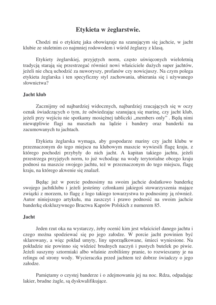 Etykieta w eglarstwie. Chodzi mi o etykiet jaka obowi zuje na szanuj cym si jachcie, w jacht klubie ze stuletnim co najmniej rodowodem i w ród eglarzy z klas . Etykiety eglarskiej, przyj tych norm, cz sto u wi conych wieloletni tradycj staraj si przestrzega równie nowi wła ciciele du ych super jachtów, je eli nie chc uchodzi za nuworyszy, profanów czy nowicjuszy. Na czym polega etykieta eglarska i ten specyficzny styl zachowania, ubierania si i u ywanego słownictwa? Jacht klub Zacznijmy od najbardziej widocznych, najbardziej rzucaj cych si w oczy oznak wiadcz cych o tym, e odwiedzaj c szanuj c si marin , czy jacht klub, je eli przy wej ciu nie spotkamy mosi nej tabliczki „members only” . B d nimi niew tpliwie flagi na masztach na l dzie i bandery oraz banderki na zacumowanych tu jachtach. Etykieta eglarska wymaga, aby gospodarze mariny czy jacht klubu w przeznaczonym do tego miejscu na klubowym maszcie wywiesili flag kraju, z którego pochodzi przybyły do nich jacht. A kapitan takiego jachtu, je eli przestrzega przyj tych norm, to ju wchodz c na wody terytorialne obcego kraju podnosi na maszcie swojego jachtu, te w przeznaczonym do tego miejscu, flag kraju, na którego akwenie si znalazł. B d c ju w porcie podnosimy na swoim jachcie dodatkowo banderk swojego jachtklubu i je eli jeste my członkami jakiego stowarzyszenia maj ce zwi zki z morzem, to flag z logo takiego towarzystwa to podnosimy j równie . Autor niniejszego artykułu, ma zaszczyt i prawo podnosi na swoim jachcie banderk ekskluzywnego Bractwa Kaprów Polskich z numerem 85. Jacht Jeden rzut oka na wystarczy, eby oceni kim jest wła ciciel danego jachtu i czego mo na spodziewa si po jego załodze. W porcie jacht powinien by sklarowany, a wi c pokład umyty, liny uporz dkowane, mieci wyniesione. Na pokładzie nie powinno si widzie brudnych naczy i pustych butelek po piwie. Je eli suszymy sztormiaki albo wła nie zrobili my pranie, to rozwieszamy je na relingu od strony wody. Wycieraczka przed jachtem te dobrze wiadczy o jego załodze. Pami tamy o czystej banderze i o zdejmowaniu jej na noc. Rdza, odpadaj c lakier, brudne agle, s dyskwalifikuj ce. Je eli obok naszego jachtu jest wolne miejsce, to zawsze mo emy spodziewa si , e załoga takiego jachtu b dzie zaj ta manewrami podej cia, by mo e b dzie zm czona, by mo e b dzie niedo wiadczona. Je eli „na wszelki wypadek” wywiesimy odbijacze na naszym jachcie, ka dy jachtsmen to zauwa y i doceni. Jachtsmeni Słownictwo, terminologia powszechnie u ywane przez polskich eglarzy wywodzi si przewa nie z j zyka angielskiego, holenderskiego lub niemieckiego. Je eli jacht po angielsku nazywa si yacht, to logicznym jest, e eglarz b dzie yachtsmanem a to oznacza, e taki man posiada okre lone cechy charakteru, na ogół pozytywne, bo taki jest to sport. Niestety, w Polsce słowo yachtsman, znikn ło praktycznie z u ycia. Zostało wyrugowane w czasach, gdy jachting, eglarstwo uwa ano za sport elitarny, tylko dla bogaczy. Wy miewano biały strój, biała czapk , innymi słowami wy miewano elegancj . Całe szcz cie, e dzisiaj eglarstwo w Polsce nie jest dyskryminowane, ale słowo yachtsmen ju nie jest u ywane. Mo e nale y tego ałowa . eglarska etykieta dotyczy równie i stroju. A wi c mi kkie obuwie, raczej nie d insy i nie kolorowa, w krzykliwe wzory koszula. Ci kie glany absolutnie na jacht nie pasuj . eglarski styl, to szorty, tenisówki, nakrycie głowy i przeciwsłoneczne okulary. Mog to by markowe wyroby, ale niekoniecznie. Dominuj cym kolorem jest biel i kolor niebieski. Dawno nie byłem na Mazurach, ale wie ci dochodz ce do mnie stamt d s przera aj ce. Pono dominuje krzykliwy styl zachowania, nocne pija stwo, gło na muzyka i wulgarne słownictwo. Nie tylko zreszt na Mazurach. Sam czytałem w Internecie przechwałki polskiego „jachtsmena”, który chwalił si , jak to po kryjomu opuszczał zagraniczn marin eby nie zapłaci za postój, jak w nocy obcinał odbijacze na innym jachcie. Nic dziwnego, e w obcych portach spotyka si tablice z napisem „Polacy płac z góry”. eglarska etykieta wymaga mi dzy innymi udzielenia pomocy załodze cumuj cego wła nie jachtu. Wytrawny eglarz widz c podchodz cy do kei jacht, bez wołania o pomoc, sam podejdzie i odbierze cum . Ju nie wspominam o obowi zku udzielania pomocy na morzu. Ceremoniał Wiemy ju jak prezentuje si dobra marina, jak wygl da jacht w „klarze portowym” i jak nie powinien zachowywa si i ubiera szanuj cy si eglarz. Zbiór zasad i przyj tych zwyczajów w eglarstwie jest bardzo obszerny wi c sił rzeczy nie sposób w krótkim artykule opisa wszystkiego. W eglarstwie obowi zuje hierarchia, ale i mówienie do siebie po imieniu. Wiadomo, e najwa niejsz osob na jachcie jest kapitan. Wi e si to z odpowiedzialno ci ale i z przywilejami, na przykład, załoga nie rozpoczyna posiłku zanim nie zacznie je kapitan. Kapitan na jacht mo e przyj ostatni, a schodzi na l d pierwszy. O wyj tkowej pozycji kapitana jachtu wiadcz ró ne tabliczki sprzedawane w eglarskich sklepach, a potem widoczne na jachtach, na Przykład „Nasz kapitan zawsze ma racj ”, „Pro ba kapitana jest dla nas rozkazem”, itp. Pisałem ju o flagach i banderach. Powinienem jeszcze doda , e wywieszanie jednych flag ł czy si z etykiet eglarsk , a podnoszenie innych flag jest obowi zkowe. Koniecznie musimy nosi polsk bander , je eli jacht ma polsk przynale no pa stwow . Wchodz c do portu innego kraju, po odwiedzeniu egzotycznych miejsc koniecznie musimy podnosi ółt flag , która oznacza, e jeste my zdrowi, nie przywozimy jakiej zarazy. Maj c zamiar port opu ci , dobrze jest o tym zasygnalizowa przez podniesienie flagi Mi dzynarodowego Kodu Sygnałowego, tak zwanego Bł kitnego Piotrusia, czyli flagi „P”, która oznacza: „w przeci gu 24 godzin statek, jacht wychodzi w morze”. Skoro ju wspomniałem, o MKS, dobrze by było aby zestaw tych flag cz ciej dekorował jachty i mariny ni nachalne reklamy na kadłubach i aglach jachtów. Te ostatnie powinny