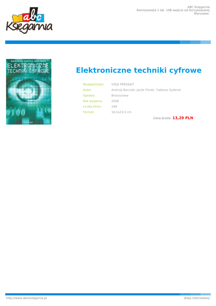 ABC Księgarnia Remiszewska 1 lok. 10B wejście od Gorzykowskiej Warszawa Elektroniczne techniki cyfrowe Wydawnictwo: VIZJA PRESS&IT Autor: Andrzej Barczak, Jacek Florek, Tadeusz Sydoruk Oprawa: Broszurowa Rok wydania: 2008 Liczba stron: 168 Format: 16,5x23,5 cm Cena brutto: http://www.abcksiegarnia.pl 13,29 PLN sklep internetowy