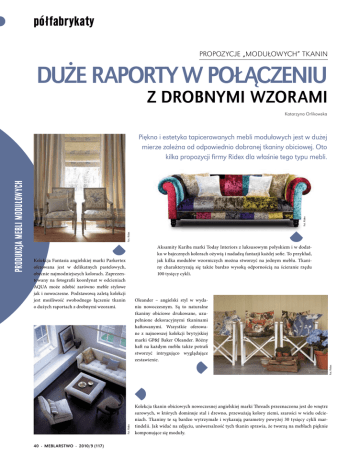 półfabrykaty Propozycje „modułowych” tkanin Duże raporty w połączeniu z drobnymi wzorami Katarzyna Orlikowska Fot. Ridex Fot. Ridex Aksamity Kariba marki Today Interiors z luksusowym połyskiem i w dodatku w bajecznych kolorach ożywią i nadadzą fantazji każdej sofie. To przykład, jak kilka modułów wzorniczych można stworzyć na jednym meblu. Tkaniny charakteryzują się także bardzo wysoką odpornością na ścieranie rzędu 100 tysięcy cykli. Kolekcja Fantasia angielskiej marki Parkertex oferowana jest w delikatnych pastelowych, obecnie najmodniejszych kolorach. Zaprezentowany na fotografii koordynat w odcieniach AQUA może zdobić zarówno meble stylowe jak i nowoczesne. Podstawową zaletą kolekcji jest możliwość swobodnego łączenie tkanin o dużych raportach z drobnymi wzorami. Fot. Ridex Oleander – angielski styl w wydaniu nowoczesnym. Są to naturalne tkaniny obiciowe drukowane, uzupełnione dekoracyjnymi tkaninami haftowanymi. Wszystkie oferowane z najnowszej kolekcji brytyjskiej marki GP&J Baker Oleander. Różny haft na każdym meblu także potrafi stworzyć intrygująco wyglądające zestawienie. Fot. Ridex produkcja mebli modułowych Piękno i estetyka tapicerowanych mebli modułowych jest w dużej mierze zależna od odpowiednio dobranej tkaniny obiciowej. Oto kilka propozycji firmy Ridex dla właśnie tego typu mebli. 40 · Meblarstwo · 2010/9 (117) Kolekcja tkanin obiciowych nowoczesnej angielskiej marki Threads przeznaczona jest do wnętrz surowych, w których dominuje stal i drewno, przeważają kolory ziemi, szarości w wielu odcieniach. Tkaniny te są bardzo wytrzymałe i wykazują parametry powyżej 30 tysięcy cykli martindelii. Jak widać na zdjęciu, uniwersalność tych tkanin sprawia, że tworzą na meblach pięknie komponujące się moduły.