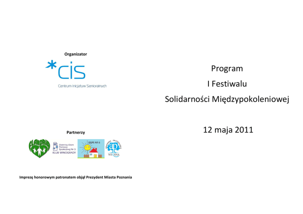 Organizator Program I Festiwalu Solidarności Międzypokoleniowej Partnerzy Imprezę honorowym patronatem objął Prezydent Miasta Poznania 12 maja 2011 10:00-10:10 Uroczyste otwarcie I Festiwalu Solidarności Międzypokoleniowej CZĘŚĆ V 14:00-14:40 (40’) CZĘŚĆ I 10:10-10:50 (40’) Poznaoska Ogólnokształcąca Szkoła Muzyczna II stopnia im. Mieczysława Karłowicza - choreografia przygotowana przez Joannę Nawrocką-Labogę Centrum Edukacji Artystycznej „Iskierka” - „Wiosenne pląsy” (fragment przedstawienia) Szkoła Podstawowa nr 21 im. Filipiny Płaskowickiej - „Mały Książę” (inscenizacja) Zespół AKORD, Dzienny Dom Pomocy Społecznej nr 5 „Klub Winogrady” - „Wiosna radosna” (śpiew) Grupa Teatralna „Za kulisami”, Gimnazjum nr 43 im. Poznaoskiego Towarzystwa Przyjaciół Nauk - Zespół Szkół z Oddziałami Integracyjnymi i Specjalnymi nr 2 - „Bajka o Smoku Wawelskim” Genowefa Rożkowska, Klub „Starówka” - wiersz przy muzyce Poznaoska Ogólnokształcąca Szkoła Muzyczna I stopnia nr 1 im. H. Wieniawskiego - „Taniec pajaca” „Ballady i romanse – taka gmina”, czyli interpretacja utworów Adama Mickiewicza Poznaoska Ogólnokształcąca Szkoła Muzyczna II stopnia im. Mieczysława Karłowicza - choreografia przygotowana przez Joannę Nawrocką - Labogę (kompozycja przestrzenno-ruchowa) 14:40 – 14:55 PRZERWA CZĘŚĆ II 11:00-11:40 (40’) Zespół „Ognisko”, Dom Pomocy Społecznej, ul. Ugory - śpiew Przedszkole nr 148 „Mali Europejczycy” - „Pocztówka CZĘŚĆ VI 14:55-15:35 (40’) z Niemiec” (przedstawienie Towarzystwo Uniwersytet Trzeciego Wieku - „Propozycje dla Seniorów” - prezentacja słuchaczy UTW z sekcji Terapia Taocem i Ruchem pod kierunkiem Olgi Kuźmioskiej teatralno-muzyczne) Dzienny Dom Pomocy Społecznej nr 1, ul. Konopnickiej - hiszpaoskie piosenka i taniec Akademia Trzeciego Wieku, Wyższa Szkoła Nauk Humanistycznych i Dziennikarstwa - taniec w kręgu – różne narodowości Janina Rybarczyk, Klub Seniora „Piastun”, Dom Kultury „Na Skarpie” – „Francois Villon” z repertuaru Bułata Okudżawy Kornelia Mielcarek, Klub Seniora „Piastun”, Dom Kultury „Na Skarpie” - „Ce sera, sera” (śpiew) Zofia Kosmowska, Zespół „Wrzosy”, Dom Kultury „Na Skarpie” – „Gwiazda miłości” (piosenka z repertuaru Haliny Kunickiej) CZĘŚĆ III 11:50-12:35 (45’) Danuta Maria Julska - wiersz poetycki do muzyki Elżbieta Porada - „Giuditta” (pieśo z repertuaru operetkowego) Amatorski Klub Literacki, Ośrodek Pomocy Społecznej w Śremie - „Wiosenne inspiracje” (poezja) Zespół działający przy Dziennym Domu Pomocy Społecznej nr 3 „Klub Promieo” oraz Marianna Dom Opiekuoczo-Wychowawczy dla dziewcząt im. bł. Marii Karłowskiej - „Uciekając przed życiem” (przedstawienie) 12:35 – 12:55 PRZERWA CZĘŚĆ IV 12:55-13:50 (55’) Wachowiak - „To co nam drogie” (śpiew) i „W sercu maj” (poezja) Klub Seniora przy Towarzystwie Pomocy Potrzebującym im. Św. Brata Alberta „Nadzieja” w Śremie „Śpiewad każdy może” Chór „Przyjaciele”, Klub Seniora działający przy Domu Kultury „Pod Lipami” - „Przyjaciele” (śpiew) Mateusz Porada - „Uśmiechnij się mamo” (śpiew) Stowarzyszenie „mali bracia Ubogich” - „Metoda na chłopa” (kabaret) DDPS nr 6 „Słoneczna Przystao” - „Siebie dam po ślubie” (śpiew i taniec) Patryk Zbaraż - „Przygoda ze służbą zdrowia” (gwara poznaoska) Zespół „Wesoła Ferajna” - „Santa Lucia” i „Paloma” (śpiew) CZĘŚĆ VII 15:45-16:25 (40’) Gościnny minirecital śpiewaczki operetkowej Darii Wójcik Uroczyste zakooczenie Festiwalu i wręczenie dyplomów