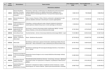 Lp. numer wniosku Wnioskodawca Nazwa wniosku Koszt całkowity projektu (PLN) Koszt kwalifikowalny (PLN) EFRR Infrastruktura zabytkowa 1 3/II/16 Muzeum Narodowe Rolnictwa i Przemysłu Rolno-Spożywczego w Szreniawie Konserwacja, restauracja i rewaloryzacja oraz zabezpieczenie przed zniszczeniem i kradzieżą zabytków techniki oraz zabytków drewnianych znajdujących się w posiadaniu Muzeum Narodowego Rolnictwa i Przemysłu Rolno-Spożywczego w Szreniawie 8 660 144,78 7 042 386,00 5 986 878,10 2 9/II/16 Muzeum Narodowe w Kielcach Pałac w muzeum, Muzeum w Pałacu. Ochrona, zachowanie i udostępnienie na cele publiczne zabytków ruchomych i nieruchomych o znaczeniu ogólnopolskim 21 559 772,02 17 324 907,69 14 726 171,53 3 17/II/16 Akademia Muzyczna im. Przebudowa i aranżacja wybranych wnętrz służących działalności kulturalnej w Karola Lipińskiego we budynku głównym Akademii Muzycznej im. Karola Lipińskiego we Wrocławiu Wrocławiu 5 546 810,23 4 513 341,65 3 836 340,40 4 18/II/16 Parafia EwangelickoAugsburska pw. Św. Trójcy w Świdnicy Konserwacja i renowacja drewnianego obiektu zabytkowego UNESCO - Kościoła Pokoju w Świdnicy, w celu ochrony dziedzictwa kulturowego 19 756 782,87 19 756 782,87 16 793 265,43 5 19/II/16 Gmina Miasta Toruń Toruńska Starówka - ochrona i konserwacja dziedzictwa kulturowego UNESCO - etap II 71 351 889,73 63 916 142,36 54 328 721,00 6 24/II/16 Zamek Królewski na Wawelu - Państwowe Zbiory Sztuki Wawel - dziedzictwo dla przyszłości 29 754 565,29 25 166 577,64 21 391 590,99 7 27/II/16 Miasto Łódź Rewitalizacja, modernizacja i poprawa infrastruktury zabytkowego obiektu Muzeum Miasta Łodzi - Pałacu Poznańskich w części użytkowanej przez Muzeum Miasta Łodzi 20 785 794,61 16 664 256,43 14 164 617,96 8 30/II/16 Parafia Rzymskokatolicka Zwiastowania NMP oo. Rewitalizacja największego XVII-wiecznego barokowego kościoła oo. Franciszków w Franciszkanów w Polsce - Zamość Zamościu 23 813 910,08 23 795 460,08 20 226 141,06 9 33/II/16 Akademia Sztuk Pięknych Akademickie Centrum Designu na rzecz rozwoju dziedzictwa kulturowego i edukacji im. Wł. Strzemińskiego w artystycznej Łodzi 21 608 339,05 17 576 252,28 14 939 814,43 10 35/II/16 Prawosławna Diecezja Lubelsko-Chełmska 23 512 831,94 23 512 831,94 19 985 907,12 11 36/II/16 Prowincja Misjonarzy Zachowanie i udostępnienie zabytku o wyjątkowej wartości artystycznej - zespołu Oblatów Maryi klasztornego pw. Św. Józefa w Gdańsku - poprzez prace konserwatorskie i renowację Niepokalanej w Poznaniu 19 060 770,65 19 059 540,65 16 200 609,55 Wschodniosłowiańskie dziedzictwo kulturowe - konserwacja, renowacja i digitalizacja drewnianych cerkwi i ich wyposażenia w małopolsce, na podkarpaciu lubelszczyźnie i podlasiu 12 38/II/16 Parafia Rzymskokatolicka Renowacja i konserwacja drewnianych zabytków Archidiecezji Gnieźnieńskiej celem pw. Św. Mikołaja Biskupa stworzenia nowej oferty kulturalno-edukacyjnej w Lądku 13 39/II/16 Diecezja Kaliska 14 40/II/16 Archidiecezja Gnieźnieńska 15 15 270 031,90 15 270 031,90 12 979 527,11 Szlakiem zabytkowych kościołów obszaru Diecezji Kaliskiej - rewaloryzacja i konserwacja zabytków drewnianych celem ochrony dziedzictwa kulturowego oraz wzrostu atrakcyjności regionu Etap II 12 469 232,26 12 469 232,26 10 598 847,42 Renowacja i konserwacja Katedry pw. Wniebowzięcia Najświętszej Maryi Panny i św. Wojciecha w Gnieźnie celem ochrony dziedzictwa kulturowego Polski 12 570 835,40 12 570 835,40 10 685 210,09 41/II/16 Parafia Rzymskokatolicka pw. Św. Tomasza Drewniane Perły Ziemi Lubawskiej - konserwacja drewnianych zabytków celem Apostoła w Nowym wzrostu atrakcyjności kulturowej regionu Mieście Lubawskim 18 413 649,19 18 413 649,19 15 651 601,81 16 43/II/16 Fundacja Doliny Pałaców Rewitalizacja folwarku w Bukowcu w celu utworzenia Centrum Kulturalnoi Ogrodów Kotliny Edukacyjnego Jeleniogórskiej 13 157 577,38 10 657 140,42 9 058 569,36 17 50/II/16 Centrum Kultury "Zamek" Konserwacja reprezentacyjnych wnętrz zachodniej części dawnego zamku cesarskiego w Poznaniu i ich adaptacja celem efektywnego wykorzystania dziedzictwa kulturowego 20 987 097,47 16 872 800,90 14 341 880,76 18 51/II/16 Diecezja Bydgoska Ochrona oraz zwiększenie wartości dziedzictwa kulturowego obszaru Diecezji Bydgoskiej - rewaloryzacja i konserwacja drewnianych zabytków 15 724 200,43 15 724 200,43 13 365 570,36 19 53/II/16 Archidiecezja Lubelska Pomniki historii - duże i małe. Bogactwo i różnorodność dziedzictwa kulturowego Lubelszczyzny - ochrona i udostępnianie wybranych obiektów sakralnych Lublina i Kazimierza Dolnego 16 161 728,24 16 140 455,14 13 719 386,86 20 57/II/16 Klasztor Ojców Dominikanów w Krakowie Kompleksowa konserwacja Bazyliki Trójcy Świętej w Krakowie jako jeden z elementów rewitalizacji założenia klasztornego Ojców Dominikanów w Krakowie, związanej z osiemsetną rocznicą powstania klasztoru 25 208 628,82 24 663 738,81 20 964 177,98 21 58/II/16 Biblioteka Raczyńskich w Modernizacja budynku Biblioteki Raczyńskich w Poznaniu oraz konserwacja i Poznaniu digitalizacja cennych zbiorów bibliotecznych 20 639 047,69 16 730 518,45 14 220 940,68 22 60/II/16 Parafia Rzymskokatolicka św. Jakuba Starszego Rewitalizacja i renowacja gotyckiej Bazyliki św. Jakuba w Nysie w celu podniesienia Apostoła i św. Agnieszki walorów turystycznych i kulturowych w Nysie 20 767 403,77 20 718 203,77 17 610 473,18 23 61/II/16 Muzeum Okręgowe w Nowym Sączu 13 608 004,62 10 729 028,61 9 119 674,31 SKANSENNOVA - systemowa opieka nad dziedzictwem w małopolskich muzeach na wolnym powietrzu 63/II/16 Parafia Rzymskokatolicka pw. Wniebowzięcia Rewitalizacja i ochrona dziedzictwa kulturowego zespołu Bazyliki Mariackiej w Najświętszej Maryi Gdańsku Panny w Gdańsku 21 608 749,99 21 358 749,99 18 154 937,49 25 65/II/16 Parafia Katedralna "Fabrica Ecclesiae" - remont zabytkowego budynku Infułatki na cele rozwoju Zmartwychwstania działalności 