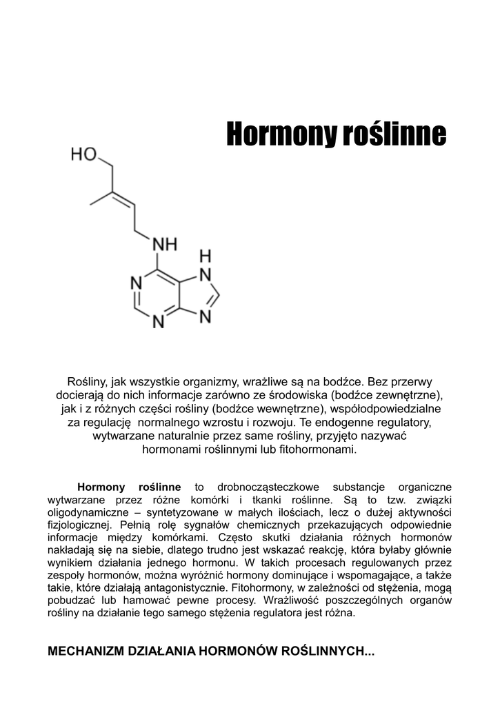 Hormony roślinne Rośliny, jak wszystkie organizmy, wrażliwe są na bodźce. Bez przerwy docierają do nich informacje zarówno ze środowiska (bodźce zewnętrzne), jak i z różnych części rośliny (bodźce wewnętrzne), współodpowiedzialne za regulację normalnego wzrostu i rozwoju. Te endogenne regulatory, wytwarzane naturalnie przez same rośliny, przyjęto nazywać hormonami roślinnymi lub fitohormonami. Hormony roślinne to drobnocząsteczkowe substancje organiczne wytwarzane przez różne komórki i tkanki roślinne. Są to tzw. związki oligodynamiczne – syntetyzowane w małych ilościach, lecz o dużej aktywności fizjologicznej. Pełnią rolę sygnałów chemicznych przekazujących odpowiednie informacje między komórkami. Często skutki działania różnych hormonów nakładają się na siebie, dlatego trudno jest wskazać reakcję, która byłaby głównie wynikiem działania jednego hormonu. W takich procesach regulowanych przez zespoły hormonów, można wyróżnić hormony dominujące i wspomagające, a także takie, które działają antagonistycznie. Fitohormony, w zależności od stężenia, mogą pobudzać lub hamować pewne procesy. Wrażliwość poszczególnych organów rośliny na działanie tego samego stężenia regulatora jest różna. MECHANIZM DZIAŁANIA HORMONÓW ROŚLINNYCH... Wyniki prowadzonych od dziesięcioleci badań fizjologicznych wykazywały plejotropowość (zjawisko, w którym jeden czynnik ma więcej niż jeden efekt) działania hormonów roślinnych, co w świadomości wielu fizjologów roślin wytworzyło przekonanie o ich niespecyficzności. W miarę poznawania molekularnych mechanizmów funkcjonowania fitohormonów staje się jasne, że działanie każdego z nich jest jednak specyficzne, czego podstawą są odrębne receptory i związane z nimi szlaki sygnałowe. Ogólny mechanizm działania hormonów przedstawia poniższy schemat. RYCINA 36-13, „Biologia” wyd. MULTICO, rok 2007, str. 698 1 Hormon wiąże się ze specyficznym receptorem białkowym znajdującym się na powierzchni błony komórkowej (lub w komórce). Każdy receptor o charakterystycznej strukturze przestrzennej może wiązać cząsteczki tylko określonego hormonu. 2 Przyłączenie hormonu aktywuje białko G w błonie komórkowej, po czym białko to wyzwala produkcję wtórnego przekaźnika (wewnątrzkomórkowej cząsteczki sygnałowej wpływającej na funkcje komórki), np. Ca2+. 3 Wzrost stężenia jonów Ca2+ lub innego wtórnego przekaźnika może prowadzi do interakcji z określonym białkiem i w konsekwencji do aktywacji (lub inaktywacji) niektórych enzymów, np. kinaz białkowych 4 Enzymy te katalizują fosforylację specyficznych białek, które z pewien sposób zmieniają aktywność metaboliczną komórki, np. zmieniają przepuszczalność błon i (lub) ekspresję określonych genów. PRZEGLĄD REGULATORÓW WZROSTU I ROZWOJU ROŚLIN... Wyróżniamy zasadniczo pięć grup regulatorów wzrostu: - Auksyny - Gibereliny - Cytokininy - Etylen - Inhibitory wzrostu, np. ABA (kwas abscysynowy) Niezależnie od tego podziału wśród regulatorów wzrostu można wyróżnić regulatory endogenne, tzn. wytwarzane naturalnie przez same rośliny oraz egzogenne, czyli wytwarzane sztucznie i wprowadzane do roślin jako syntetyczne preparaty. Biolodzy ustawicznie odkrywają nowe hormony roślinne i cząsteczki sygnałowe o działaniu podobnym do hormonów. Wiele z tych cząsteczek uczestniczy w obronie roślin przed atakami organizmów chorobotwórczych i owadów. Są to np. jasmonidy, brasynosteroidy, czy kwas salicylowy. AUKSYNY Auksyna jest pierwszym wykrytym naturalnym fitohormonem. Już Karol Darwin wraz z synem prowadzili doświadczenia dotyczące dodatniego fototropizmu, tzn. wzrostu rośliny w kierunku światła. Jednak dopiero w latach 20. ubiegłego stulecia duński badacz, Frits Went, wyizolował z koleoptylu owsa (czyli z pochewki otaczającej pęd) hormon odpowiedzialny za fototropizm. Obecnie wiemy, że auksyna jest mieszaniną kilku naturalnych (lub sztucznych) hormonów roślinnych. Najczęściej występującym i najważniejszym jest kwas indolilooctowy IAA. Auksyny syntetyzowane są w merystemach wierzchołkowych pędu oraz w młodych liściach i nasionach. Transportowane są łykiem do innych części rośliny w kierunku od wierzchołka do podstawy pędu. Cechą charakterystyczną auksyn jest wpływ na wydłużanie komórek w strefach wzrostu rośliny. Przypuszczalnie zwiększają plastyczność ściany komórkowej przez jej zakwaszanie i umożliwiają tym samym jej rozciąganie pod wpływem ciśnienia turgorowego komórki. Testy i doświadczenia wykazały wzrost elastyczności ścian komórek po zacienionej stronie rośliny. Oznacza to, że zanim auksyny zaczną przesuwać się w dół, przemieszczają się poziomo do nieoświetlonej części, gdzie wzrasta ich stężenie. W wyniku tego, komórki w tej części zaczynają wydłużać się szybciej niż po stronie oświetlonej, co w konsekwencji prowadzi do wygięcia się łodygi w kierunku światła. Pobudzając wzrost elongacyjny (wydłużeniowy) tkanek pędu, auksyny stymulują wzrost pędu głównego, a hamują wzrost pędów bocznych (dominacja wierzchołkowa). Często pąki boczne nie rozwijają się, dopóki występuje pąk szczytowy. Usunięcie merystemu szczytowego oznacza usunięcie źródła auksyny, więc pąki boczne mogą się rozwijać (często jednak do momentu, gdy jedno z odgałęzień zacznie hamować wzrostu innych). Opisane dalej cytokininy i etylen współodpowiadają za dominację wierzchołkową. Reakcje wzrostowe pędu i korzenia są przeciwstawne, ale w obu przypadkach auksyna gromadzi się po tej samej spodniej stronie. Okazało się, że organy te w odmienny sposób reagują na to samo stężenie fitohormonu. Auksyna w stężeniu stymulującym wzrost spodniej strony wierzchołka pędu hamował wzrost spodniej strony wierzchołka korzenia. VADEMECUM MATURA 2009 wyd OPERON, str.