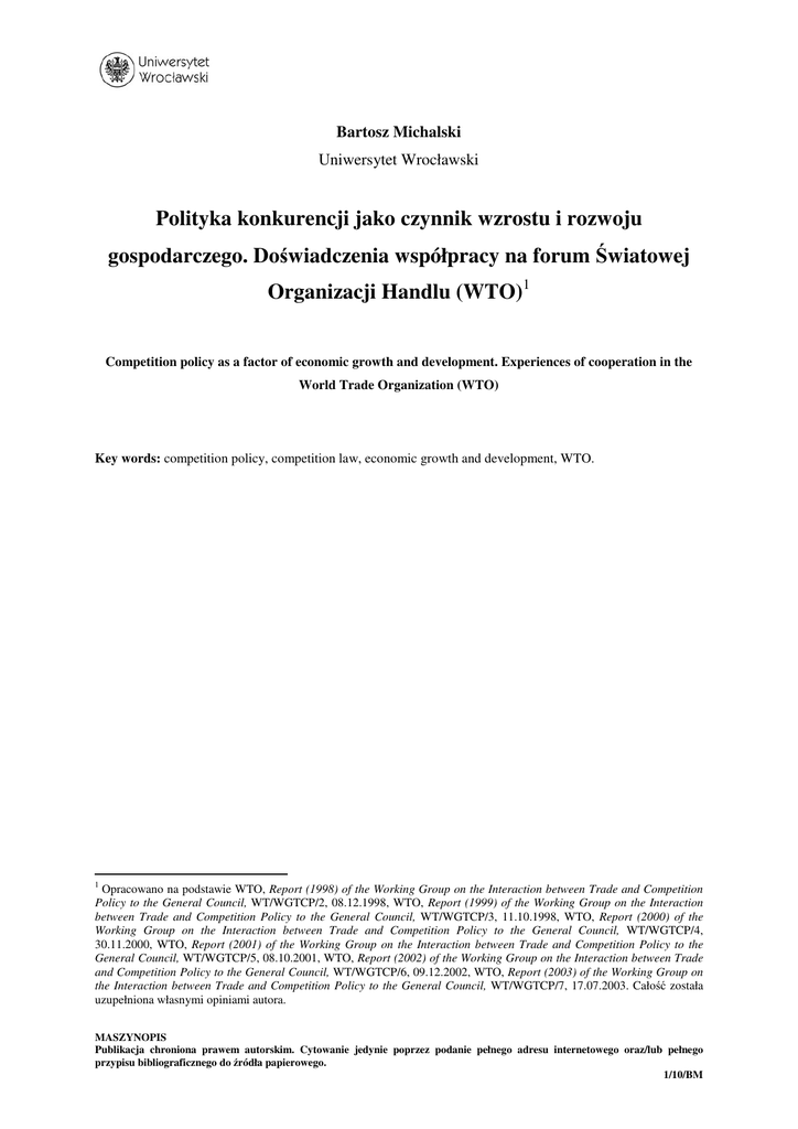 Bartosz Michalski Uniwersytet Wrocławski Polityka konkurencji jako czynnik wzrostu i rozwoju gospodarczego. Doświadczenia współpracy na forum Światowej Organizacji Handlu (WTO)1 Competition policy as a factor of economic growth and development. Experiences of cooperation in the World Trade Organization (WTO) Key words: competition policy, competition law, economic growth and development, WTO. 1 Opracowano na podstawie WTO, Report (1998) of the Working Group on the Interaction between Trade and Competition Policy to the General Council, WT/WGTCP/2, 08.12.1998, WTO, Report (1999) of the Working Group on the Interaction between Trade and Competition Policy to the General Council, WT/WGTCP/3, 11.10.1998, WTO, Report (2000) of the Working Group on the Interaction between Trade and Competition Policy to the General Council, WT/WGTCP/4, 30.11.2000, WTO, Report (2001) of the Working Group on the Interaction between Trade and Competition Policy to the General Council, WT/WGTCP/5, 08.10.2001, WTO, Report (2002) of the Working Group on the Interaction between Trade and Competition Policy to the General Council, WT/WGTCP/6, 09.12.2002, WTO, Report (2003) of the Working Group on the Interaction between Trade and Competition Policy to the General Council, WT/WGTCP/7, 17.07.2003. Całość została uzupełniona własnymi opiniami autora. MASZYNOPIS Publikacja chroniona prawem autorskim. Cytowanie jedynie poprzez podanie pełnego adresu internetowego oraz/lub pełnego przypisu bibliograficznego do źródła papierowego. 1/10/BM Wprowadzenie Dyskusja nad powiązaniami łączącymi politykę handlową — jako podstawową sferę aktywności WTO — oraz politykę konkurencji wynika z zasadniczo z przeświadczenia, iż każda z nich ma w perspektywie długookresowej przyczyniać się do kreowania korzystnych warunków dla funkcjonowania przedsiębiorstw. Ich dynamiczny rozwój ma się przełożyć na wzrost gospodarczy, zwiększenie inwestycji, zatrudnienia i wreszcie poprawę konkurencyjności zarówno samych firm, jak i całej gospodarki. Warto więc tej spodziewanej sekwencji procesów przyjrzeć się bliżej, by spróbować określić, jakie przeszkody mogą się ewentualnie w tym zakładanym pozytywnym scenariuszu pojawić. Polityka handlowa i polityka konkurencji – zarys wzajemnych relacji Zagadnieniem, które niejako wymusza połączenie i skoordynowanie działań podejmowanych na gruncie polityki handlowej i polityki konkurencji, jest postępująca liberalizacja handlu światowego. Rozumie się ją zwykle jako eliminowanie wszelkiego rodzaju barier, które utrudniają wymianę międzynarodową, a tym samym mają negatywny wpływ na międzynarodowy podział pracy (kierunki specjalizacji), a co za tym idzie na optymalne (najbardziej efektywne) wykorzystanie rzadkich zasobów. Tym samym polityka konkurencji i polityka handlowa w zasadniczej mierze mają względem siebie charakter komplementarny. Wynika to przede wszystkim z faktu, iż ta pierwsza ukierunkowana jest na kontrolę zachowań przedsiębiorstw na obszarze danego kraju, co z kolei ma zasadniczy wpływ na stopień natężenia konkurencji na danym rynku. Ta druga zaś orientuje się głównie na działania podejmowane przez agendy/instytucje administracji rządowej, które znajdują swój najbardziej praktyczny wyraz w momencie, gdy określone dobro przekracza granicę celną kraju. Względy, które uzasadniają stosowanie strategicznej polityki handlowej, związane są z szeroko rozumianym protekcjonizmem wynikającym z chęci wspomożenia rozwoju przedsiębiorstw krajowych przy ograniczeniu na pewien określony czas (niekiedy także na stałe) działań podejmowanych przed podmioty pochodzące z zagranicy. Na styku analizowanych tu polityk pojawia się zatem pierwsze istotne zagrożenie. Chęć wsparcia własnego rozwoju poprzez ograniczenia handlowe może niekiedy przynieść negatywny skutek w postaci zintensyfikowania zachowań antykonkurencyjnych podejmowanych przez MASZYNOPIS Publikacja chroniona prawem autorskim. Cytowanie jedynie poprzez podanie pełnego adresu internetowego oraz/lub pełnego przypisu bibliograficznego do źródła papierowego. 2/10/BM krajowych przedsiębiorców. Pozbawieni zagrożenia zewnętrznego mogą się oni zacząć orientować na wyeliminowanie krajowych konkurentów. Nie stanowi to jednak gwarancji, że po zniesieniu ochrony w ramach polityki handlowej będą zdolni do podjęcia rywalizacji w skali międzynarodowej. Przeciwnie, rządy krajów mogą mimowolnie stać się zakładnikiem ich bieżących interesów. Rysuje więc tutaj pewnego rodzaju dylemat wymagający rozstrzygnięcia. Sama liberalizacja handlu międzynarodowego wyraźnie wspiera zasadniczy cel polityki konkurencji, jakim jest zapewnienie efektywnego dostępu do rynku i równe warunki konkurencji. Pytania dotyczą jednak problemu oczekiwanej sekwencji podejmowanych działań. Dzieje się tak, ponieważ nie każda gospodarka (w sensie tworzących ją przedsiębiorstw oraz instytucji regulacyjnych) jest jednakowo organizacyjnie i kompetencyjnie na taką sytuację przygotowana. Z perspektywy problemów, z jakimi borykają się kraje rozwijające się i najsłabiej rozwinięte, coraz częściej daje się słyszeć argument, który akcentuje zasadność zróżnicowanego podejścia w tej materii, gdyż nie można podmiotów ekonomicznie nierównych (dysponujących różną siłą) traktować tak samo. Liberalizacja handlu a wspieranie konkurencyjności krajowych przedsiębiorstw Spektrum możliwości wyznaczają dwa skrajne, najczęściej jednak odrzucane rozwiązania. Pierwsze postuluje najpierw liberalizację wymiany a następnie swego rodzaju utworzenie ładu rynkowego poprzez wdrożenie prawa i prowadzenie polityki konkurencji. Drugie przedstawia potrzebę przeprowadzenia restrukturyzacji i industrializacji. Są to więc działania, przy których wsparcie rządowe jest konieczne i ma w większości przypadków charakter selektywny, wymierz