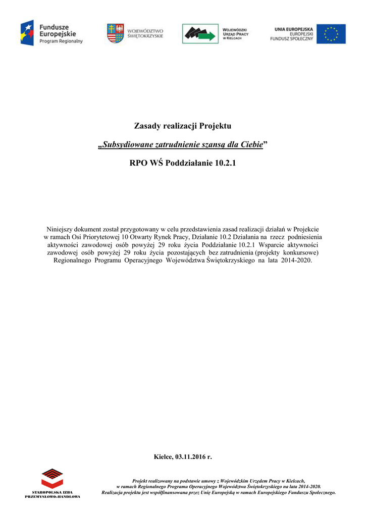 Zasady realizacji Projektu „Subsydiowane zatrudnienie szansą dla Ciebie” RPO WŚ Poddziałanie 10.2.1 Niniejszy dokument został przygotowany w celu przedstawienia zasad realizacji działań w Projekcie w ramach Osi Priorytetowej 10 Otwarty Rynek Pracy, Działanie 10.2 Działania na rzecz podniesienia aktywności zawodowej osób powyżej 29 roku życia Poddziałanie 10.2.1 Wsparcie aktywności zawodowej osób powyżej 29 roku życia pozostających bez zatrudnienia (projekty konkursowe) Regionalnego Programu Operacyjnego Województwa Świętokrzyskiego na lata 2014-2020. Kielce, 03.11.2016 r. Projekt realizowany na podstawie umowy z Wojewódzkim Urzędem Pracy w Kielcach, w ramach Regionalnego Programu Operacyjnego Województwa Świętokrzyskiego na lata 2014-2020. Realizacja projektu jest współfinansowana przez Unię Europejską w ramach Europejskiego Funduszu Społecznego. §1 Postanowienia ogólne 1. 2. 3. 4. 5. Staropolska Izba Przemysłowo-Handlowa realizuje Projekt nr RPSW.10.02.01-26-0040/16-00 „Subsydiowane zatrudnienie szansą dla Ciebie”. Projekt realizowany jest w ramach Osi Priorytetowej 10 Otwarty Rynek Pracy, Działanie 10.2 Działania na rzecz podniesienia aktywności zawodowej osób powyżej 29 roku życia Poddziałanie 10.2.1 Wsparcie aktywności zawodowej osób powyżej 29 roku życia pozostających bez zatrudnienia (projekty konkursowe) Regionalnego Programu Operacyjnego Województwa Świętokrzyskiego na lata 2014-2020. Projekt jest współfinansowany ze środków UE - Europejskiego Funduszu Społecznego. Okres realizacji projektu: od 01.11.2016 r. do 30.04.2018 r. Niniejszy Regulamin określa zasady udziału w Projekcie Uczestników projektu i pracodawców. §2 Definicje Używane w ramach niniejszego Regulaminu określenia każdorazowo oznaczają: Projekt – projekt „Subsydiowane zatrudnienie szansą dla Ciebie”, realizowany jest przez Staropolską Izbę Przemysłowo-Handlową. 2. Instytucja Pośrednicząca – Wojewódzki Urząd Pracy w Kielcach. 3. SIPH – Staropolska Izba Przemysłowo – Handlowa w Kielcach. 4. Biuro Projektu – siedziba Staropolskiej Izby Przemysłowo-Handlowej, ul. Sienkiewicza 53, Kielce. 5. Kandydat – osoba powyżej 29 roku życia, bezrobotna lub bierna zawodowo, kobieta lub mężczyzna, zamieszkała na terenie województwa świętokrzyskiego, o niskich kwalifikacjach zawodowych (wykształcenie podstawowe lub gimnazjalne), zamierzająca podjąć zatrudnienie, przy czym zarejestrowana w Miejskim / Powiatowym Urzędzie Pracy musi posiadać pierwszy lub drugi profil pomocy, która złożyła dokumenty rekrutacyjne. 6. Uczestnik Projektu – Kandydat, który zostanie zakwalifikowany do Projektu, zgodnie z zasadami określonymi w niniejszym Regulaminie. 7. Osoba bezrobotna – to osoba pozostająca bez pracy, gotowa do podjęcia pracy i aktywnie poszukująca zatrudnienia, zarejestrowana w Miejskim / Powiatowym Urzędzie Pracy jako bezrobotna, dla której ustalono pierwszy lub drugi profil pomocy (bezrobotny aktywny i bezrobotny wymagający wsparcia) zgodnie z art. 33 ustawy z dnia 20 kwietnia 2004 r. o promocji zatrudnienia i instytucjach rynku pracy (Dz. U. z 2015 r., poz. 149, z późn. zm.). 8. Osoba bierna zawodowa (nieaktywna zawodowo) – to osoba pozostającą bez zatrudnienia lecz niezarejestrowana w Miejskim / Powiatowym Urzędzie Pracy jako bezrobotna. 9. Osoba powyżej 29 roku życia - do projektu kwalifikować się będą wyłącznie osoby, które w dniu rozpoczęcia udziału w projekcie ukończyły 30 rok życia. Wiek uczestników określany jest na podstawie daty urodzenia i ustalany w dniu rozpoczęcia udziału w projekcie. 10. Dzień przystąpienia do Projektu – dzień podpisania umowy. 11. Dokumenty rekrutacyjne – komplet dokumentów, które należy złożyć w Biurze Projektu, w terminie podanym w ogłoszeniu o naborze. 12. Komisja Rekrutacyjna – zespół oceniający dokumenty rekrutacyjne do Projektu i dokonujący kwalifikacji Kandydatów na Uczestników projektu oraz pracodawców do udziału w Projekcie. 1. Projekt realizowany na podstawie umowy z Wojewódzkim Urzędem Pracy w Kielcach, w ramach Regionalnego Programu Operacyjnego Województwa Świętokrzyskiego na lata 2014-2020. Realizacja projektu jest współfinansowana przez Unię Europejską w ramach Europejskiego Funduszu Społecznego. 13. Doposażenie stanowiska pracy - oznacza dokonanie przez pracodawcę zakupu brakujących elementów niezbędnych do wykonywania pracy na stanowisku. 14. Wyposażenie stanowiska pracy - oznacza zorganizowanie przez pracodawcę nowego stanowiska pracy w wyniku zakupienia sprzętu niezbędnego do wykonywania pracy na tym stanowisku. 15. Pracodawca - oznacza to podmiot prowadzący działalność gospodarczą w rozumieniu ustawy z dnia 02 lipca 2004 r. o swobodzie działalności gospodarczej (Dz. U. Nr 173, poz. 1807 z późn. zm.). 16. Refundacja – oznacza zwrot dokonany przez SIPH części lub całości kosztów związanych z subsydiowanym zatrudnieniem lub kosztów poniesionych na wyposażenie lub doposażenie stanowiska pracy dla skierowanej osoby bezrobotnej. 17. Wniosek Kandydata – oznacza to Wniosek o uczestnictwo w projekcie w zakresie udzielenia wsparcia w formie indywidualnego planu działania, poradnictwa zawodowego, subsydiowania zatrudnienia, wyposażenia lub doposażenia stanowiska pracy. 18. Wniosek Pracodawcy - oznacza to Wniosek o refundację kosztów zatrudnienia Uczestnika Projektu w ramach subsydiowanego zatrudnienia i jednocześnie refundację kosztów wyposażenia lub doposażenia stanowiska pracy dla skierowanego bezrobotnego/biernego zawodowego. 19. Wnioskodawca – oznacza pracodawcę, składającego wniosek o refundację kosztów zatrudnienia Uczestnika Projektu w ramach subsydiowanego zatrudnienia i jednocześnie kosztów wyposażenia stanowiska pracy dla skierowanego bezrobotnego/biernego zawodowego. 20. Pracownik – Uczestnik Projektu zatrudniony u Pracodawcy biorącego udział w Proj