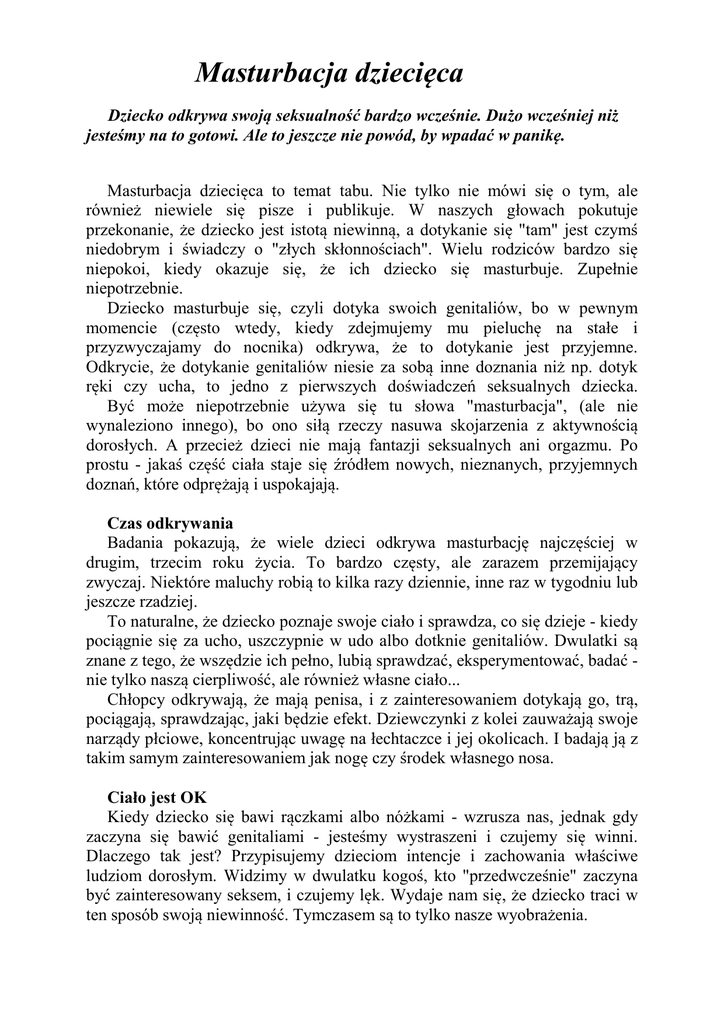 Masturbacja dziecięca Dziecko odkrywa swoją seksualność bardzo wcześnie. Dużo wcześniej niż jesteśmy na to gotowi. Ale to jeszcze nie powód, by wpadać w panikę. Masturbacja dziecięca to temat tabu. Nie tylko nie mówi się o tym, ale również niewiele się pisze i publikuje. W naszych głowach pokutuje przekonanie, że dziecko jest istotą niewinną, a dotykanie się "tam" jest czymś niedobrym i świadczy o "złych skłonnościach". Wielu rodziców bardzo się niepokoi, kiedy okazuje się, że ich dziecko się masturbuje. Zupełnie niepotrzebnie. Dziecko masturbuje się, czyli dotyka swoich genitaliów, bo w pewnym momencie (często wtedy, kiedy zdejmujemy mu pieluchę na stałe i przyzwyczajamy do nocnika) odkrywa, że to dotykanie jest przyjemne. Odkrycie, że dotykanie genitaliów niesie za sobą inne doznania niż np. dotyk ręki czy ucha, to jedno z pierwszych doświadczeń seksualnych dziecka. Być może niepotrzebnie używa się tu słowa "masturbacja", (ale nie wynaleziono innego), bo ono siłą rzeczy nasuwa skojarzenia z aktywnością dorosłych. A przecież dzieci nie mają fantazji seksualnych ani orgazmu. Po prostu - jakaś część ciała staje się źródłem nowych, nieznanych, przyjemnych doznań, które odprężają i uspokajają. Czas odkrywania Badania pokazują, że wiele dzieci odkrywa masturbację najczęściej w drugim, trzecim roku życia. To bardzo częsty, ale zarazem przemijający zwyczaj. Niektóre maluchy robią to kilka razy dziennie, inne raz w tygodniu lub jeszcze rzadziej. To naturalne, że dziecko poznaje swoje ciało i sprawdza, co się dzieje - kiedy pociągnie się za ucho, uszczypnie w udo albo dotknie genitaliów. Dwulatki są znane z tego, że wszędzie ich pełno, lubią sprawdzać, eksperymentować, badać nie tylko naszą cierpliwość, ale również własne ciało... Chłopcy odkrywają, że mają penisa, i z zainteresowaniem dotykają go, trą, pociągają, sprawdzając, jaki będzie efekt. Dziewczynki z kolei zauważają swoje narządy płciowe, koncentrując uwagę na łechtaczce i jej okolicach. I badają ją z takim samym zainteresowaniem jak nogę czy środek własnego nosa. Ciało jest OK Kiedy dziecko się bawi rączkami albo nóżkami - wzrusza nas, jednak gdy zaczyna się bawić genitaliami - jesteśmy wystraszeni i czujemy się winni. Dlaczego tak jest? Przypisujemy dzieciom intencje i zachowania właściwe ludziom dorosłym. Widzimy w dwulatku kogoś, kto "przedwcześnie" zaczyna być zainteresowany seksem, i czujemy lęk. Wydaje nam się, że dziecko traci w ten sposób swoją niewinność. Tymczasem są to tylko nasze wyobrażenia. Z punktu widzenia malucha jest zupełnie inaczej. Warto pamiętać, że jednym z zadań, które stoją przed nami, jest nauczenie dziecka zdrowego podejścia do własnej seksualności. Oczywiście dla każdego z nas może to znaczyć coś innego. Ktoś uważa, że zdrowa jest powściągliwość, ktoś inny zaś nie widzi nic zdrożnego w seksie jako takim. Niezależnie jednak od naszych wartości, które w tej kwestii mogą się bardzo od siebie różnić, każdy z nas chciałby, by jego dziecko było zadowolone z życia, a w przyszłości umiało wchodzić w szczęśliwe związki. Do tego konieczne jest przekazanie maluchowi, że jego ciało, a wraz z tym cała sfera seksualna, to coś dobrego i wartościowego, co nie może się kojarzyć z grzechem ani brudem. Najlepszą drogą do zdrowego podejścia do seksu jest akceptacja ciała dziecka (całego) oraz dobra komunikacja. Nie ma nic gorszego od dawania maluchowi do zrozumienia, że robi coś złego... Cenna intymność To wszystko, co napisano powyżej, nie oznacza, że w ogóle nie należy zwracać uwagi na zachowania dziecka związane z jego seksualnością. Od małego warto przyzwyczajać malca do przestrzegania pewnych społecznych norm. Tak jak nie rozbieramy się do golasa publicznie, tak samo nie dotykamy swoich intymnych miejsc w obecności obcych ludzi. Małe dziecko nie zdaje sobie sprawy ze społecznych konsekwencji, jakie może mieć jego zachowanie (wyśmiewanie, drwiny, oburzenie), więc nie wie, że nie powinno dotykać swoich genitaliów publicznie. Dla niego to taka sama zabawa jak podskoki czy robienie min. Ustal więc granice: powiedz, że to jest czynność intymna tak jak pobyt w toalecie i że ludzie robią to, kiedy są sami - w sypialni lub w łazience. Panika niepotrzebna Nie ma żadnych medycznych podstaw ani dowodów na to, że masturbacja wpływa negatywnie na zdrowie dziecka. Problem może pojawić się jedynie wtedy, gdy dorośli reagują na takie zachowania malucha w sposób przesadny, widząc w tym jakąś dewiację, coś niezdrowego. Wtedy dziecko może się poczuć winne lub odrzucone, a to może wpłynąć na jego rozwój emocjonalny i seksualny. To jest niezdrowe W nielicznych, rzadko spotykanych sytuacjach warto interweniować. Powinniśmy wkroczyć zawsze wtedy, gdy dziecko - idąc za swoją potrzebą badawczą - zaczyna eksplorować swoje narządy w taki sposób, że może sobie zrobić krzywdę. Gdy traktuje swoje ciało jak przedmiot, poddaje je eksperymentom (np. sprawdza jego odporność, wkładając sobie jakiś przedmiot do różnych otworów ciała). Takie zabawy są groźne dla zdrowia i trzeba je przerwać. Należy jasno powiedzieć dziecku, że nie zgadzamy się z tego powodu na takie zachowanie. Najlepiej, jeśli zakazowi będzie towarzyszyła inna propozycja, odwrócenie uwagi, nowa zabawa, coś atrakcyjnego i przyjemnego. Dziecko dowiaduje się w ten sposób, że kieruje nami troska i interesuje nas ochrona jego ciała, a nie sam fakt, że dotyka narządów płciowych. Szukanie ciepła Naszą czujność powinna wzbudzić sytuacja, w której zauważamy, że masturbacja zaspokaja inną potrzebę niż przyjemność - służy rozładowaniu napięcia, zaspokojeniu potrzeby bezpieczeństwa czy obniżeniu lęku. Często wtedy dziecko stymuluje się w sposób jawny, niekiedy demonstracyjny. 