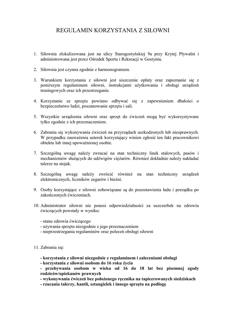 REGULAMIN KORZYSTANIA Z SIŁOWNI 1. Siłownia zlokalizowana jest na ulicy Starogostyńskiej 9a przy Krytej Pływalni i administrowana jest przez Ośrodek Sportu i Rekreacji w Gostyniu. 2. Siłownia jest czynna zgodnie z harmonogramem. 3. Warunkiem korzystania z siłowni jest uiszczenie opłaty oraz zapoznanie się z poniższym regulaminem siłowni, instrukcjami użytkowania i obsługi urządzeń treningowych oraz ich przestrzeganie. 4. Korzystanie ze sprzętu powinno odbywać się z zapewnieniem dbałości o bezpieczeństwo ludzi, poszanowanie sprzętu i sali. 5. Wszystkie urządzenia siłowni oraz sprzęt do ćwiczeń mogą być wykorzystywane tylko zgodnie z ich przeznaczeniem. 6. Zabrania się wykonywania ćwiczeń na przyrządach uszkodzonych lub niesprawnych. W przypadku zauważenia usterek korzystający winien zgłosić ten fakt pracownikowi obiektu lub innej upoważnionej osobie. 7. Szczególną uwagę należy zwracać na stan techniczny linek stalowych, pasów i mechanizmów służących do udźwigów ciężarów. Również dokładnie należy nakładać talerze na stojak. 8. Szczególną uwagę należy zwrócić również elektronicznych, liczników zegarów i bieżni. na stan techniczny urządzeń 9. Osoby korzystające z siłowni zobowiązane są do pozostawienia ładu i porządku po zakończonych ćwiczeniach. 10. Administrator siłowni nie ponosi odpowiedzialności za uszczerbek na zdrowiu ćwiczących powstały w wyniku: - stanu zdrowia ćwiczącego - używania sprzętu niezgodnie z jego przeznaczeniem - nieprzestrzegania regulaminów oraz poleceń obsługi siłowni 11. Zabrania się: - korzystania z siłowni niezgodnie z regulaminem i zaleceniami obsługi - korzystania z siłowni osobom do 16 roku życia - przebywania osobom w wieku od 16 do 18 lat bez pisemnej zgody rodziców/opiekunów prawnych - wykonywania ćwiczeń bez położonego ręcznika na tapicerowanych siedziskach - rzucania talerzy, hantli, sztangielek i innego sprzętu na podłogę - powodowania sytuacji zagrażających bezpieczeństwu 12. Osoby naruszające porządek, przepisy regulaminu lub obowiązujących instrukcji urządzeń treningowych, mogą być usuwane z siłowni. 13. W siłowni obowiązuje bezwzględny zakaz spożywania napojów alkoholowych, narkotyków, środków odurzających, ćwiczenia pod wpływem tych środków oraz palenia papierosów. 14. Wszystkich korzystających z urządzeń treningowych obowiązuje strój i obuwie sportowe (pełne). 15. W siłowni obowiązuje bezwzględne przestrzeganie zaleceń bezpieczeństwa, zawartych w instrukcjach i regulaminie siłowni. dotyczących ODPOWIEDZIALNOŚĆ I KARY 1. Administrator siłowni nie ponosi odpowiedzialności za przedmioty wartościowe, gotówkę, karty płatnicze, telefony komórkowe itp. pozostawione w siłowni. 2. Za zniszczenie lub uszkodzenie sprzętu spowodowane użyciem go niezgodnie z instrukcją użytkowania, obowiązuje odpłatność wysokości 100% wartości szkody. 3. Za wypadki i zdarzenia wynikające z nieprzestrzegania regulaminu siłowni i zaleceń dotyczących bezpieczeństwa zawartych w instrukcjach obsługi poszczególnych urządzeń treningowych administrator siłowni nie ponosi odpowiedzialności. Dyrektor OSiR