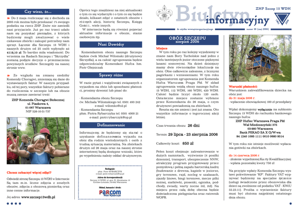 Czy wiesz, ¿e... Do 2 maja rozliczaj¹c siê z dochodu za 2005 rok mo¿na by³o przekazaæ 1% swojego podatku na rzecz ZHP. Znów nie zawiedli nasi przyjaciele. Ju¿ po raz trzeci uda³o nam siê pozyskaæ pieni¹dze, z któryc h b ê d z i e my mogli zre a l i zowaæ o wiele ciekawsze zbiórki i zakupiæ potrzebny nam sprzêt. £¹cznie dla Szczepu 13 WDH i naszych dru¿yn od 25 osób wp³ynê³o a¿ 4119,10 z³. To bardzo mi³a wiadomoœæ. Do wrzeœnia na Radach Szczepu i “Skrzyd³a” zostan¹ podjête decyzje o przeznaczeniu powy¿szych œrodków. Szczegó³y na naszej stronie www. Ze wzglêdu na zmianê siedziby Komendy Chor¹gwi, zmieniaj¹ siê dane do wystawianych faktur. W naszym przypadku, od tej pory, wszystkie faktury pobierane do rozliczenia w szczepie lub na obozie musz¹ zawsze zawieraæ treœæ: ZHP Komenda Chor¹gwi Sto³ecznej ul. Piaskowa 4, 01-067 Warszawa NIP 526-10-51-737 Oprócz tego znajdziesz na niej aktualnoœci o tym co siê wydarzy³o i o tym co siê bêdzie dzia³o, kilkaset zdjêæ z ostatnich obozów i ró ¿ nych akcji, historiê Szczepu, Ksiêgê Goœci i... wiele innych. W internecie bêd¹ siê równie¿ pojawiaæ aktualne inform a cje o obozie, stanie osobowym itp. Nasi Dowódcy Komendantem obozu naszego Szczepu bêdzie æwik Micha³ Wilomski (dru¿ynowy Skrzyd³a), a za ca³oœæ zgrupowania bêdzie odpow i e d z i a l ny Komendant Hufca hm. Piotr Olejniczak Sprawy ró¿ne W razie pytañ i w¹tpliwoœci zwi¹zanych z wyjazdem na obóz lub sposobami p³atnoœci, prosimy dzwoniæ lub pisaæ do: - Komendanta obozu Szczepu æw. Micha³a Wilomskiego tel. 0501 493 242 e-mail: [email protected] - Komendanta Szczepu phm. Piotra Rybarczyka tel. 0501 4000 21 e-mail: [email protected] Dofinansowanie Informuj e my, ¿e bêdziemy siê sta raæ o uzyskanie dofi n a n s owania wyjazdu na obóz dla rodzin wielodzietnych i osób z trudn¹ sytuacj¹ materialn¹. Na zbiórkach dru¿yn od 26 maja oraz na naszej stronie internetowej bêd¹ dostêpne wnioski, które po wype³nieniu nale¿y oddaæ dru¿ynowym. Chcesz zobaczyæ wiêcej zdjêæ? OdwiedŸ stronê Szczepu 13 WDH w Internecie S¹ tam m.in. liczne zdjêcia z zesz³ych obozów, zdjêcia z obozow¹ pionierk¹ oraz inne cenne informacje. Jej adres: www.szczep13wdh.pl Redaguje: phm Piotr RYBARCZYK e-mail: [email protected] Adres do korespondencji: Szczep 13 WDH, ul. gen. R. Abrahama 10 Goc³aw-Lotnisko, 03-982 Warszawa Sk³ad, ³amanie i druk: Biuletyn informacyjny ZHP Szczep 13 WDH do u¿ytku wewn¹trzorganizacyjnego numer 38 (maj 2006) OBÓZ SZCZEPU sierpieñ 2006 Miejsce W tym roku po raz kolejny wyjedziemy w znane nam Bory Tucholskie nad jedno z wielu tamtejszych jezior otoczone piêknymi lasami sosnowymi. Na dzieñ dzisiej s z y mamy dwie rów n o rzêdne loka l i z a cje na obóz. Obie ca³kowicie zalesione, z licznymi pagórkami i wzniesieniami. W tym roku organizatorem zgrupowania jest Komenda Hufca Wars z awa Praga P³d. W sk³ad zgrupowania wejd¹ obozy naszego hufca: 13 WDH, 112 WDH, 160 WDH, 420 WDH. Ca³oœæ bêdzie liczyæ oko³o 120 osób. Osta teczne miejsce zostanie wybra n e przez Komendanta do 26 maja, o czym dru¿ynowi powiadomi¹ na zbiórkach. Reszta siê nie zmieni i jest ju¿ znana. Oto wszystkie informacje o tegorocznej akcji letniej. Czas trwania obozu: Termin: 29 26 dni lipca - 23 sierpnia 2006 Ca³kowity koszt: 850 z³ Pe³en koszt obejmuje: zakwaterowanie w du¿ych namiotach, wy¿wienie (4 posi³ki dziennie), transport, ubezpieczenie NNW, atrakcyjny program przygotowany przez pomys³ow¹ i pe³n¹ zapa³u harcersk¹ kadrê (budowanie z drewna, k¹piele w jeziorze, gry terenowe, rajd, nocleg w sza³asach, zjazdy linowe, biegi terenowe, mecze pi³ki no¿nej, siatkówki, piosenki, ogniska, podchody, zwiady, warty nocne itd, itd). Na miejscu przez ca³¹ dobê obecna bêdzie doœwiadczona pielêgniarka oraz ratownik WOPR. Warunki p³atnoœci: Warunkiem zakwalifikowania dziecka na obóz jest: do 31 maja 2006 r. - wp³acenie obowi¹zkowej 100 z³ przedp³aty Wp³at dokonujemy wy³¹cznie na subkonto Szczepu 13 WDH do rachunku bankowego naszego hufca: ZHP Hufiec Warszawa Praga P³d Wa³ Miedzeszyñski 375 03-980 Warszawa Bank PEKAO SA X O/W-wa 94 1240 1095 1111 0010 0680 9514 W tym roku nie istnieje mo¿liwoœæ wp³acania gotówki na zbiórkach. do 14 czerwca 2006 r. - z³o¿enie wype³nionej Ka rty Kwalifikacyjnej - wp³ata pozosta³ej kwoty 750 z³ Na przyjête wp³aty Komenda Szczepu wystawi pokwitowanie "KP". Faktury VAT wypisywaæ bêdziemy na sp e cjalne ¿yc ze n i e (us³ugi œwiadczone przez obozowiska dla dzieci s¹ zwolnione od podatku VAT - KWiU 55.23.11). Proœba o wys tawienie fa k t u ry musi byæ z³o¿ona najpóŸniej ostatniego dnia obozu. Wiadomoœci o obozie dla tych co jad¹ pierwszy raz Zaraz po przyjeŸdzie na miejsce obozu i zjedzeniu pierws zego ciep³ego posi³ku ws z yscy uczestnicy rozpoczn¹ stawianie namiotów i przygotuj¹ siê do pracy. Uczestnicy i kadra mieszkaæ bêd¹ w namiotach 10-cio i 6-cio osobowych. Jeden n a m i ot “dziesi¹tka” przypada na jeden zastêp, czyli 6-7 osób. Po zakoñczeniu pionierki nast¹pi pierwszy apel i harcerze wyrusz¹ na zwiady, gry, biegi harcerskie, rajd. Wezm¹ udzia³ w turniejach kominkach, ogniskach... W czasie obozu uczestnicy pe³ni¹ s³u¿by: wartownicz¹ i kuchenn¹. W kuchni zastêp s³u¿bowy pomaga przygotowaæ posi³ki dla ca³ego zgrupowania: robi kanapki, myje i obiera warzywa, wydaje posi³ki, dba o c z ys toœæ w kuchni i na sto³ówce, myje naczynia kuchenne itp. Przez pierwsze 4-6 dni obozu - pionierkê, wszyscy harcerze i harcerki bêd¹ budowaæ swoje obozy. Postawi¹ namioty, prycze, stojaki, pó³ki i wieszaki. Przed namiotami zbuduj¹ wymyœlne stojaki na mena¿ki i totemy. W ka¿dym obozie pows tanie k¹cik p.po¿., tablica rozkazów, brama i inne elementy wystroju wykonane z "darów lasu" ¿erdzi, korzeni, ga³êzi, kory, szyszek, trawy oraz gwoŸdzi i sznurka. Od tego ile zbiorowego wysi³ku 