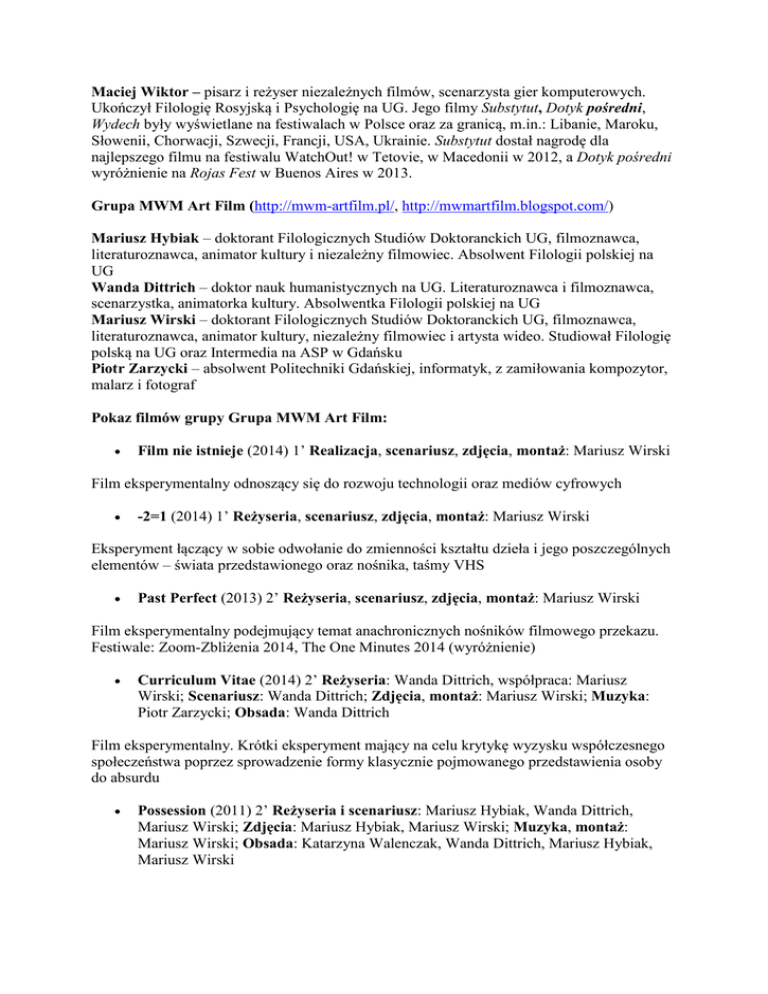 Maciej Wiktor – pisarz i reżyser niezależnych filmów, scenarzysta gier komputerowych. Ukończył Filologię Rosyjską i Psychologię na UG. Jego filmy Substytut, Dotyk pośredni, Wydech były wyświetlane na festiwalach w Polsce oraz za granicą, m.in.: Libanie, Maroku, Słowenii, Chorwacji, Szwecji, Francji, USA, Ukrainie. Substytut dostał nagrodę dla najlepszego filmu na festiwalu WatchOut! w Tetovie, w Macedonii w 2012, a Dotyk pośredni wyróżnienie na Rojas Fest w Buenos Aires w 2013. Grupa MWM Art Film (http://mwm-artfilm.pl/, http://mwmartfilm.blogspot.com/) Mariusz Hybiak – doktorant Filologicznych Studiów Doktoranckich UG, filmoznawca, literaturoznawca, animator kultury i niezależny filmowiec. Absolwent Filologii polskiej na UG Wanda Dittrich – doktor nauk humanistycznych na UG. Literaturoznawca i filmoznawca, scenarzystka, animatorka kultury. Absolwentka Filologii polskiej na UG Mariusz Wirski – doktorant Filologicznych Studiów Doktoranckich UG, filmoznawca, literaturoznawca, animator kultury, niezależny filmowiec i artysta wideo. Studiował Filologię polską na UG oraz Intermedia na ASP w Gdańsku Piotr Zarzycki – absolwent Politechniki Gdańskiej, informatyk, z zamiłowania kompozytor, malarz i fotograf Pokaz filmów grupy Grupa MWM Art Film: Film nie istnieje (2014) 1’ Realizacja, scenariusz, zdjęcia, montaż: Mariusz Wirski Film eksperymentalny odnoszący się do rozwoju technologii oraz mediów cyfrowych -2=1 (2014) 1’ Reżyseria, scenariusz, zdjęcia, montaż: Mariusz Wirski Eksperyment łączący w sobie odwołanie do zmienności kształtu dzieła i jego poszczególnych elementów – świata przedstawionego oraz nośnika, taśmy VHS Past Perfect (2013) 2’ Reżyseria, scenariusz, zdjęcia, montaż: Mariusz Wirski Film eksperymentalny podejmujący temat anachronicznych nośników filmowego przekazu. Festiwale: Zoom-Zbliżenia 2014, The One Minutes 2014 (wyróżnienie) Curriculum Vitae (2014) 2’ Reżyseria: Wanda Dittrich, współpraca: Mariusz Wirski; Scenariusz: Wanda Dittrich; Zdjęcia, montaż: Mariusz Wirski; Muzyka: Piotr Zarzycki; Obsada: Wanda Dittrich Film eksperymentalny. Krótki eksperyment mający na celu krytykę wyzysku współczesnego społeczeństwa poprzez sprowadzenie formy klasycznie pojmowanego przedstawienia osoby do absurdu Possession (2011) 2’ Reżyseria i scenariusz: Mariusz Hybiak, Wanda Dittrich, Mariusz Wirski; Zdjęcia: Mariusz Hybiak, Mariusz Wirski; Muzyka, montaż: Mariusz Wirski; Obsada: Katarzyna Walenczak, Wanda Dittrich, Mariusz Hybiak, Mariusz Wirski Interpretacja wiersza Baudelaire’a Opętanie. Młoda dziewczyna znajdując się w lesie odczuwa niezwykłą więź z przyrodą Passerby (2012) 1’ Realizacja, scenariusz, zdjęcia, montaż: Mariusz Wirski Dokument będący próbą ekranizacji zjawiska postpamięci. Festiwale: ZOOM-Zbliżenia 2013, The One Minutes 2012 (wyróżnienie), Euroshorts 2013 Proces (2013) 5’ Reżyseria, zdjęcia, montaż: Mariusz Wirski; Scenariusz: Wanda Dittrich; Muzyka: Piotr Zarzycki Animacja poklatkowa. Mężczyzna budzi się w sali sądowej, w której dochodzi do rozprawy nad jego życiem… Ostatni seans (2014) 2’ Reżyseria, montaż: Mariusz Wirski; Scenariusz, zdjęcia: Wanda Dittrich, Mariusz Wirski; Muzyka: Piotr Zarzycki; Obsada: Mariusz Wirski Mężczyzna ogląda film na starym projektorze. Ekranowa rzeczywistość okazuje się dla niego bardziej realna niż otaczający świat Performance (2011) 2’ Reżyseria: Mariusz Wirski, współpraca: Wanda Dittrich, Mariusz Hybiak; Scenariusz i zdjęcia: Wanda Dittrich, Mariusz Wirski; Montaż: Mariusz Wirski; Muzyka: Piotr Zarzycki; Obsada: Mariusz Hybiak Młody mężczyzna przygotowuje się do ważnego wydarzenia w swoim życiu… Festiwale: European Media Art Festival 2012, Cologne One Minute Film Festival 2012; KAN 2012; Museo ExTeresa Arte Actual (Meksyk); The 8 th Annual Carnival of e-Creativity 2013 (Indie); 37. Gdynia Film Festival 2012; InOut 2012; The One Minutes 2012.