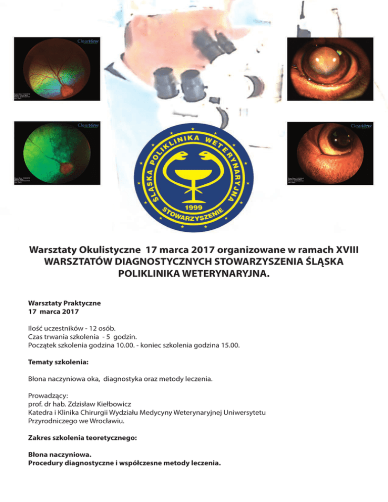 Warsztaty Okulistyczne 17 marca 2017 organizowane w ramach XVIII WARSZTATÓW DIAGNOSTYCZNYCH STOWARZYSZENIA ŚLĄSKA POLIKLINIKA WETERYNARYJNA. Warsztaty Praktyczne 17 marca 2017 Ilość uczestników - 12 osób. Czas trwania szkolenia - 5 godzin. Początek szkolenia godzina 10.00. - koniec szkolenia godzina 15.00. Tematy szkolenia: Błona naczyniowa oka, diagnostyka oraz metody leczenia. Prowadzący: prof. dr hab. Zdzisław Kiełbowicz Katedra i Klinika Chirurgii Wydziału Medycyny Weterynaryjnej Uniwersytetu Przyrodniczego we Wrocławiu. Zakres szkolenia teoretycznego: Błona naczyniowa. Procedury diagnostyczne i współczesne metody leczenia. Anatomia i fizjologia błony naczyniowej. - tęczówka, - ciało rzęskowe, - naczyniówka i jej rola w utrzymywaniu bariery krew-oko. Reakcje patologiczne warstwy naczyniowej oka z uwzględnieniem stanów zapalnych oraz powikłań immunologicznych. - zapalenie bony naczyniowej (uveitis), - zapalenie tęczówki (iritis), - zapalenie ciała rzęskowego (cyclitis), - zapalenie przedniej części naczyniówki - zapalenie tęczówki i zapalenie ciała rzęskowego (anterior uveitis, irydocyclitis), - zapalenie tylnej części naczyniówki (posterior uveitis, chorioiditis ), - zapalenie tylnej części naczyniówki i siatkówki z pierwotnym ogniskiem w siatkówce (retinochoroiditis), - zapalenie całości błony naczyniowej (panuveitis), - błona naczyniowa jako tkanka kompetentna immunologiczne, - choroby autoimmunologiczne, - ostre zapalenie błony naczyniowej, - przewlekłe zapalenie błony naczyniowej, - zapalenie tęczówki i ciała rzęskowego spowodowane antygenem soczewkowym (uveitis phacoanaphilactica), - inne patologie naczyniówki ( torbiele, nowotwory etc.). Przyczyny zapalenia błony naczyniowej u psów i kotów. - wrzód rogówki w aspekcie zapalnie błony naczyniowej, - urazy prowadzące do zapalnie błony naczyniowej, - infekcje wirusowe, bakteryjne, grzybice układowe, parazytozy, Mycoplasma, - zapalnie błony naczyniowej tła immunologicznego, - nadciśnienie tętnicze jako przyczyna zapalenie błony naczyniowej, - LIU uveitt (lens inducted uveit), - zabiegi operacyjne na gałce ocznej, a zapalenie błony naczyniowej, - jatrogenne zapalenie błony naczyniowej, - zapalenie błony naczyniowej w aspekcie farmakoterapii innych schorzeń. Wady wrodzone błony naczyniowej oraz zaburzenia pigmentacji. Nieprawidłowości źrenicy i tęczówki; - przemieszczenie źrenicy (corectopia), - niesymetryczne rozmieszczenie źrenic, - więcej niż jedna źrenica (polikoria), - szczelina (coloboma) , - brak tęczówki (aniridia), - ubytek części tęczówki, - hipoplazja tęczówki, - zaburzenia pigmentacji tęczówki ; heterochromia, znamię, zespół Waardenburga, albinizm. - przetrwała błona źreniczna PPM. Torbiele i nowotwory błony naczyniowej. - torbiele, pierwotne i wtórne guzy nowotworowe. Diagnostyka zapalenia błony naczyniowej. - badanie kliniczne, - efekt Tyndalla, pomiar ciśnienia śródgałkowego IOP - Następstwa zapalnia błony naczyniowej. -jaskra, -zaćma, obwodowe zrosty przednie oraz tylne, - odwarstwienie oraz zanik siatkówki. - Urazowe zapalenia błony naczyniowej. - perforujące rany rogówki, -krwistek. Terapia farmakologiczna chorób błony naczyniowej. - ogólne zasady terapeutyczne, - kortykosteroidy, niesteroidowe leki przeciwzapalne, - leki immunosupresyjne. - II część praktyczna A - Badanie przedniej części oka. - biomikroskopia stereoskopowa z wykorzystaniem lampy szczelinowej. C - Badanie dna oka oftalmoskopia bezpośrednia i pośrednia w praktyce weterynaryjnej z prezentacją kliniczną. - oftalmoskop bezpośredni, - oftalmoskop pośredni jednooczny ( Panoptic), - oftalmoskop pośredni obuoczny ( Heine), - asferyczne lupy oftalmologiczne, - cyfrowa kamera dna oka Clear View, - analogowa funduscamera (Nidek), - rejestracja obrazu siatkówki Welch Allyn iExaminer Pan Optic iPhone. D - wybrane zabiegi na tęczówce stosowane w praktyce weterynaryjnej. - irydektomia w przypadku perforujących ran rogówki z uszkodzeniem tęczówki, - irydocyclectomia w przypadku chorób nowotworowych, - sfinkterotomia w przy braku odpowiedniego rozszerzenia źrenicy w przypadku ekstrakcji zwichniętej w kierunku tylnym soczewki. Zajęcia praktyczne na spreparowanych świńskich gałkach ocznych prowadzone na stanowisku wyposażonym w okulistyczny mikroskop operacyjny. E - Mariusz Michalski Kruuse Polska Sp. z o.o - www.kruuse.com/pl prezentacja cyfrowej kamery Clearview do badania dna oka zapewniającej dokładne badanie oraz archiwizację, drukowanie i przesyłanie pozyskanych obrazów bezpośrednio na komputerze za pomocą USB. Wysoka rozdzielczość obrazu i cyfrowy zapis w czasie rzeczywistym obrazu siatkówki. Dodatkowy zestaw optyczny z regulowanym natężeniem światła do robienia zdjęć rogówki. Ilość miejsc ograniczona: 12 osób. Miejsce szkolenia: Gabinet Weterynaryjny 40-144 Katowice ul. Józefowska 40B. www.klinwetsilesiacenter.pl Z uwagi na wysokospecjalistyczny charakter zajęć w celu uczestnictwa niezbędne wcześniejsze zgłoszenie: dr n. wet. Marek Kostrzewski, kom. 501 955 017, [email protected] Wyposażenie techniczne dzięki zaangażowaniu firm medycznych: Kruuse Polska Sp. z o.o - www.kruuse.com/pl Seliga Microscopes Sp. z o.o. - www.seliga.pl Abj-Vision sp. z o.o. - www.abj-vision.pl